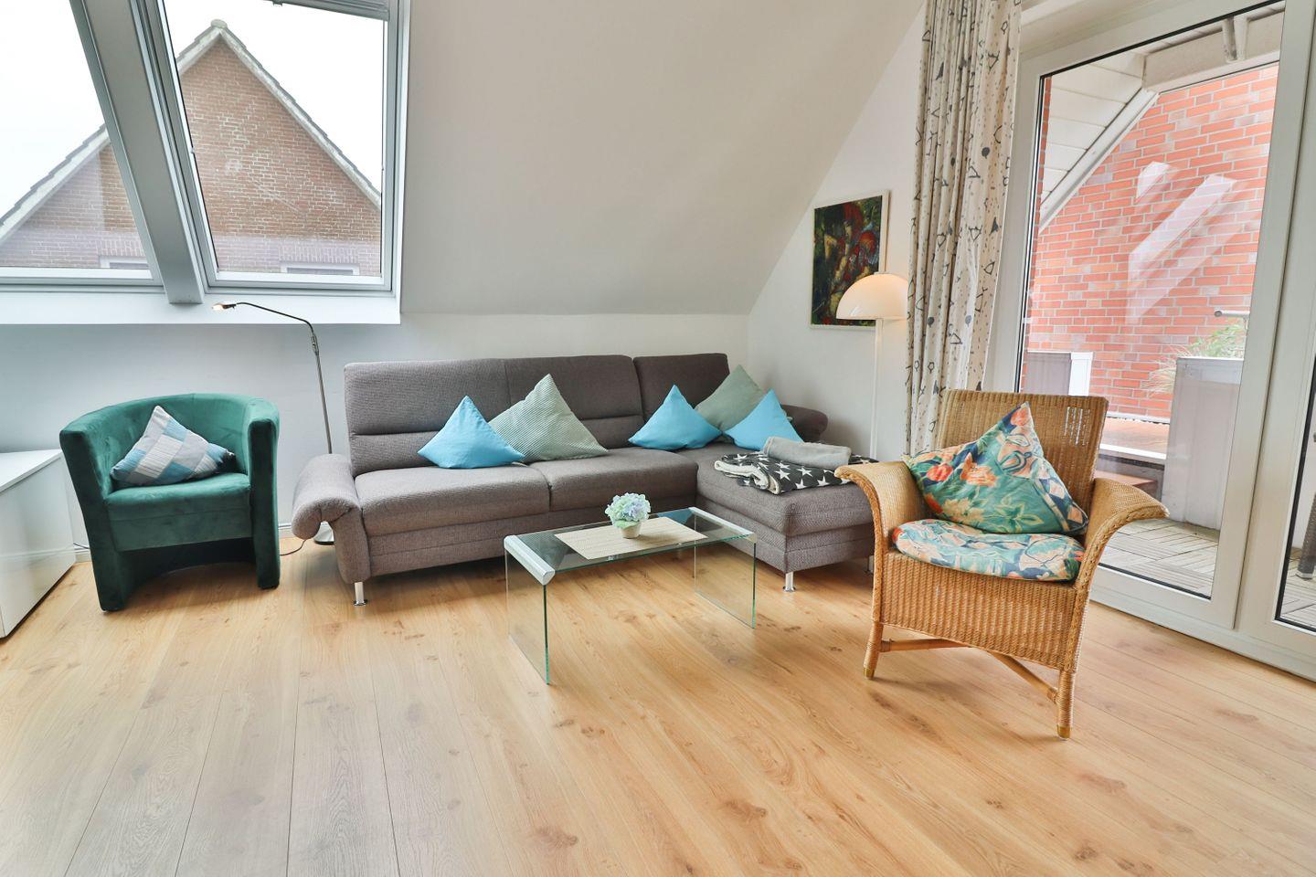 Der zum Teil überdachte Balkon ist mit Gartenmöbeln und Sonnenliegen ausgestattet und bietet Ihnen die Möglichkeit, die frische Nordseeluft zu genießen – unabhängig vom Wetter. Ob Sie morgens in Ruhe frühstücken oder abends entspannen möchten, der Balkon ist ein Rückzugsort im Freien.