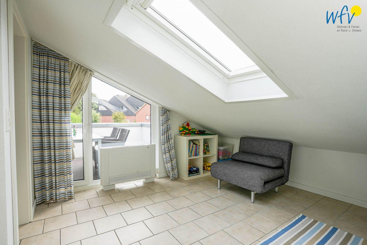 Nach der Fahrradtour oder dem Strandtag lädt das helle Wohn-/Esszimmer zum Entspannen ein. Es ist ausgestattet mit einer freundlichen Essecke im Landhausstil sowie einer bequemen Sitzecke mit TV, DVD-Player (DVD`s) und HiFi-Anlage (CD´s). Für die gemütliche Urlaubslektüre oder gesellige Spieleabende stehen einige Bücher und Spiele bereit. Warme Sonnenstrahlen genießen Sie auf dem großen Südbalkon, der sich an das Wohnzimmer anschließt. Perfekt für erholsame Stunden an der wohltuenden Nordseeluft!