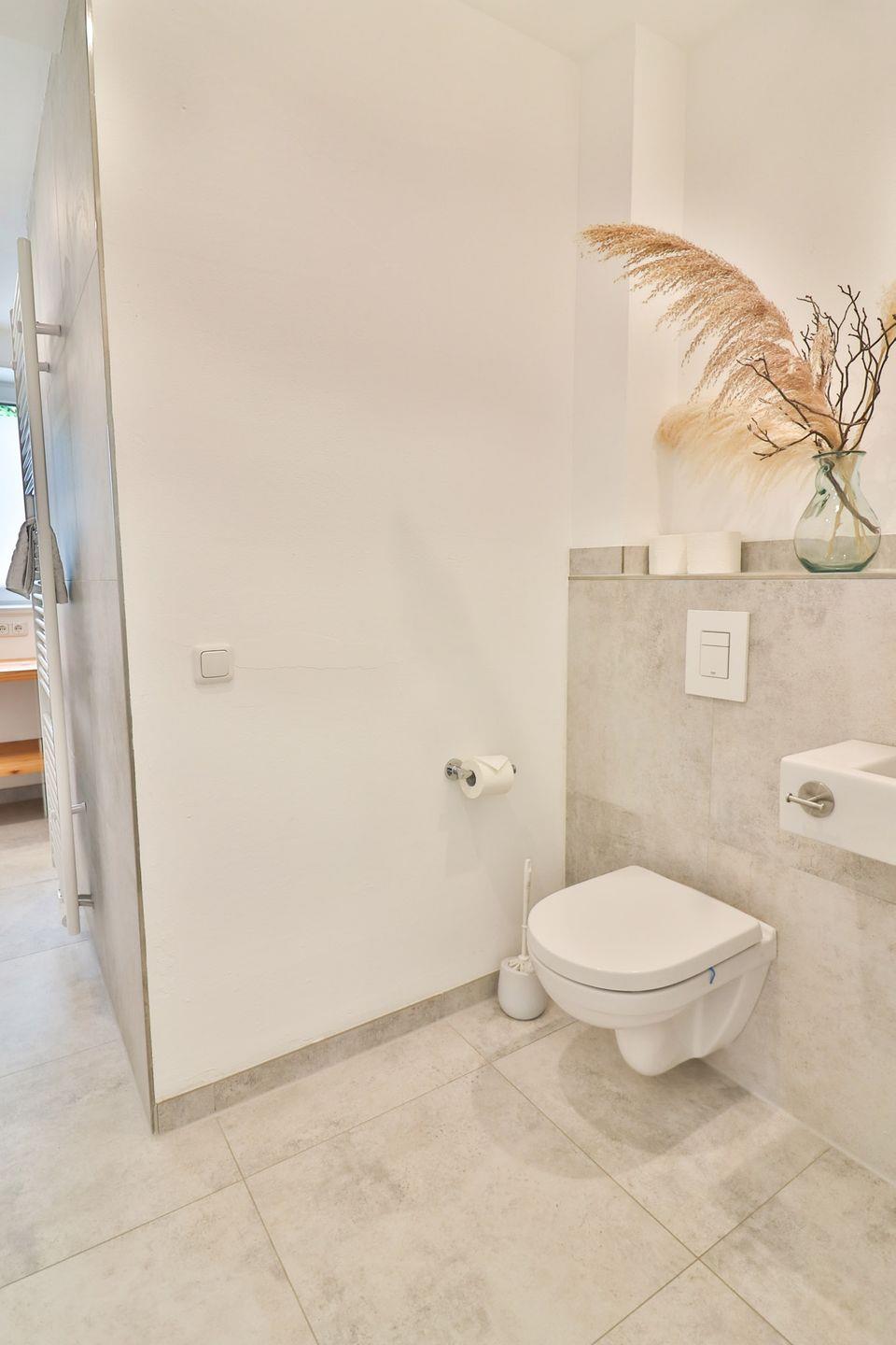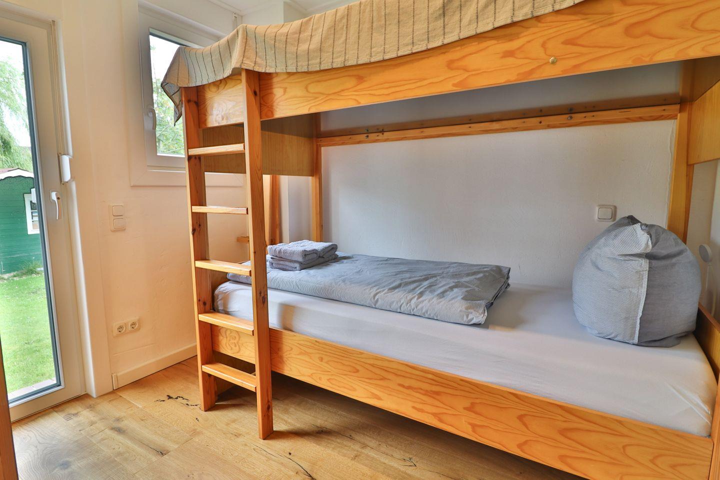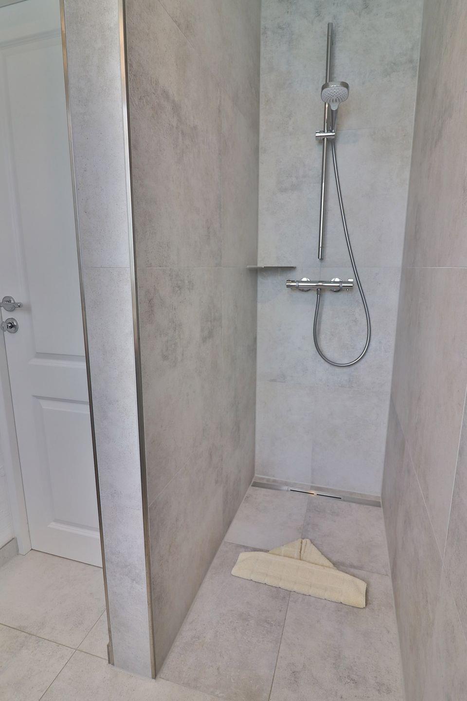 Drei geschmackvoll eingerichtete Schlafzimmer sorgen für erholsame Nächte: Ein Zimmer verfügt über ein Doppelbett (ca. 180 x 200 cm), ein weiteres über zwei Einzelbetten (je 90 x 200 cm) und ein drittes über ein Etagenbett für Kinder (je 90 x 200 cm). Alle Schlafzimmer sind mit Kleiderschränken ausgestattet und verfügen über Außenrollos, die für angenehme Dunkelheit und Privatsphäre sorgen. Zwei moderne Badezimmer, jeweils mit bodengleicher, offener Dusche, Waschbecken und WC, bieten zusätzlichen Komfort und ausreichend Platz für alle Gäste.