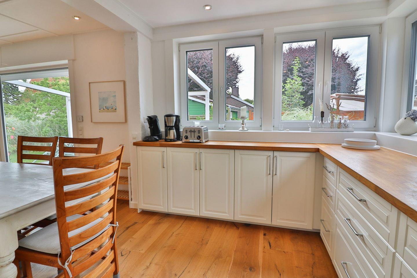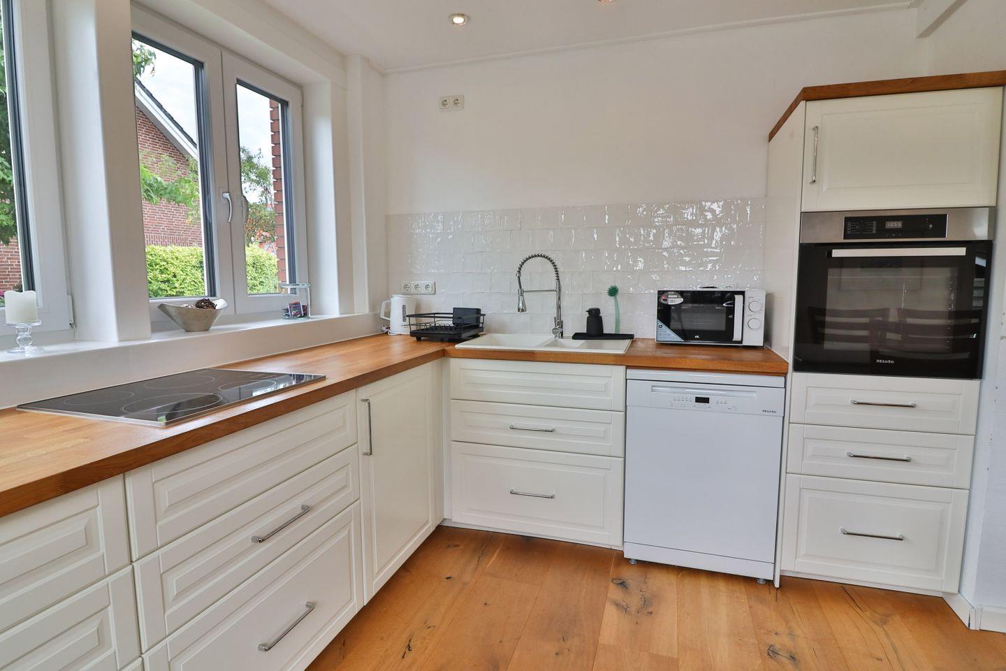 Der großzügige Wohnbereich ist das Herzstück der Wohnung: Ein großes, gemütliches Sofa lädt zum Entspannen ein, während ein Fernseher und Gesellschaftsspiele für Unterhaltung sorgen. Die Wohnung verfügt über WLAN, sodass Sie immer gut vernetzt sind. Direkt angrenzend an den Wohnbereich befindet sich die offene Küche im Landhausstil mit einem großen Essbereich. Die Küche ist voll ausgestattet und lässt keine Wünsche offen – mit Ceranfeld, Backofen auf angenehmer Arbeitshöhe, Mikrowelle, Spülmaschine, Kühl- und Gefrierschrank, Kaffeemaschine, Senseo-Padmaschine, Toaster, Wasserkocher und vielen weiteren nützlichen Küchenutensilien.