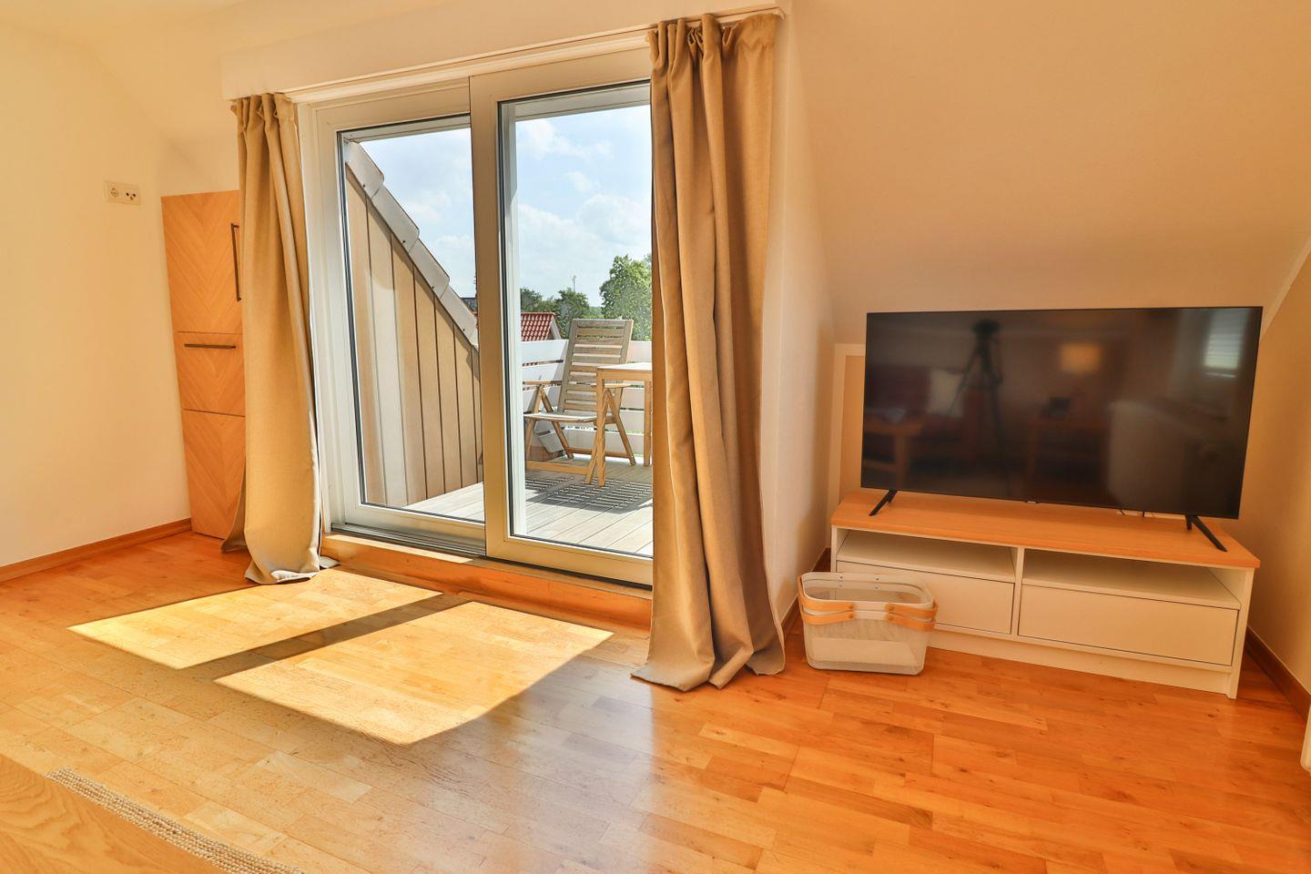 Das Wohnzimmer empfängt Sie mit einem bequemen Sofa, einem Fernseher und direktem Zugang zum kleinen Balkon, der in südlicher Richtung liegt. Hier genießen Sie Sonne und frische Nordseeluft – ideal zum Frühstücken, Lesen oder einfach zum Seele-baumeln-Lassen. Der Blick über die Dächer der Insel verleiht dem „Utkiek“ seinen ganz besonderen Reiz.