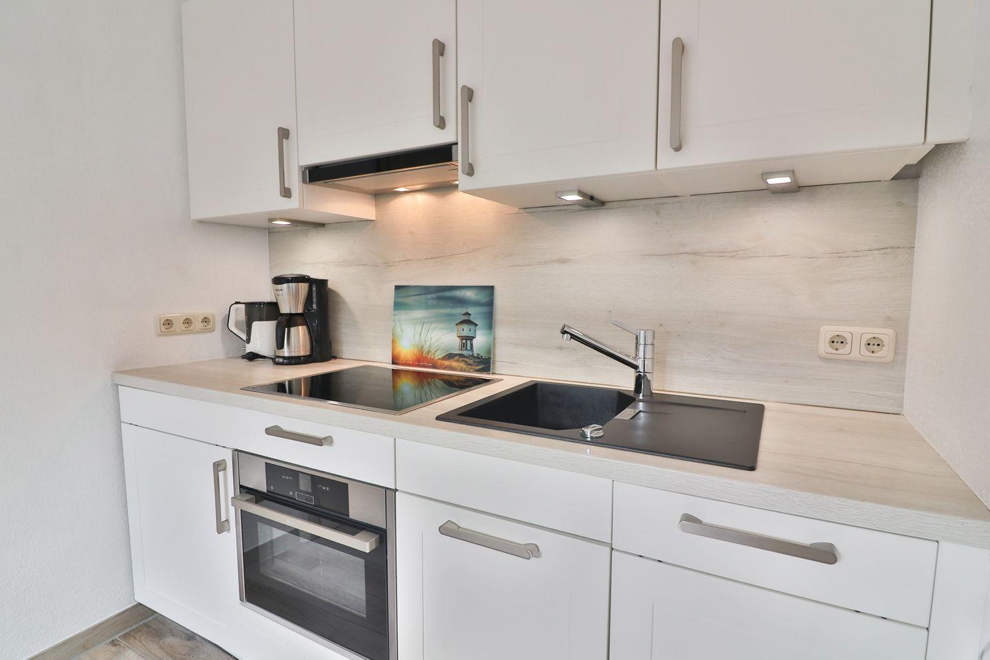 Die moderne Küchenzeile ist umfassend ausgestattet. Sie verfügt über einen Kühlschrank mit integriertem Gefrierfach, eine Spülmaschine, einen Herd mit vier Kochplatten und ein Kombigerät aus Backofen und Mikrowelle. Toaster, Wasserkocher und Kaffeemaschine sind ebenso vorhanden. Geschirr, Besteck, Töpfe, Küchenutensilien und Geschirrhandtücher werden bereitgestellt, sodass Sie jederzeit für Ihr leibliches Wohl sorgen können.