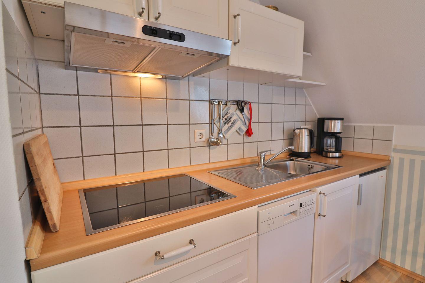 Die geschlossene Küche mit Esstisch bietet ideale Bedingungen für gemeinsames Kochen und Essen. Die Küchenausstattung, zu der ein 4-Platten-Herd, Spülmaschine, Kühlschrank mit Gefrierfach, Mikrowelle, Kaffeemaschine, Toaster, Wasserkocher und ein Handrührgerät gehören, ermöglicht Ihnen die Zubereitung leckerer Mahlzeiten. Sämtliche Küchenutensilien, Geschirr, Besteck sowie Geschirrhandtücher sind vorhanden.