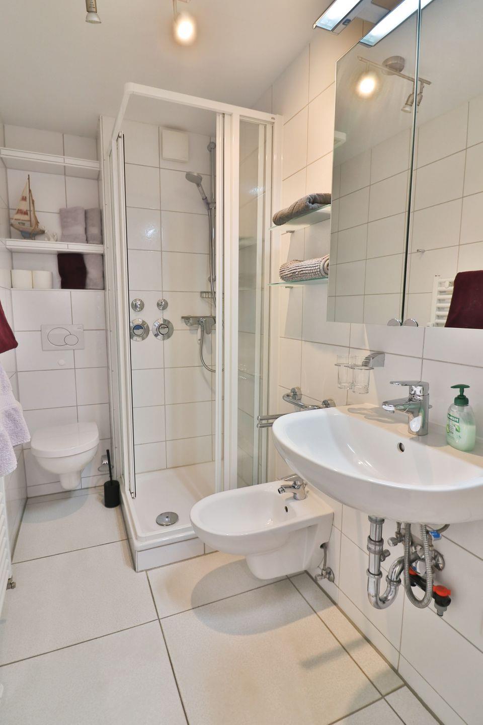 Das moderne Badezimmer bietet eine Dusche, WC, Waschbecken, Bidet, Kosmetikspiegel und Haartrockner. Erwähnenswert sind zudem der gemeinschaftliche Zugang zu Waschmaschine und Trockner, die per Münzgerät genutzt werden und längere Aufenthalte erleichtert werden können.