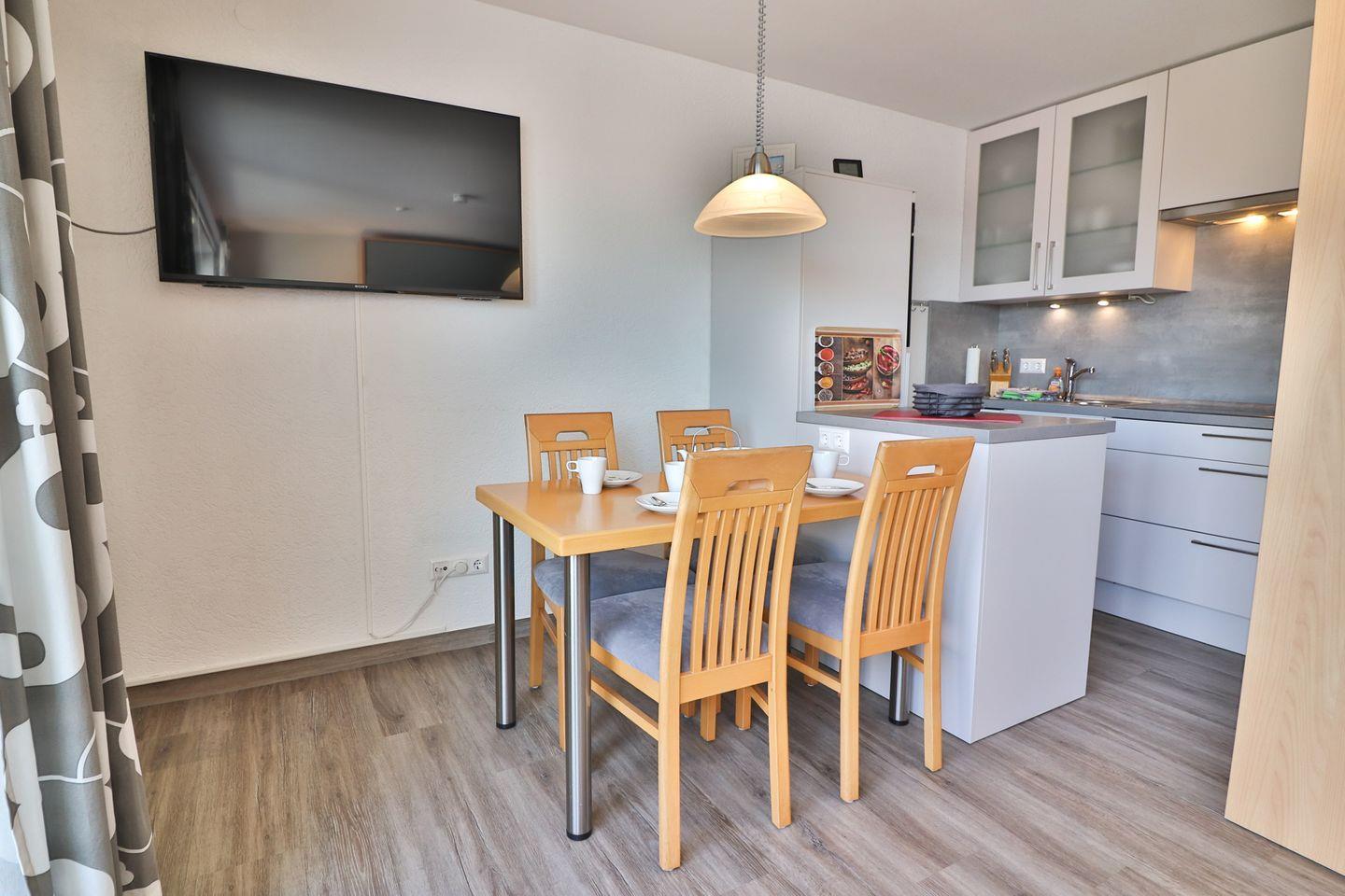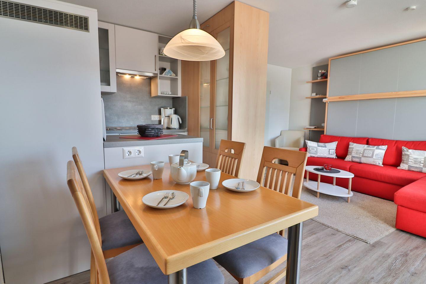 Das Ein-Raum-Apartment verfügt über Sichtschutz an allen Fenstern, sodass für einen ruhigen Schlaf und Privatsphäre gesorgt ist. Jeder Winkel wird hier optimal genutzt. Basis für den kompakten Wohn-Schlafbereich ist ein gemütliches Sofa und das separate Bettelement. Das Schrankbett öffnet sich über dem Sofa und hat eine hochwertige Matratze/Lattenrost in der Größe von 160 x 195 cm. Ein Sessel sowie TV, eine HiFi-Anlage und ein Radio runden die Ausstattung ab und laden dazu ein, nach einem aktiven Tag auf der Insel zu entspannen. Zusätzlich stehen Ihnen Bücher und Spiele zur Verfügung, um auch an regnerischen Tagen für Unterhaltung zu sorgen.