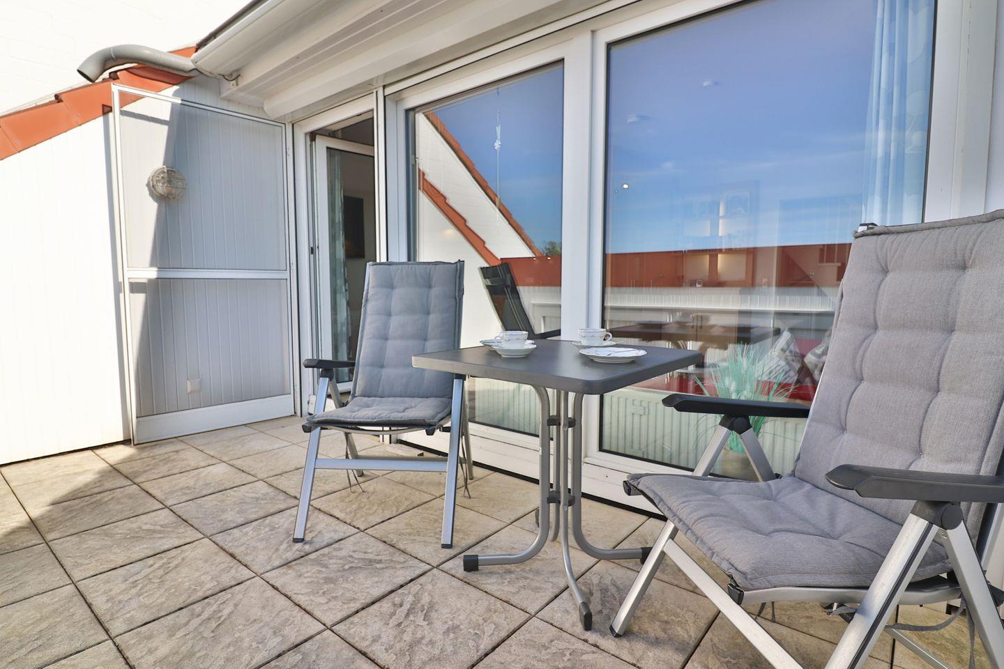 Ein besonderes Highlight ist der uneinsehbare Balkon, der durch eine Markise angenehm beschattet werden kann. Hier sind Sie ganz für sich und haben die Möglichkeit, Ihren Tag im Freien zu beginnen oder bei einem Getränk ausklingen zu lassen – unabhängig vom Wetter. Der Essbereich mit Esstisch befindet sich ebenfalls im Wohnraum, ideal für ein gemeinsames Frühstück oder ein gemütliches Abendessen.