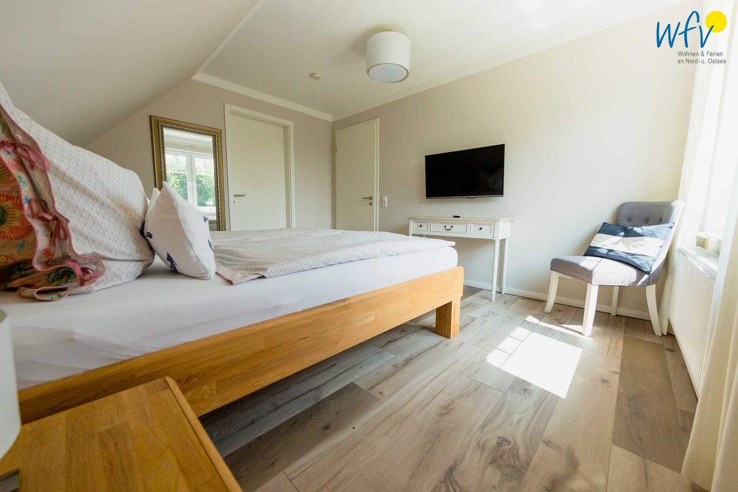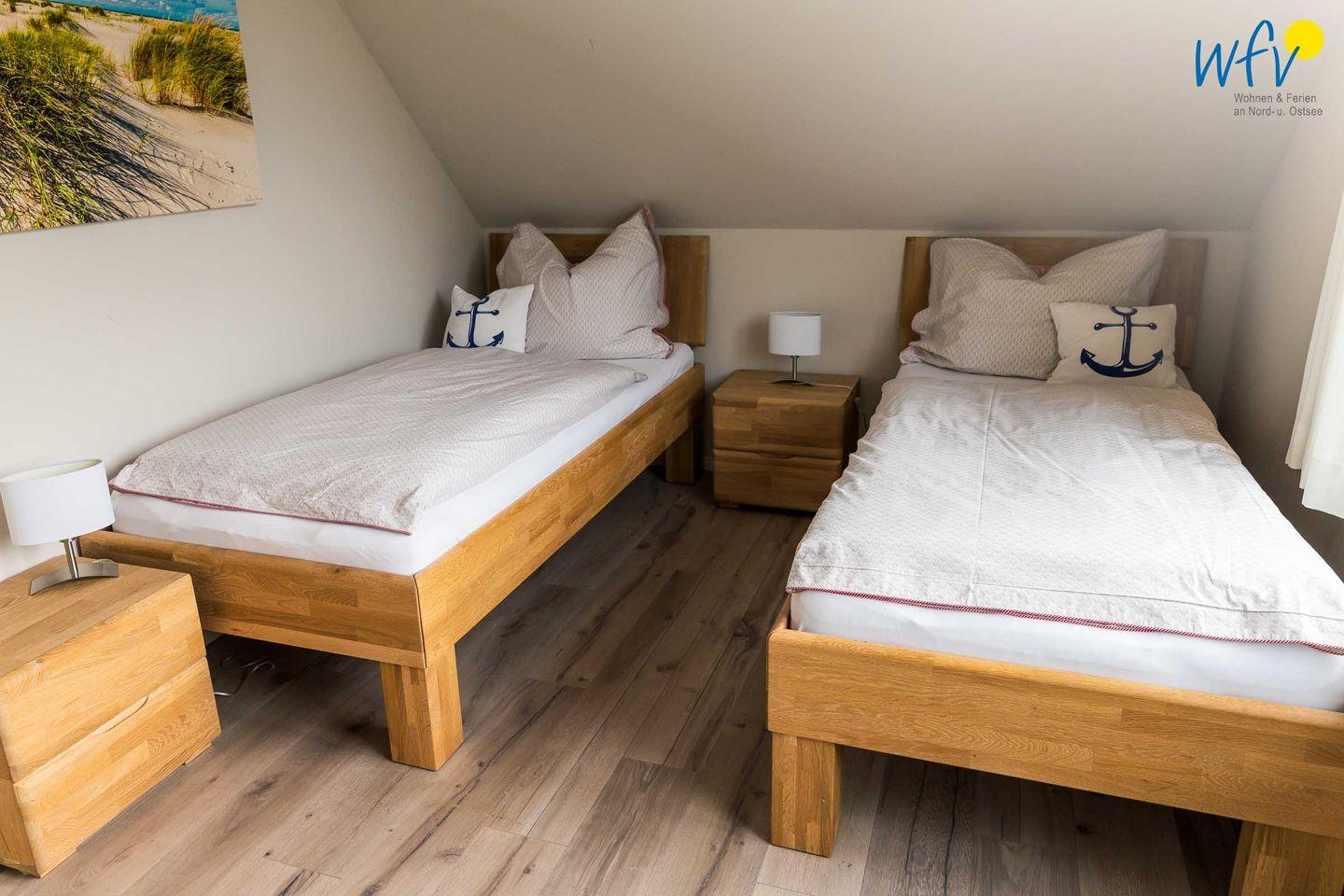 Das zweite Schlafzimmer ist ebenfalls in einem charmanten sand-beige gehalten und befindet sich auf der Südseite zum eigenen Garten hin. Zwei große Einzelbetten (90 cm x 200 cm) aus Eichenholz verfügen über eine Komforthöhe, die ebenfalls für einen angenehmen Ein- und Ausstieg sorgt. Ein großer Kleiderschrank bietet genügend Platz für Ihre Urlaubsgarderobe. Sollte der Wunsch nach einer kompletten Verdunklung vorhanden sein, sorgen in beiden Räumen Rollladen für eine gute Nachtruhe. Ein Smart-TV, eine Konsole mit Stuhl sowie ein Ganzkörperspiegel ergänzen den Komfort der Schlafzimmer jeweils.