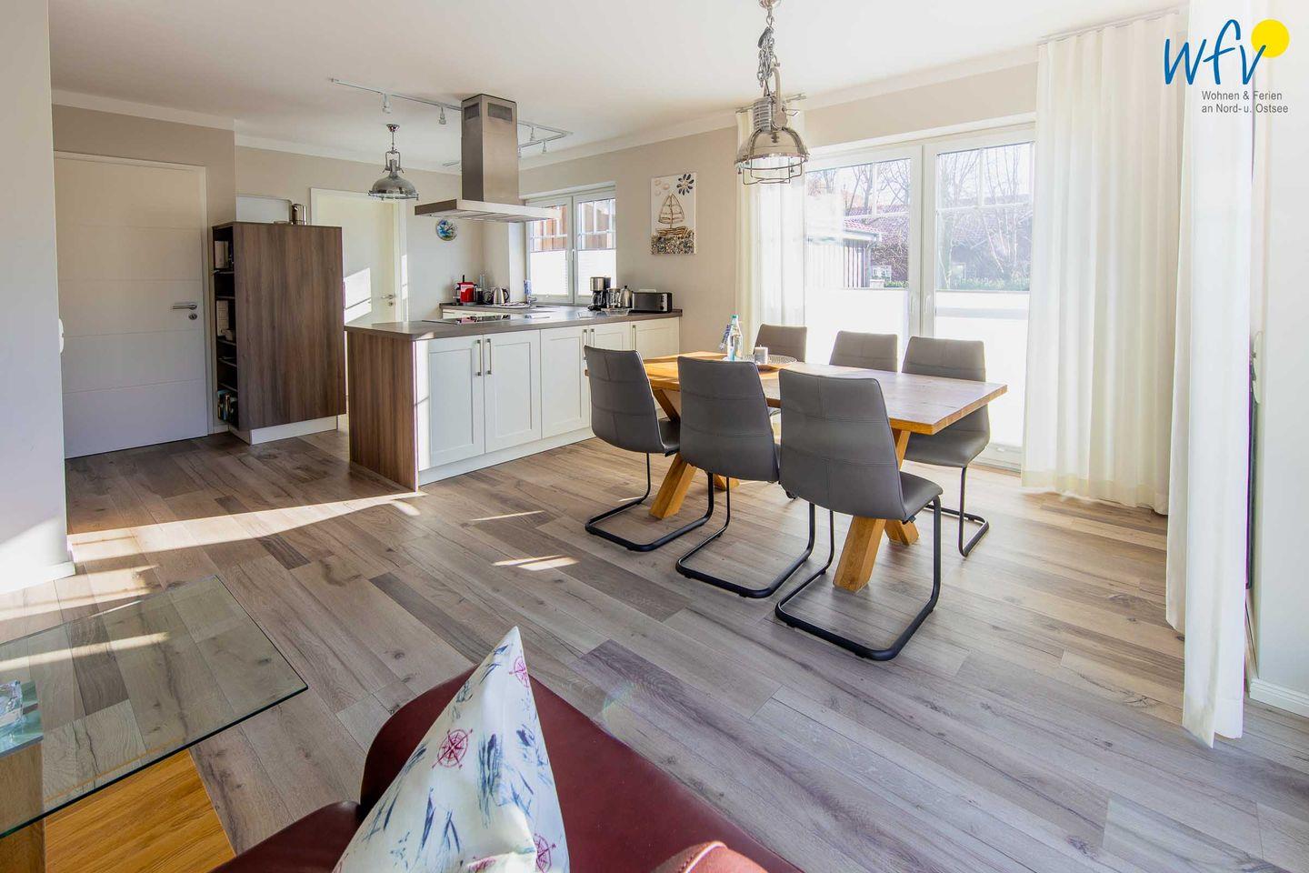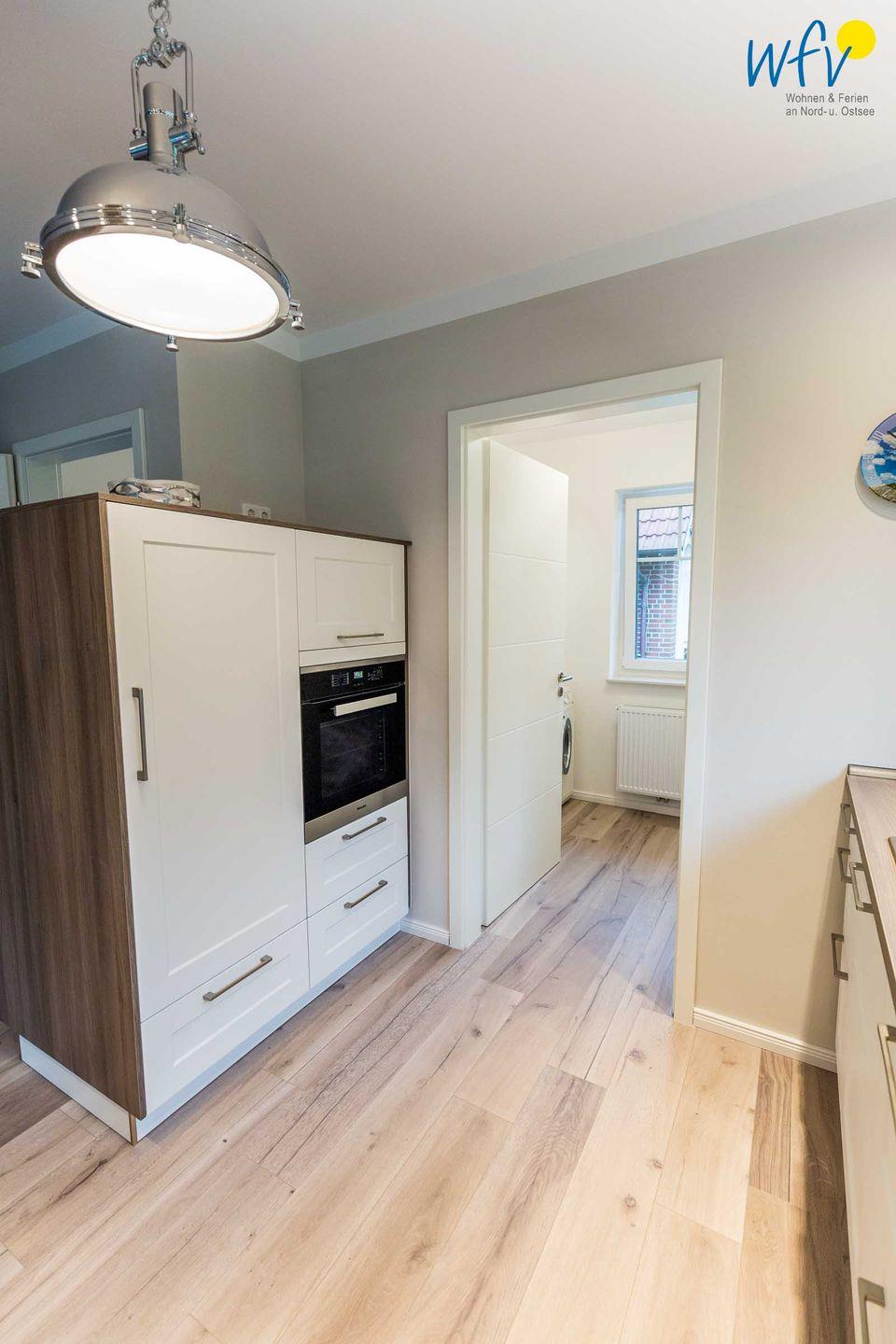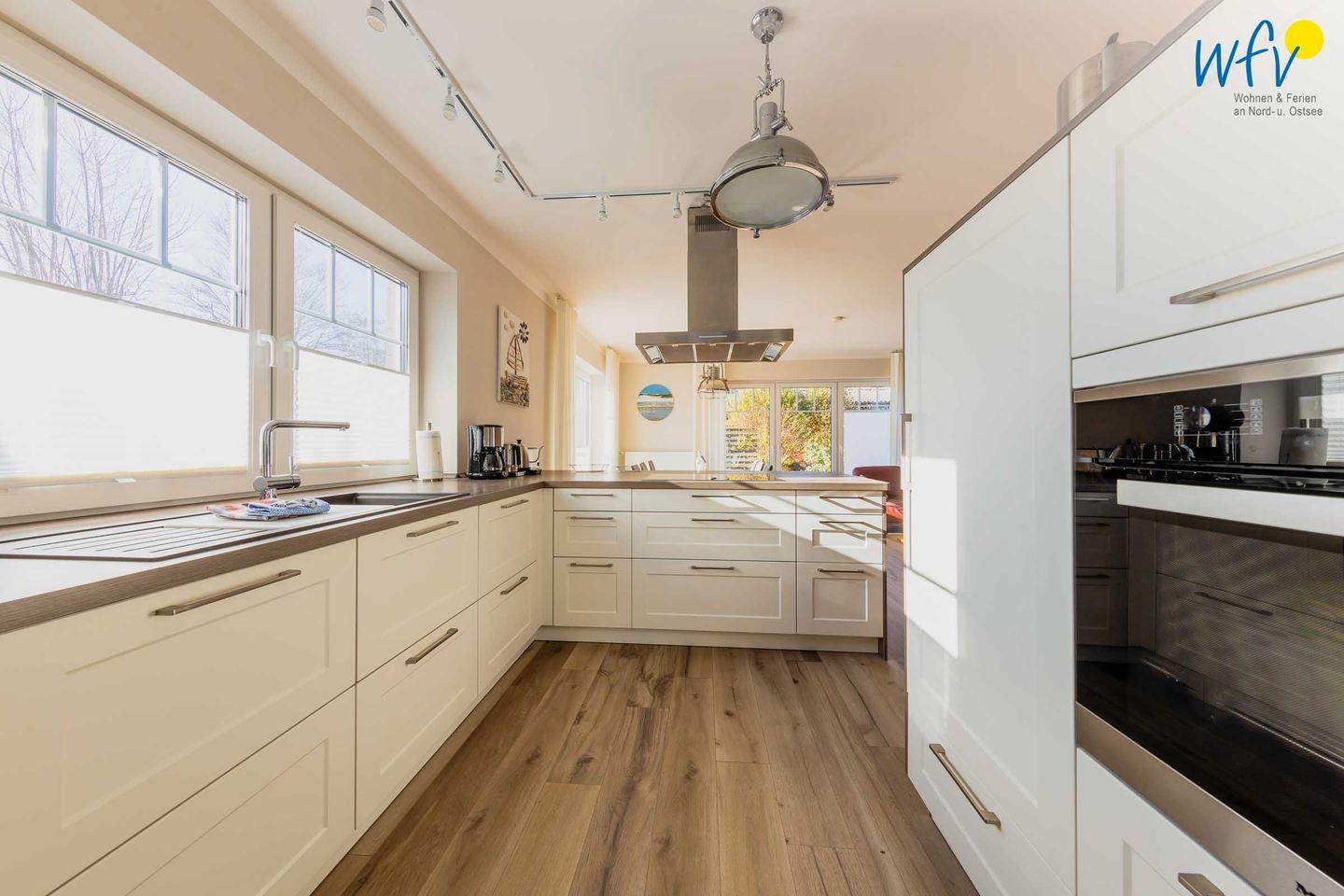 Oder Sie finden Ihren Lieblingsplatz in der offenen modernen Küche mit Küchenzeile, Kochinsel und schönem Blick in die Umgebung - ein herrlicher Platz zum gemeinsamen Kochen und Klönen! Mit den hochwertigen Elektro- und Kleingeräten wie Mikrowelle, Ceranherd, Backofen, Kaffeemaschine, Wasserkocher und Toaster lassen sich schnell und einfach leckere Gerichte zaubern oder Snacks für den Ausflug zubereiten. Die Spülmaschine übernimmt den Abwasch für Sie.