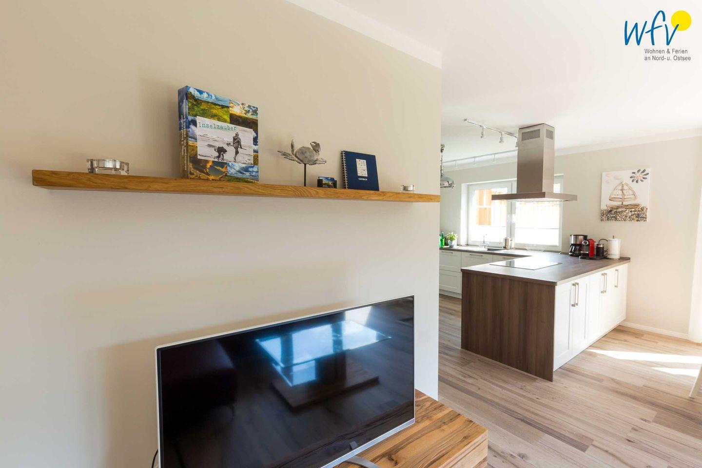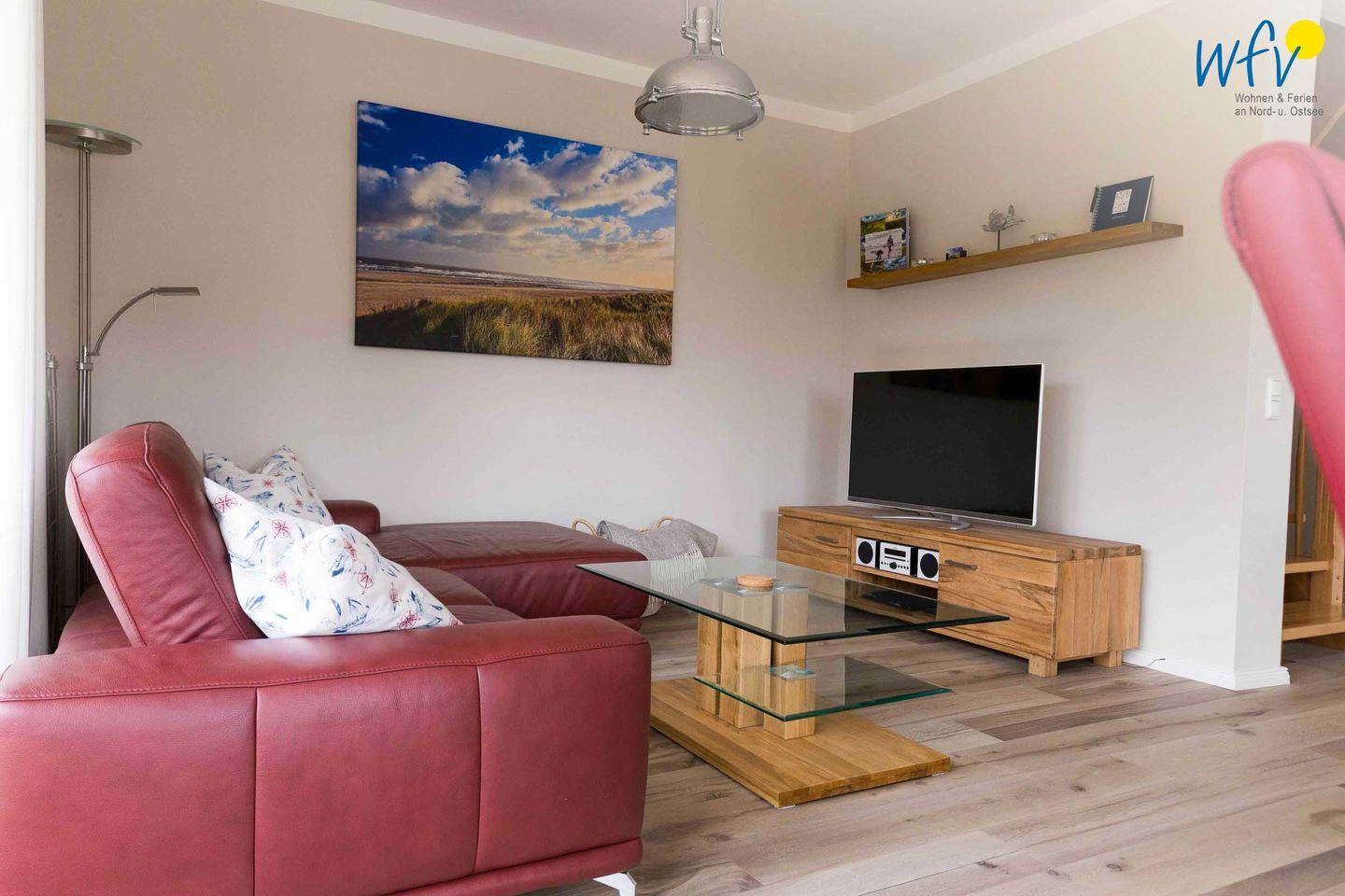 Der helle, großzügige Wohn/Essbereich ist wie das gesamte Haus in einem charmanten sand-beige gehalten. Eigene Bilder der Insel bringen Ihnen das Nordseeflair direkt ins Haus. An einem großen Eiche Echtholztisch mit 6 bequemen Stühlen können Sie nach dem Strandtag oder der Fahrradtour gemütlich beisammen sitzen und Ihre Mahlzeiten genießen. Die große Echtleder Couch bietet Ihnen auch bei nicht so gutem Wetter genügend Platz zum Entspannen. Ein modernes TV, eine Micro HiFi-Anlage, 4KUpscale Blu-ray Disc, DVDs, verschiedene Bücher und Gesellschaftsspiele sowie Kinderspiel- und Malsachen sorgen für abwechslungsreiche Unterhaltung.