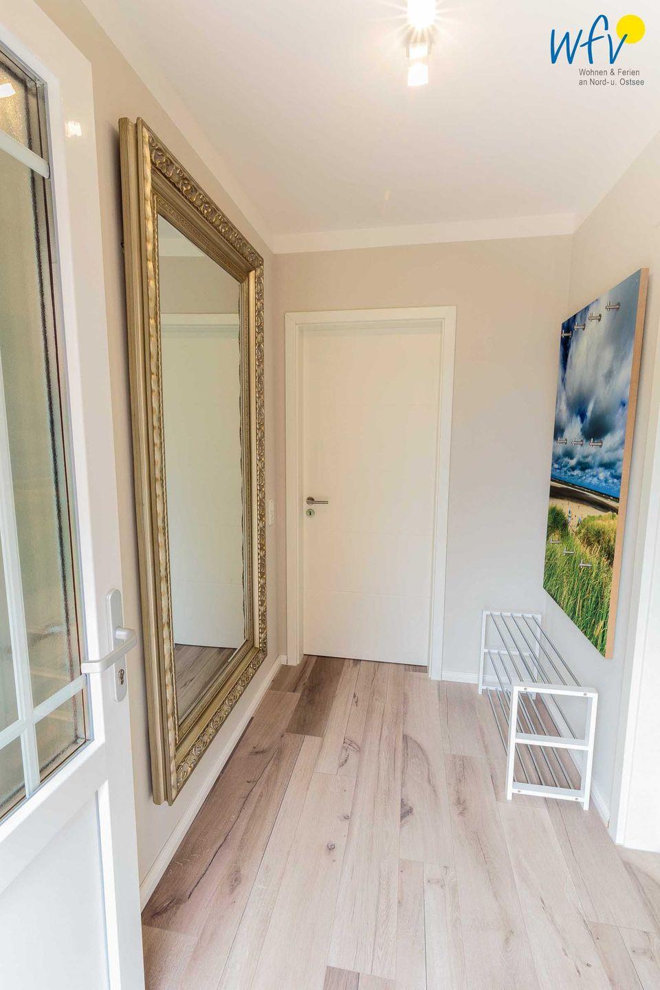Sie betreten unsere Ferienwohnung durch einen eigenen Flur/Eingang. Der helle Flur bietet Ihnen eine Garderobe, einen großen Ganzkörperspiegel sowie ein Schuhregal.