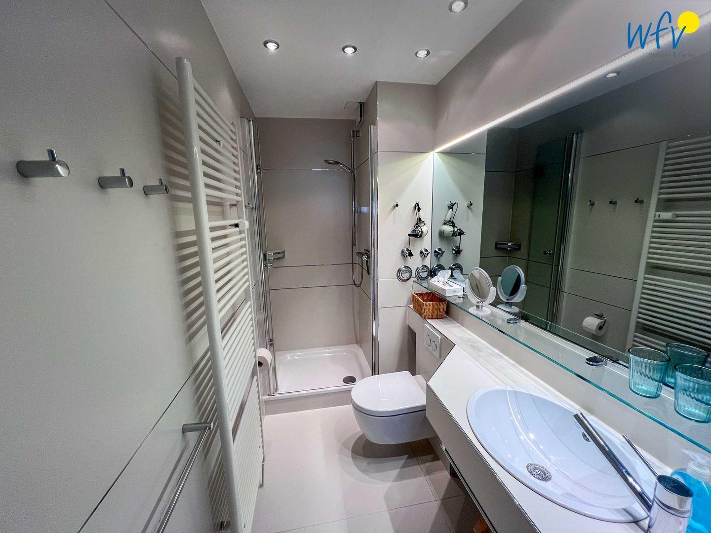 Für zusätzlichen Wohnkomfort sorgt das elegante Badezimmer mit Dusche, breitem Waschtisch, großem Spiegel sowie Kosmetikspiegel, Föhn und Handtuchheizung.