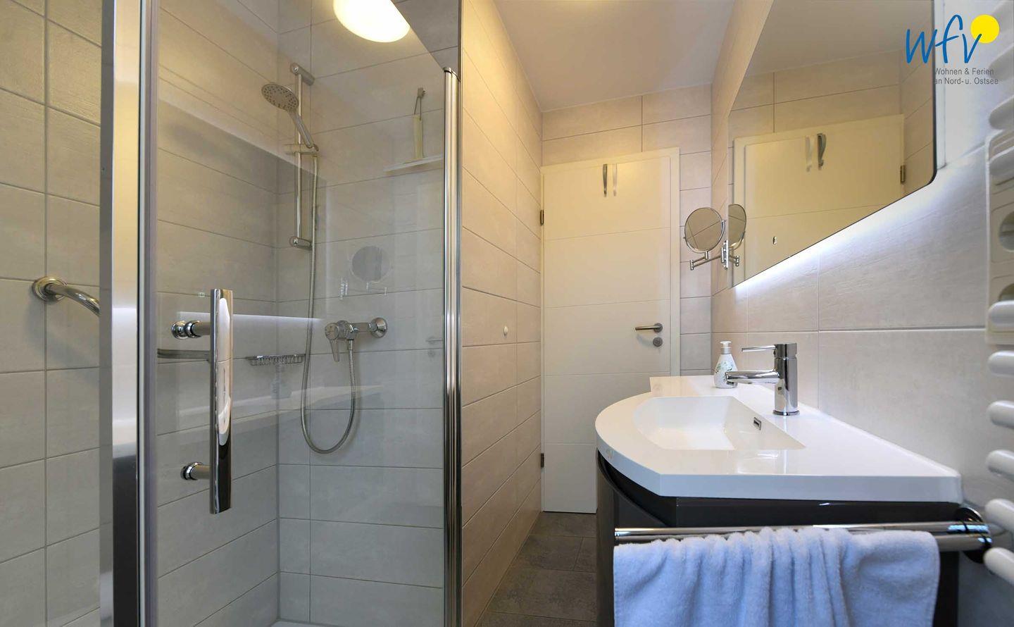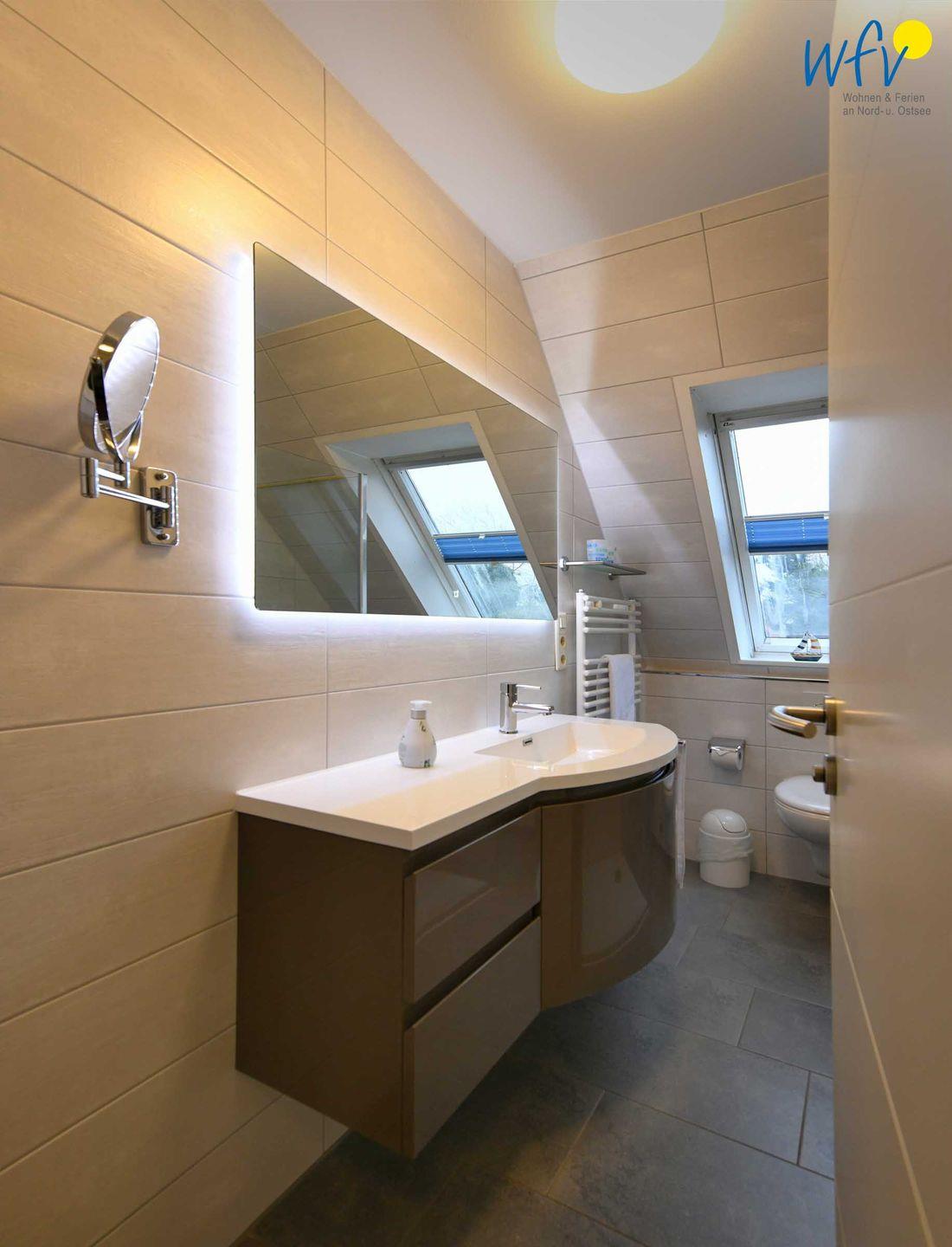 Weiterer Wohnkomfort erwartet Sie in dem eleganten Tageslichtbad mit ebenerdiger Dusche, breitem Waschtisch, Spiegel und Kosmetikspiegel sowie Handtuchheizung und Föhn.