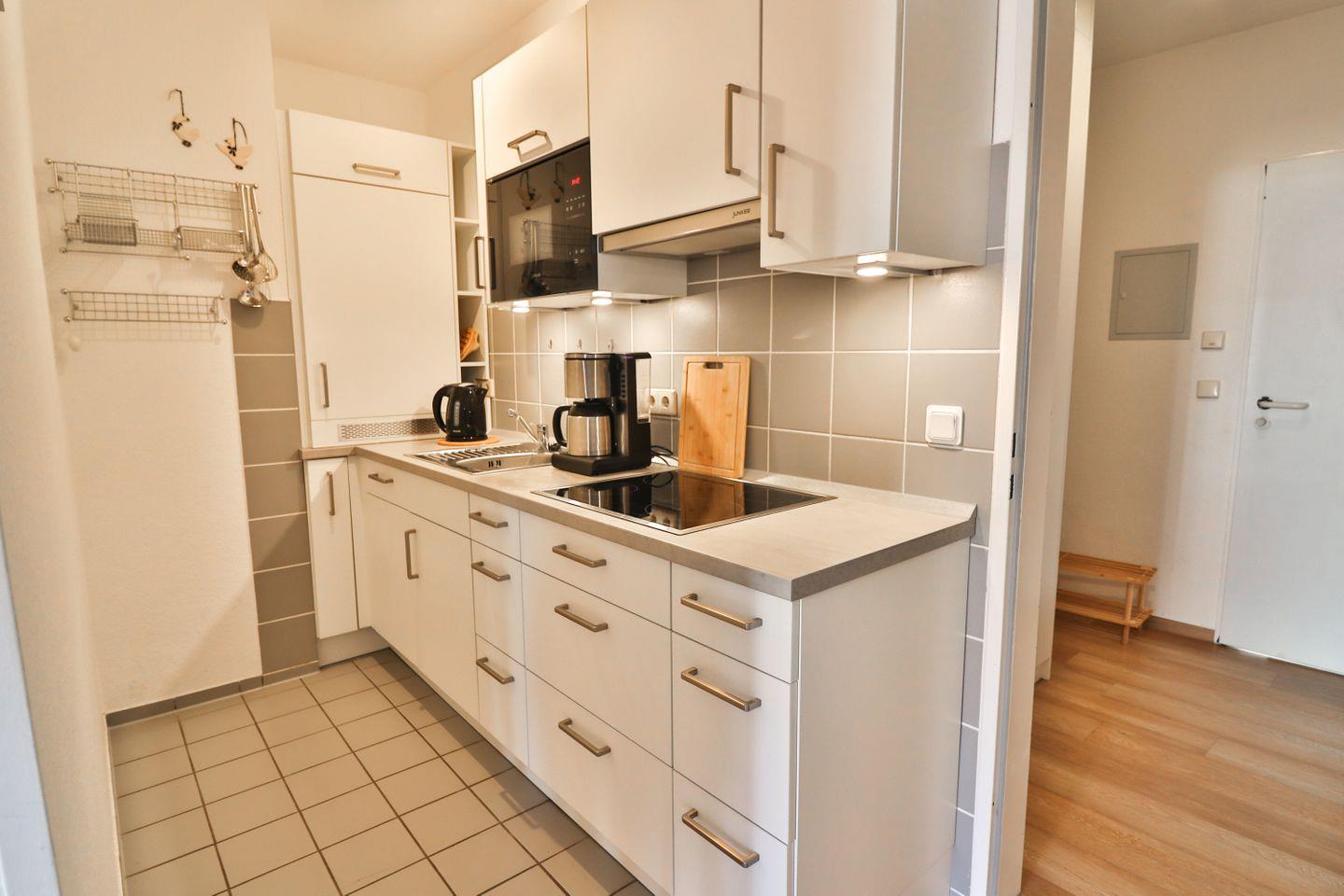 Die Kochnische ist funktional ausgestattet und ermöglicht eine flexible Selbstversorgung: 4-Platten-Herd, Mikrowelle, Kühlschrank mit Gefrierfach, Spülmaschine, Kaffeemaschine, Wasserkocher, Toaster und Eierkocher sowie Geschirr, Besteck und Küchenutensilien sorgen dafür, dass Sie Ihre Lieblingsmahlzeiten zubereiten können.