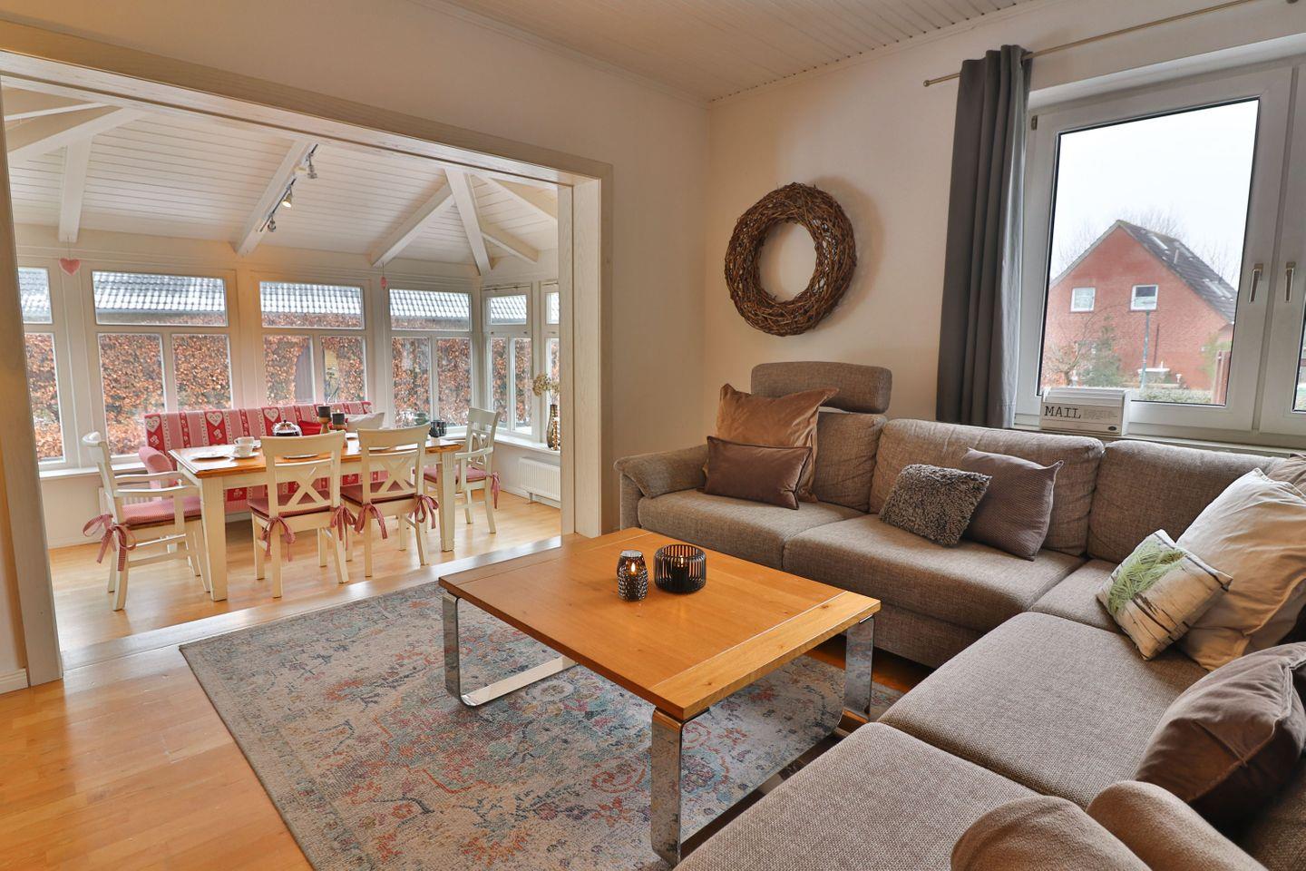 Das Herzstück der Wohnung ist der offen gestaltete Wohnbereich mit hellem Wintergarten. Der freundliche Essbereich mit großem Esstisch ist perfekt für gemeinsame Mahlzeiten, lange Gespräche und gesellige Abende. Über zwei Stufen erreichen Sie das gemütliche Wohnzimmer mit Sofaecke, in dem Kochen, Essen und Entspannen harmonisch ineinander übergehen. Fernseher und kostenfreies WLAN sorgen für Unterhaltung, während eine Auswahl an Gesellschaftsspielen auch bei nordischem Schietwetter für schöne gemeinsame Stunden sorgt.