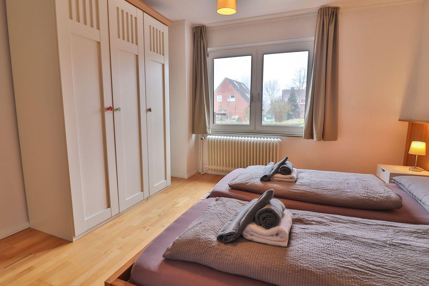 Die Wohnung verfügt über drei komfortable Schlafzimmer mit Doppelbetten (je ca. 180 x 200 cm) und Kleiderschränken. Im größten Schlafzimmer erwarten Sie zusätzlich ein zweiter Fernseher, zwei gemütliche Sessel und ein Schreibtisch – ideal für ruhige Momente oder zum Zurückziehen.