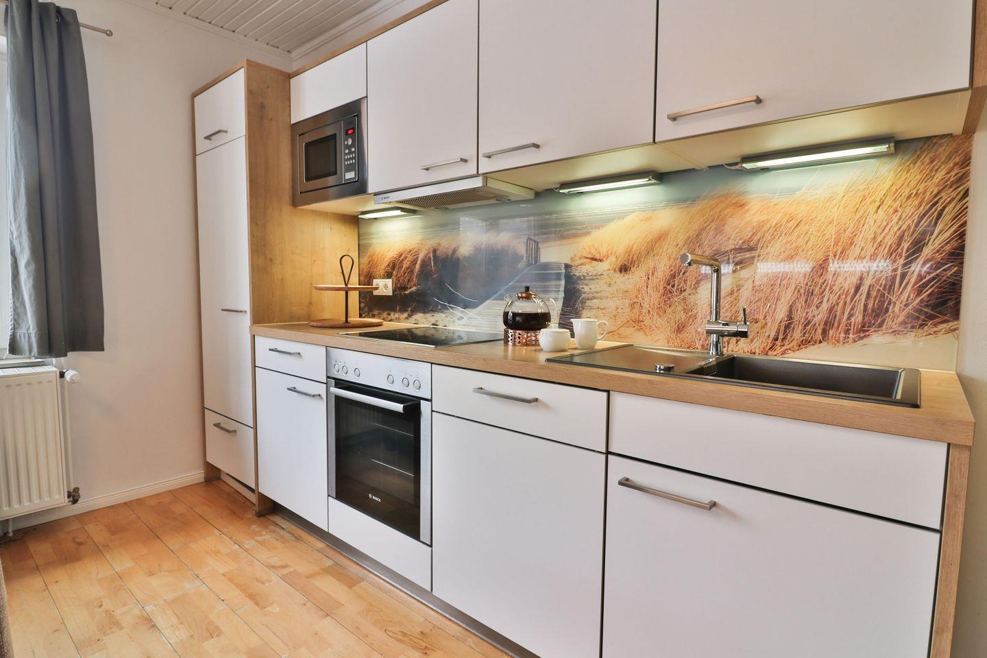 Die moderne, offen integrierte Küche ist vollständig ausgestattet und lässt keine Wünsche offen. Kühlschrank mit Gefrierfach, Geschirrspülmaschine, Backofen, Mikrowelle, 4-Platten-Herd sowie Wasserkocher, Toaster, Kaffeemaschine, Mixer und Eierkocher machen die Selbstversorgung besonders angenehm.