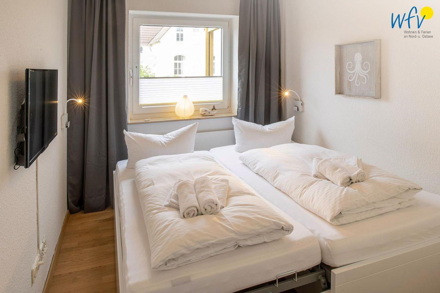 Zwei separate Schlafzimmer bieten behaglichen Schlafkomfort – mit einem Doppelbett (180 x 200 cm) bzw. einem Einzelbett, das sich bei Bedarf zu einem Doppelbett ausziehen lässt (100 x 200 cm und 90 x 190 cm). Geräumige Kleiderschränke bieten viel Stauraum; freundliche Farben und eine ruhige Lage versprechen erholsame Nächte.
