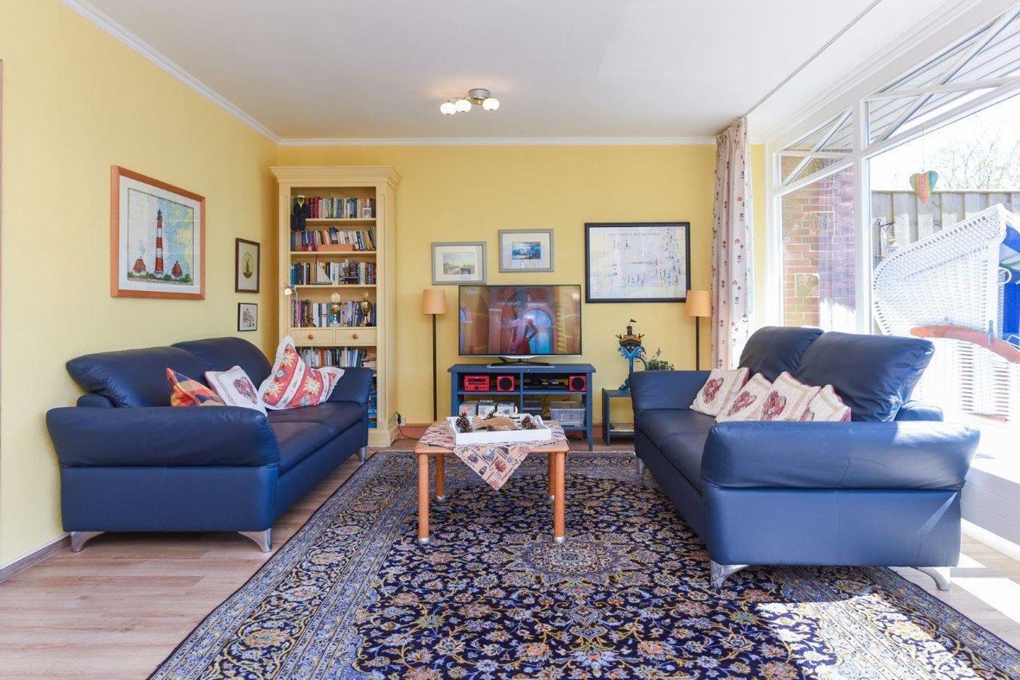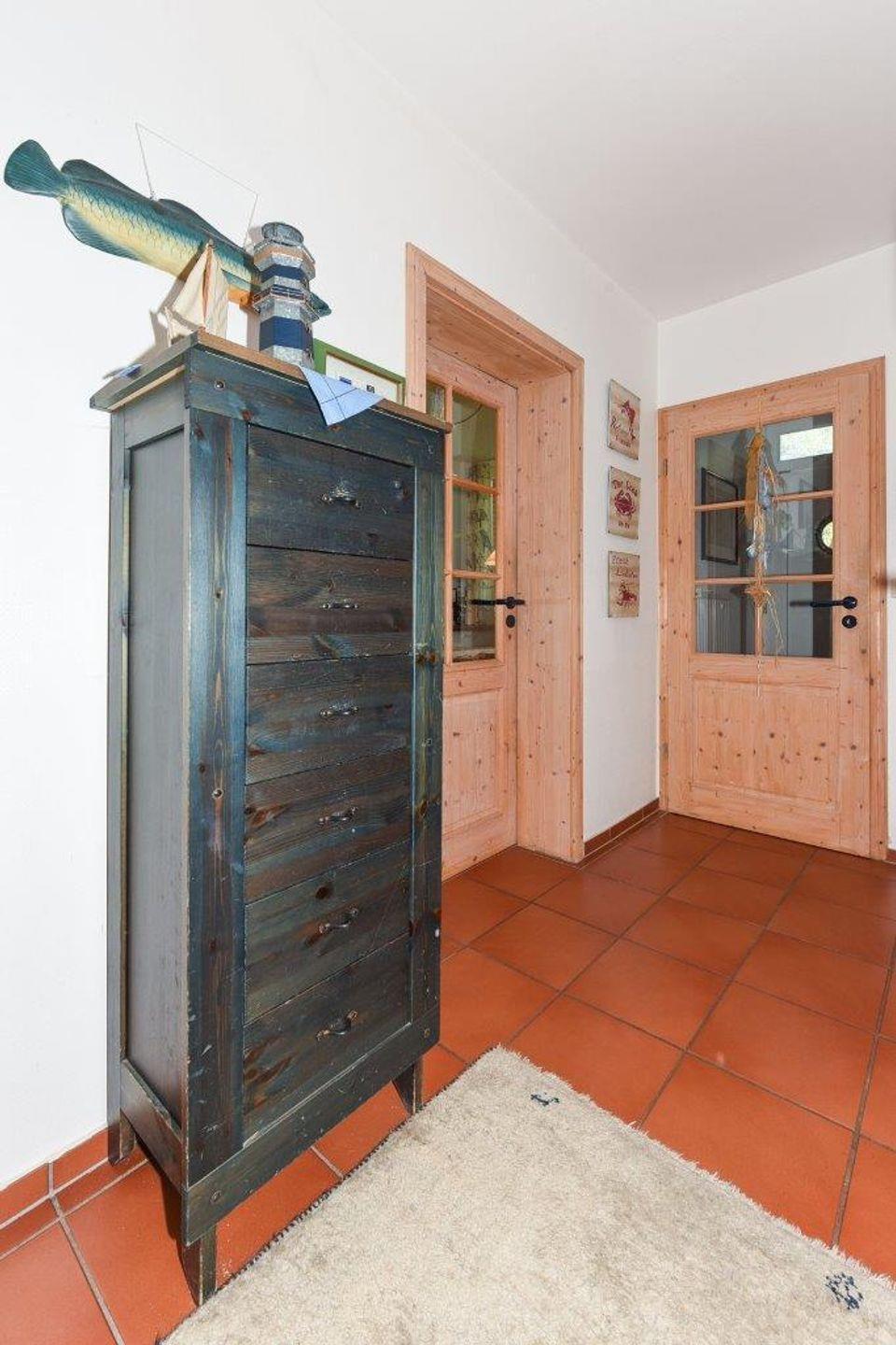 Die mit Massivholzmöbel im maritimen Landhausstil liebevoll gestalteten Räume des Hauses überzeugen durch eine durchdachte Raumaufteilung. Der großzügige Wohnbereich ist mit Echtholzparkett ausgestattet und die bodentiefen Panoramafenster sorgen für eine luftige, lichtdurchflutete Atmosphäre. Im Wohnzimmer ist ein Essbereich integriert, welcher ausreichend Platz für gemeinsame Mahlzeiten bietet. Vom Wohnzimmer aus haben Sie direkten Zugang zur circa 25 m² großen Terrasse auf der Südseite des Hauses – perfekt für sonnige Stunden im Freien. Zusätzlich gelangen Sie hier zum circa 40 m²großen Garten sowie einer großen Spielwiese vor dem Haus.