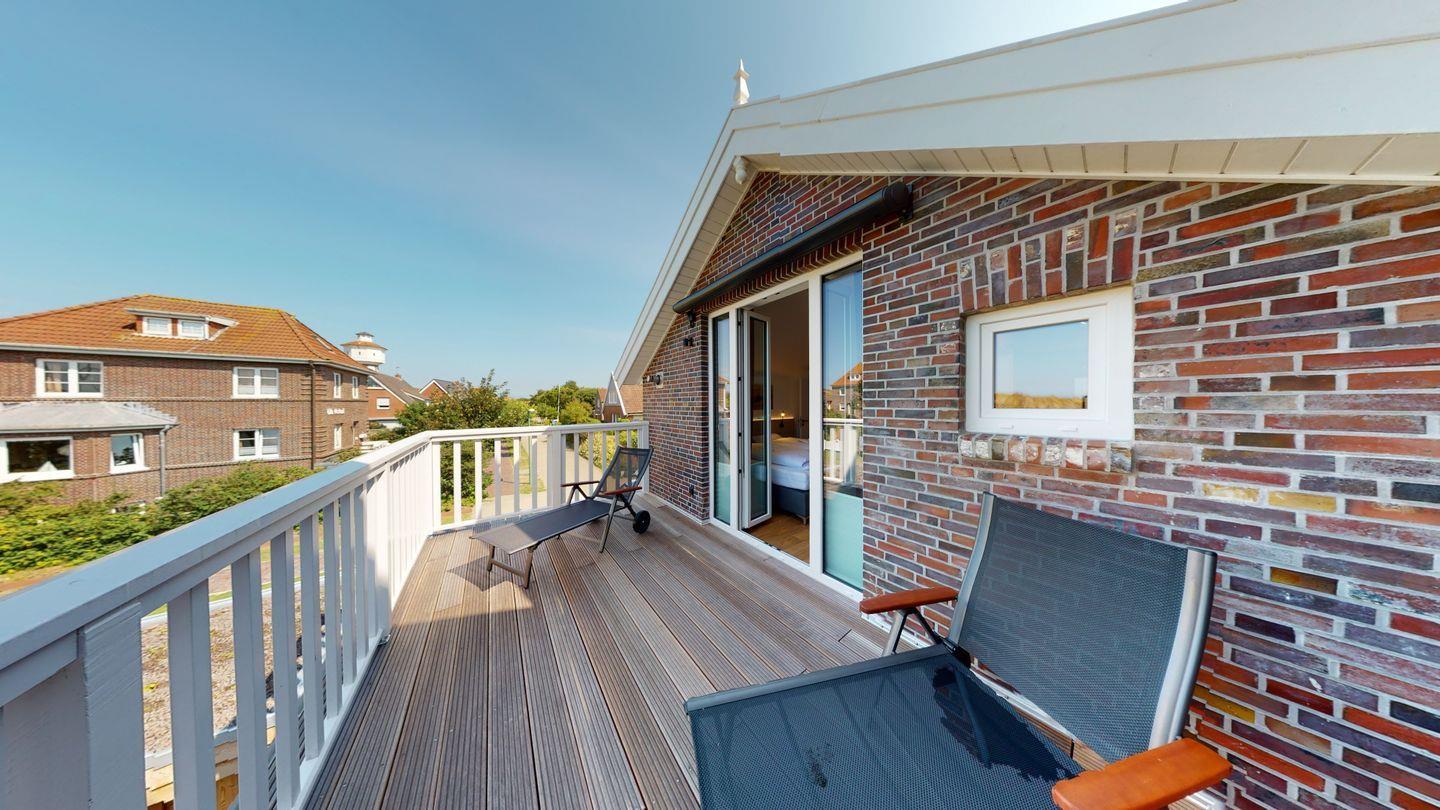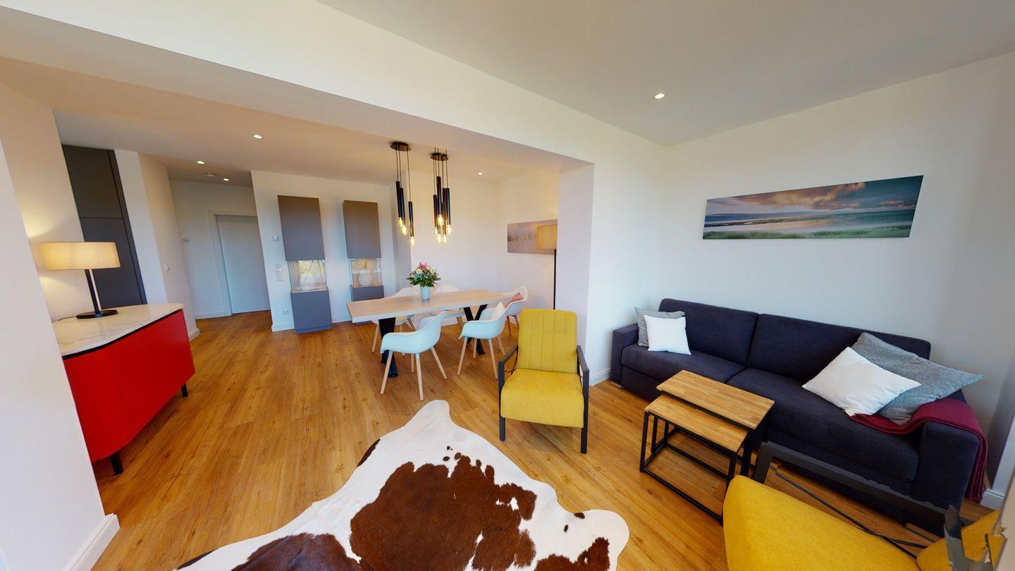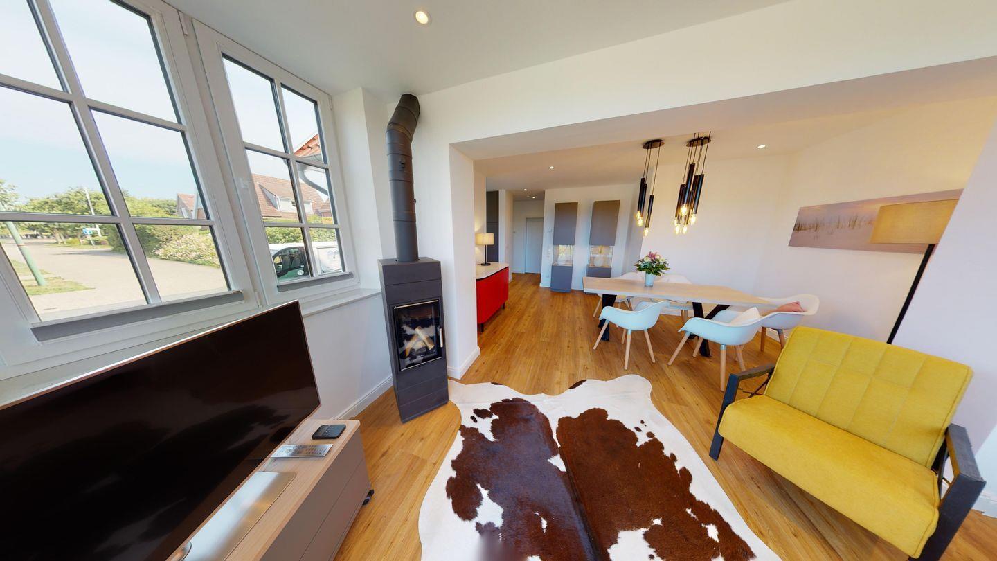Im Erdgeschoss befindet sich der Wohnbereich mit großen, wunderschönen bodentiefen Sprossenfenstern, die den wunderbaren Dünenblick freigeben. Die Wohlfühlatmosphäre des Raumes wird durch einen Kaminofen bereichert. Die offene, voll ausgestattete Küche sowie ein großer Essplatz sind hier integriert. Vom Wohnzimmer aus haben Sie Zugang auf die Hochparterre-Terrasse, die mit gemütlichen Sitzmöbeln und einer Markise ausgestattet ist. Auch ein Abstellraum befindet sich sich im EG. Ein zusätzliches Gäste-WC im Eingangsbereich ergänzt die Annehmlichkeiten.