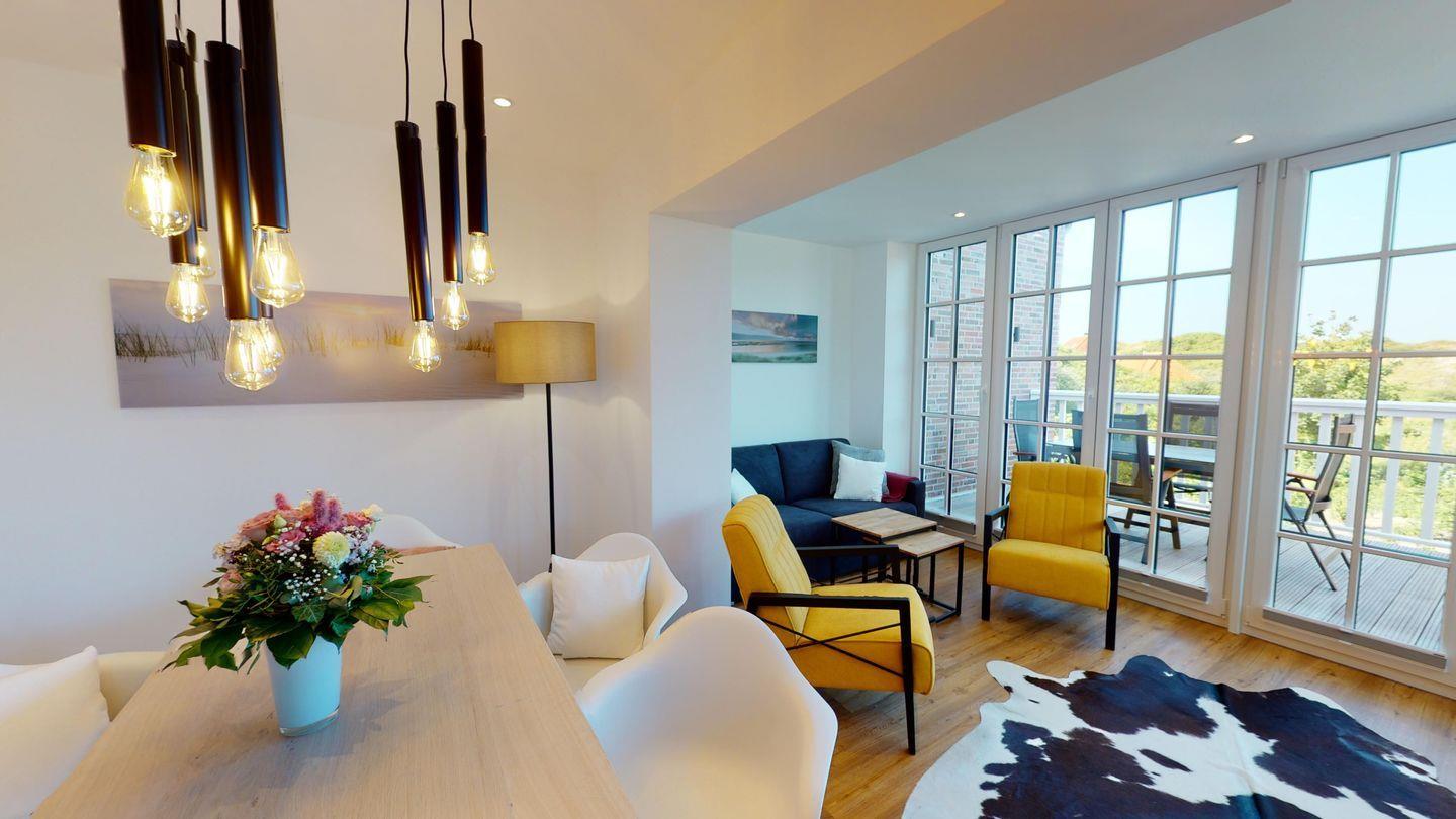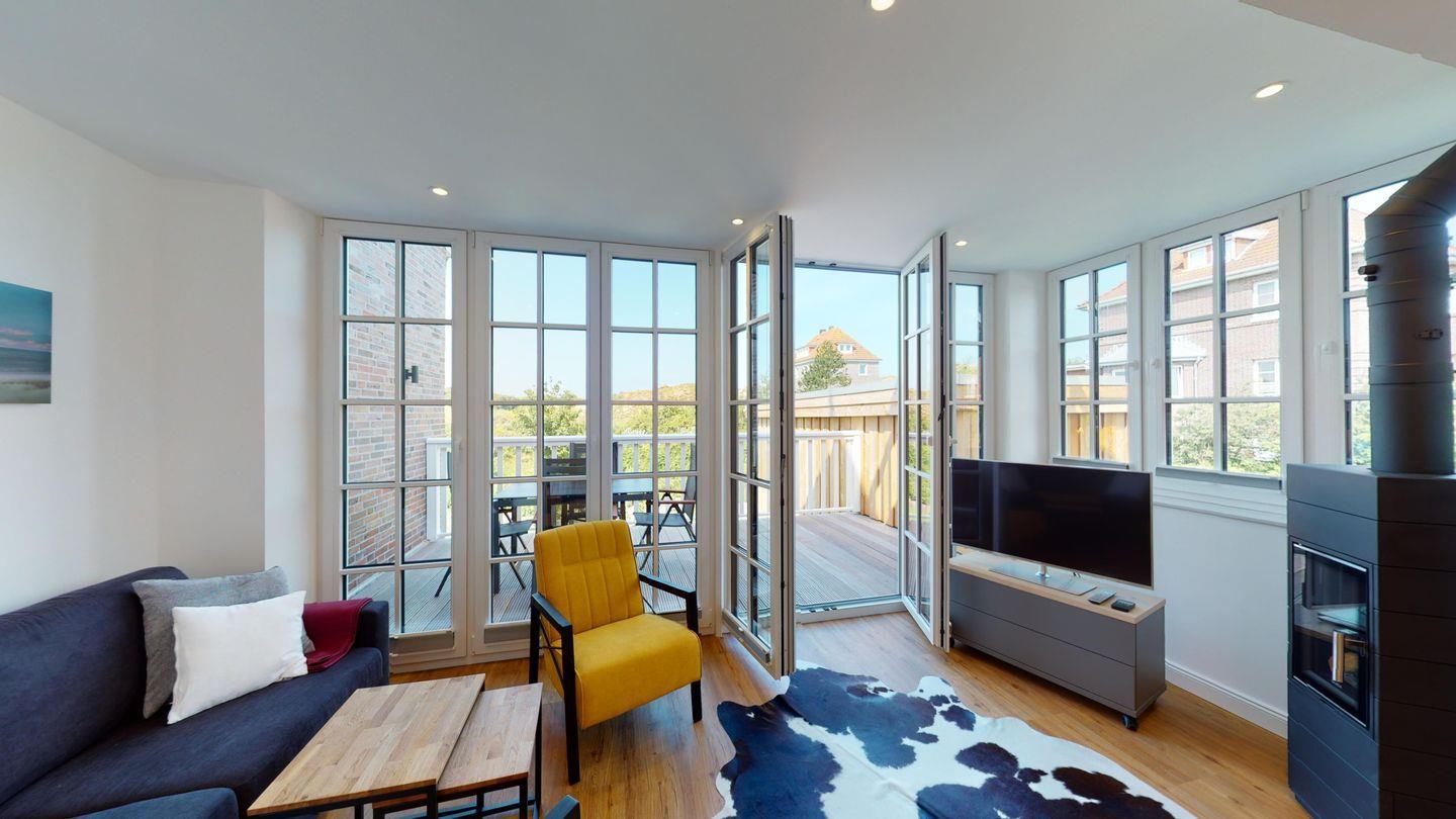 EG: Wohnbereich mit bodentiefen Sprossenfenstern und Dünenblick, Kaminofen, offene Küche, großer Essplatz, Gäste-WC, Abstellraum, Hochparterre-Terrasse mit Sitzmöbeln und Markise