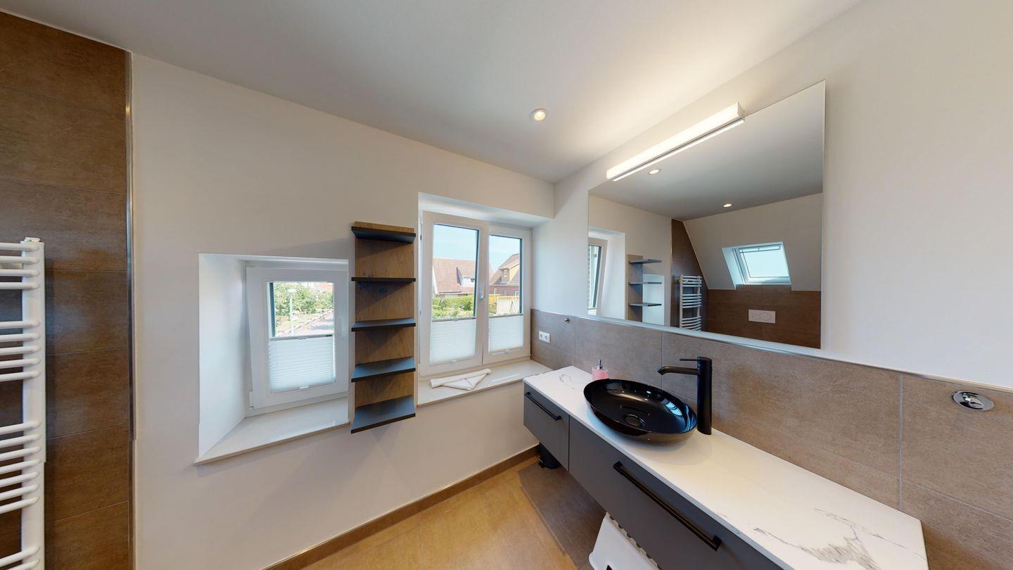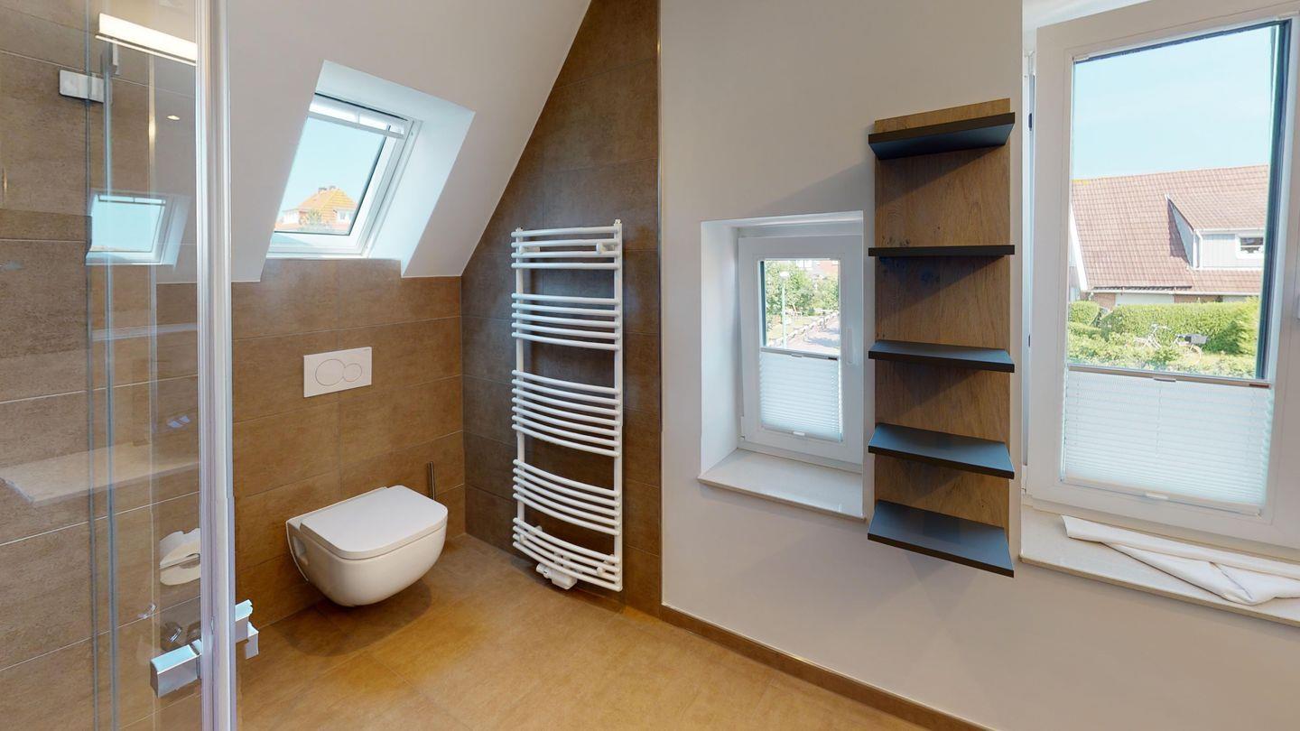 OG: zwei der drei Schlafzimmer im OG mit je einem modernen Tageslichtbad mit Waschtisch, Dusche und WC, großzügiger Balkon