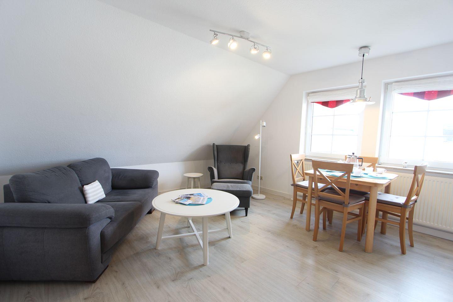 Magellan 2: 45 m² große Ferienwohnung in ruhiger Ortsrandlage, mit Wohn- Essbereich mit offener Küche und gemütlicher Couchecke mit TV und Hifi-Anlage.