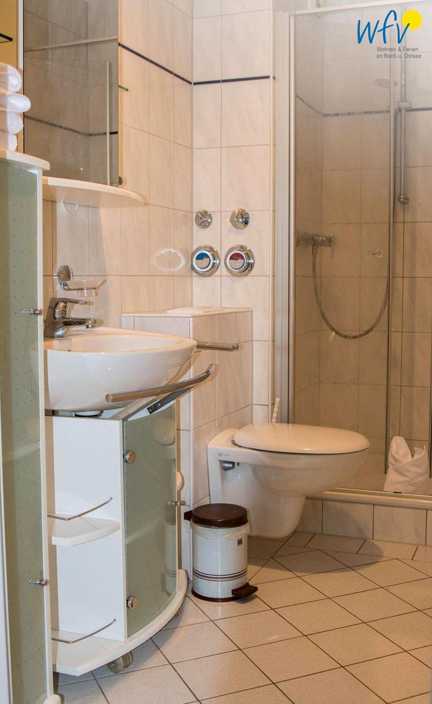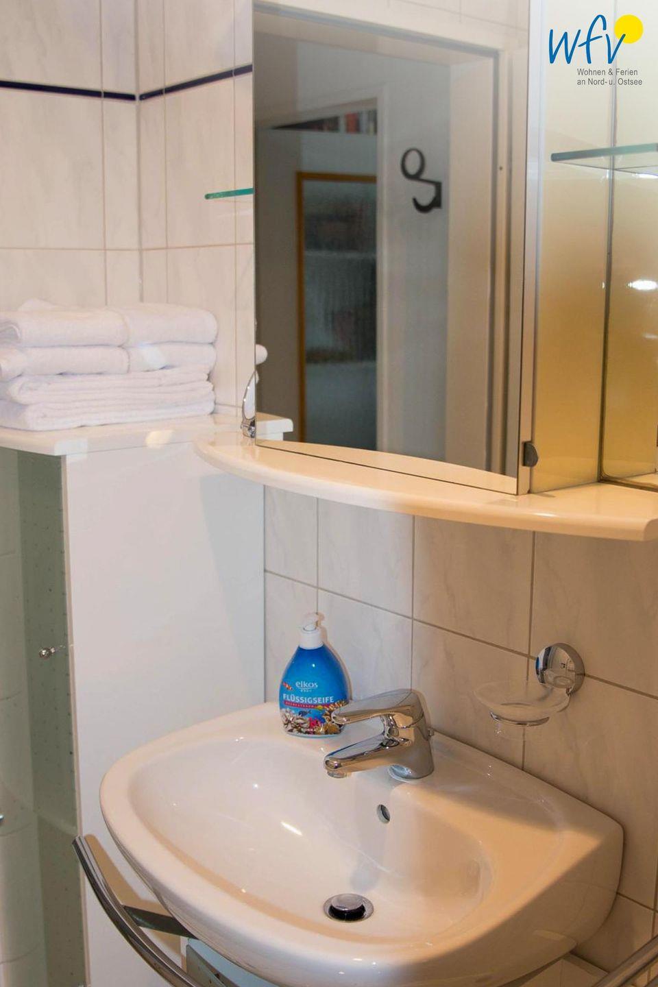 Das Badezimmer ist mit Dusche in der Wanne, WC, Waschbecken, Spiegel, Kosmetikspiegel und Haartrockner ausgestattet. Für längere Aufenthalte besonders praktisch sind die Waschmaschine und der Trockner zur Eigennutzung. Darüber hinaus stehen Ihnen Wäscheständer, Bügeleisen, Bügelbrett und Staubsauger zur Verfügung.