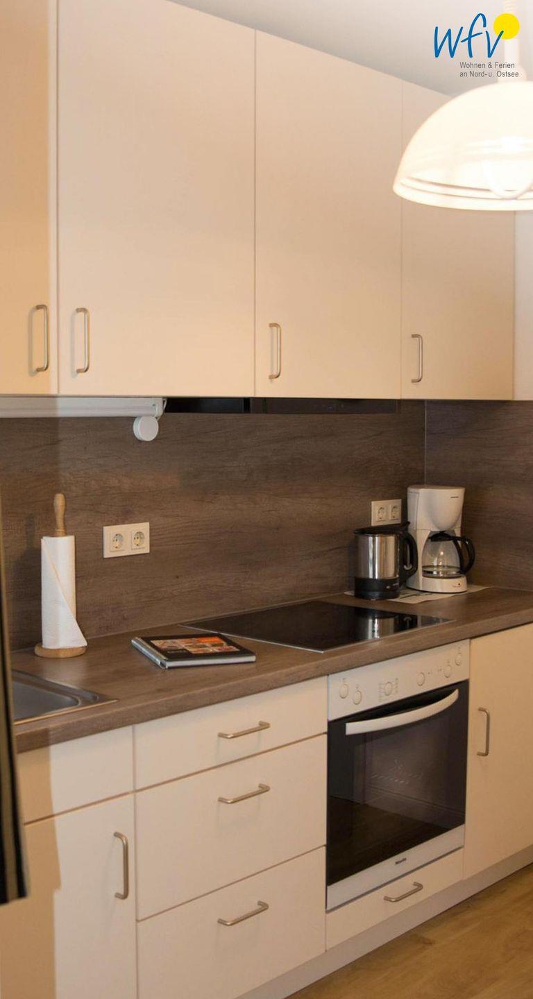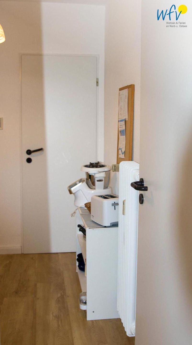 Die geschlossene Küche ist funktional eingerichtet und bietet Ihnen gute Voraussetzungen für die Selbstversorgung. Zur Ausstattung gehören Cerankochfeld, Backofen, Mikrowelle, Spülmaschine, Kühlschrank mit Gefrierfach, Wasserkocher, Toaster, Kaffeemaschine, Küchenmaschine und Mixer. So lassen sich Mahlzeiten unkompliziert vorbereiten und gemeinsam genießen.