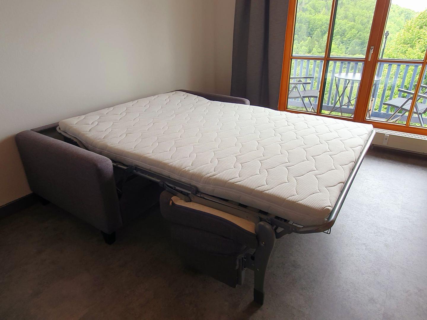 Die helle und geschmackvoll eingerichtete Ferienwohnung verfügt über ein separates Schlafzimmer (klein aber fein!) mit zwei komfortablen Einzelbetten und einem großzügigen Wohnbereich, der in einen offenen Küchenbereich übergeht. Die voll ausgestattete Küche lässt keine Wünsche offen – sie ist mit Cerankochfeld, Kühlschrank mit Gefrierfach, Spülmaschine, SenseoSwitch (Filter-Kaffeemaschine und Padmaschine in einem) und weiteren Küchenutensilien ausgestattet, sodass Sie ganz nach Belieben Ihr Lieblingsessen zubereiten können. Im Mini Backofen-Grill lassen sich Kleinigkeiten aufbacken. Der Essbereich lädt zu gemeinsamen Mahlzeiten ein, während das Sofa und der Lesesessel im Wohnzimmer für entspannte Stunden sorgen. Hier können Sie sich gemütlich zurücklehnen und einen Film auf dem digitalen Fernseher genießen oder durch das kostenfreie WLAN im Internet surfen. Ein elektrischer Kaminofen sorgt für Wohlfühlathmosphäre und wärmt zusätzlich. Das Sofa ist zu einem hochwertigem Bett ausklappbar (Liegefläche 140 x 200, max. 160 kg belastbar)), so dass insgesamt drei Gäste hier bequem urlauben können.