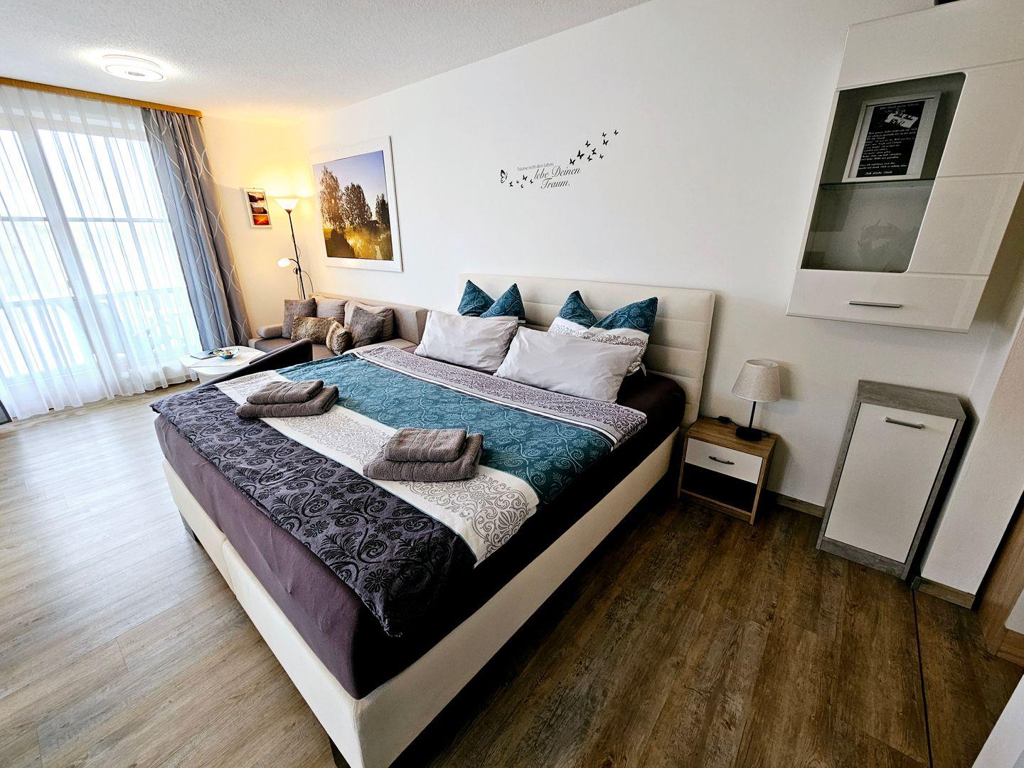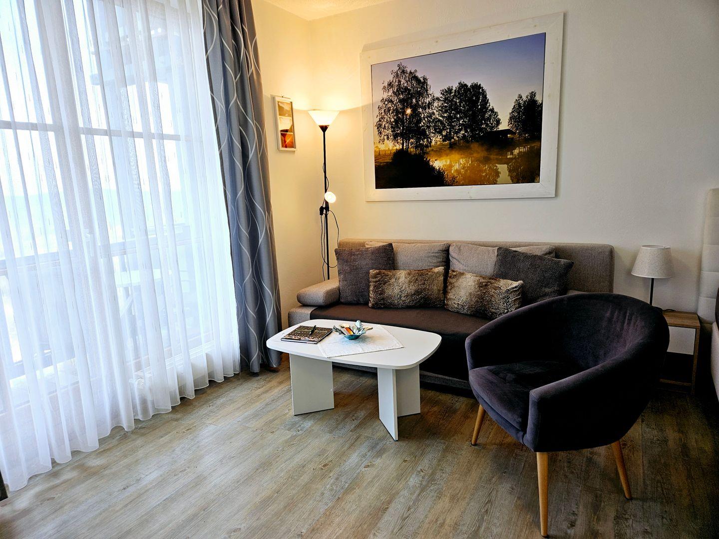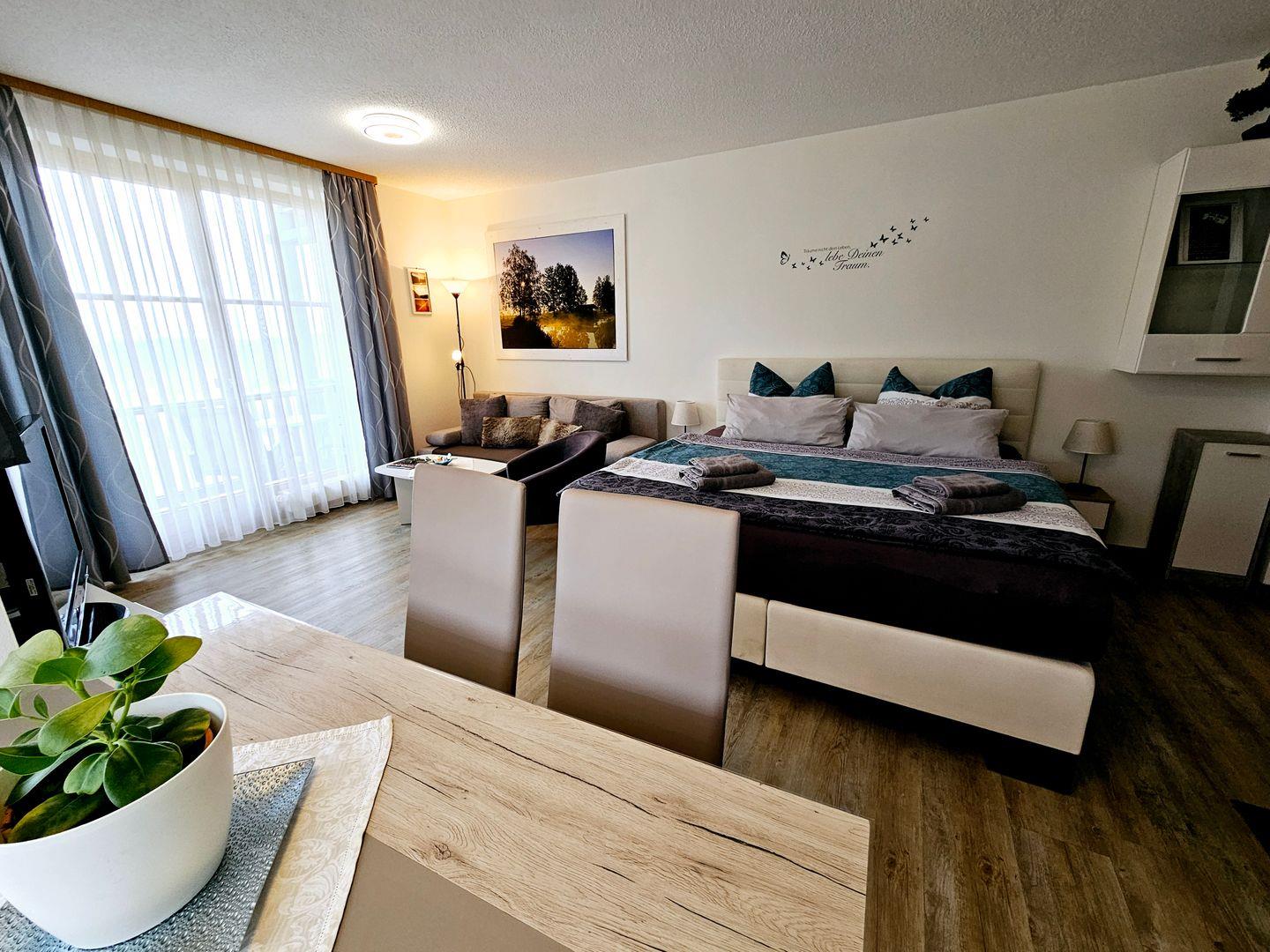 Mit einer Größe von 35 m² bietet die Wohnung Platz für bis zu drei Personen, ideal für Familien oder Paare, die eine harmonische Auszeit in der Natur verbringen möchten. Ihr Vierbeiner darf Sie selbstverständlich begleiten. Das Schlafzimmer ist komfortabel eingerichtet und der offene Wohnbereich ermöglicht eine angenehme Kommunikation und ein geselliges Beisammensein. Hier finden Sie eine gemütliche Sofaecke, die zum Entspannen und Verweilen einlädt, während der Essbereich in einem lichtdurchflutetem Erker Platz für gemeinsame Mahlzeiten bietet.