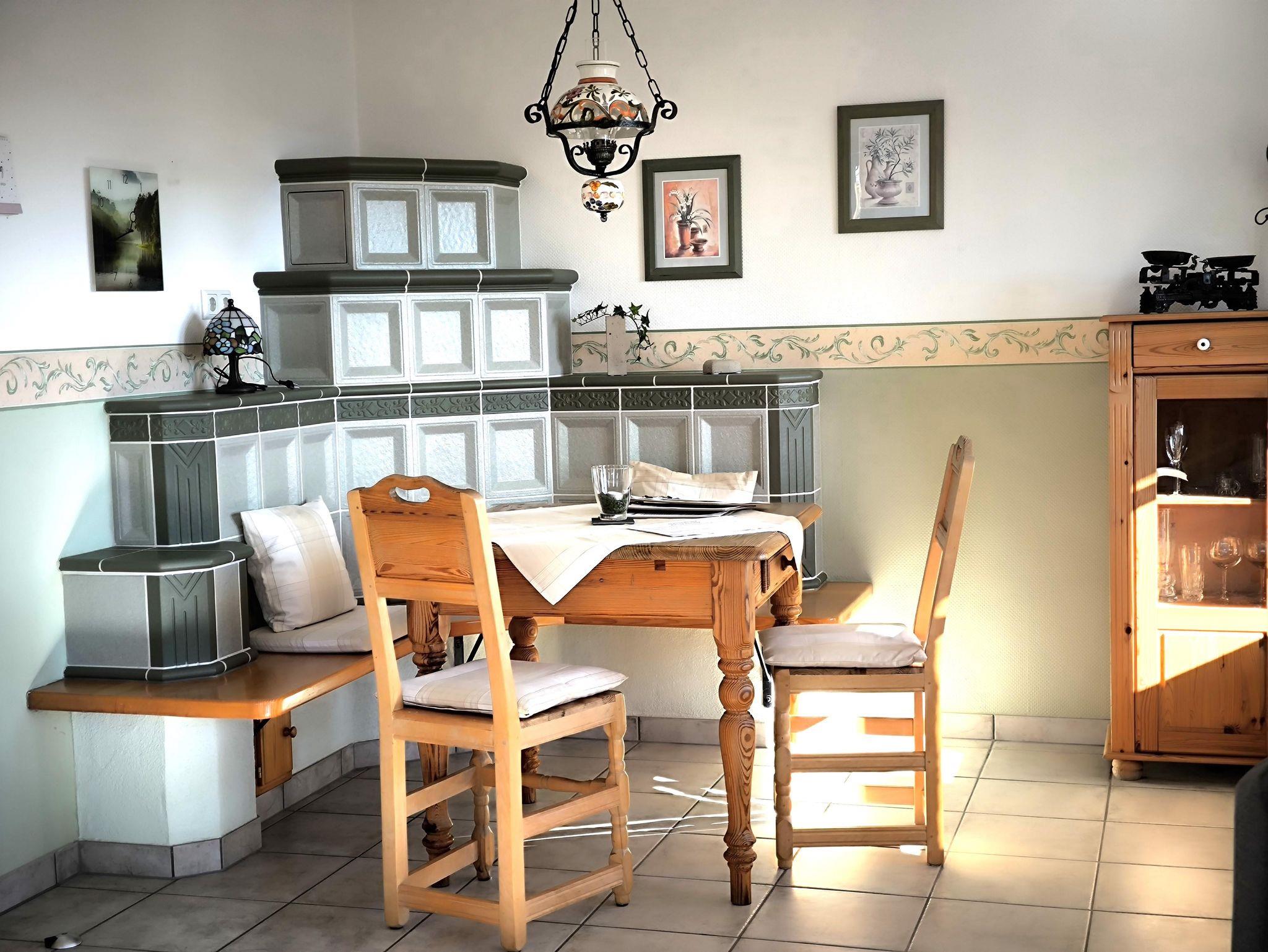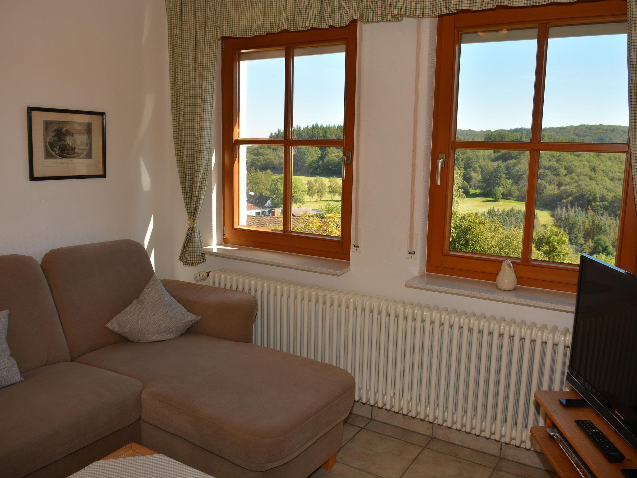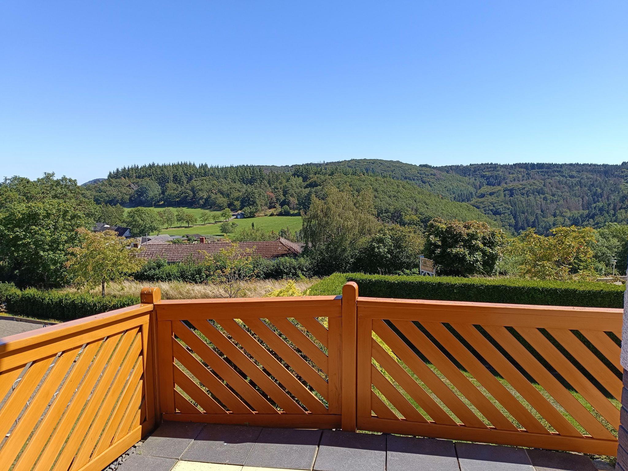 Die 57 qm große Wohnung befindet sich im Erdgeschoss. Im ganzen Haus können Sie kostenlos WLAN nutzen. Die Wohnung ist hochwertig im Landhausstil eingerichtet und besteht aus, einem Wohn- und Esszimmer mit einer gemütlichen Couch-Ecke mit LCD-TV, Stereoanlage und DVD Player. In der Essecke steht ein zentral beheizter Kachelofen mit gemütlicher Holzofenbank, ein Tisch und zwei Stühle. Die Wohnung hat ein separates Schlafzimmer mit Doppelbett, allergiefreien Matratzen, Nachtkommoden und einem 5-türigen Kleiderschrank und ein Möbeltresor im Schrank. Das Badezimmer ist ein Duschbad mit Handwaschbecken und Toilette. Fön, Handtücher, eine Grundausstattung mit Toilettenpapier, Reinigungsmitteln und Seife gehören dazu. Die ebenfalls abgeschlossene Küche hat eine Spülmaschine, Ka?ffeemaschine, Toaster, Wasserkocher, Mikrowelle, Eierkocher, Mixer und Kühlschrank mit Gefrierfach. Die Küchenschränke sind eingerichtet. Enthalten ist auch eine Grundausstattung von Küchenhandtüchern/Spültuch, Spülmitteln, Filtertüten, Mülltüten, Küchenrolle, Spülmittel und Tabs. Der Balkon mit Süd-Ost Ausrichtung hat einen ungehinderten, weitschweifenden Blick über die wunderbare Eifellandschaft. Die Gartenstühle mit Auflagen, Tisch und Tischdecke und ein Sonnenschirm gehören auch zur Ausstattung. Weiter hat das Haus einen großen Garten mit Badminton-/Bolzplatz, ein Boule Platz und daran eine Grillecke. Auf Anfrage können Waschmaschine und Trockner gegen Entgelt benutzt werden. Die Geräte im Fitnessbereich mit Wintergarten können Sie jederzeit nutzen und sind im Preis enthalten. Die Sauna und die Infrarotkabine im Wellnessbereich können Sie auch nutzen, müssen diese aber bis spätestens 1 Tag vorher während Ihres Aufenthaltes gegen Entgelt dazubuchen. Dafür steht Ihnen der Bereich auch allein zur Verfügung. Hauseigene Parkplätze befinden sich direkt vor der Eingangstür. In der abschließbaren Garage können Sie Ihre Räder und E-Bikes sicher unterbringen. Eine Steckdose zum Laden ist vorhanden.
