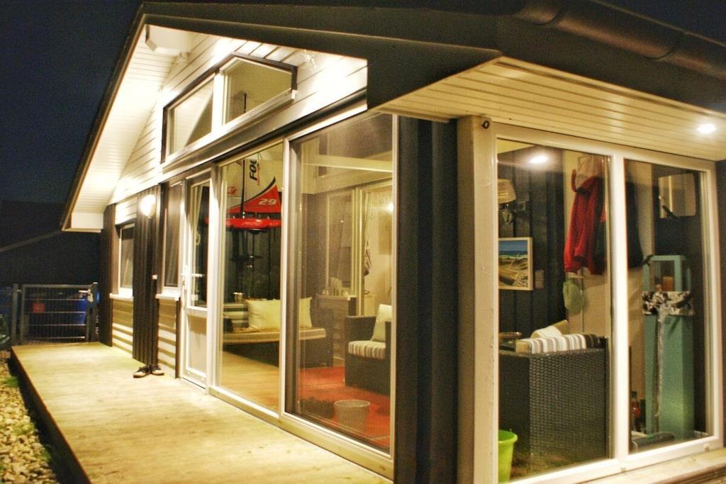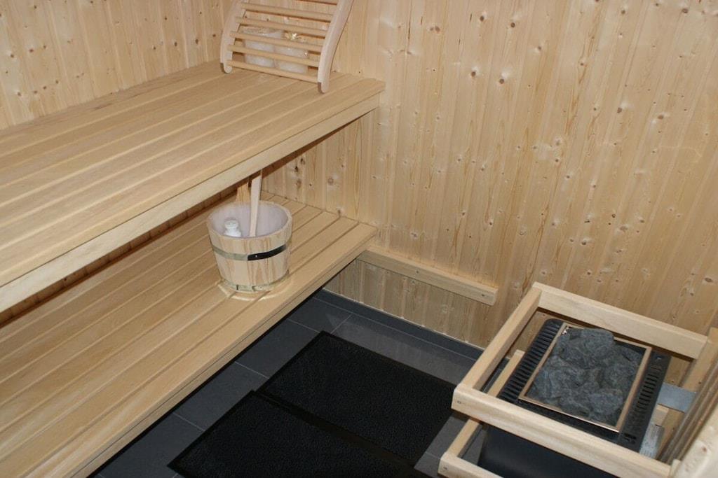 , Stue(, , Fjernsyn, kakkelovn, DVD-afspiller, Blu-ray afspiller, radio, CD-afspiller, insektnet), Køkken(, , , tekøkken, spisebord, kakkelovn, kogeplade, elkedel, brødrister, komfur, kaffemaskine, ovn, grill, mikrobølgeovn, opvaskemaskine , køleskab, fryser, insektnet), soveværelse(, , , enkeltseng, dobbeltseng, Fjernsyn, tremmeseng, barnestol, insektnet), soveværelse(, , , enkeltseng, dobbeltseng, Fjernsyn, tremmeseng, barnestol, insektnet), svalegang soveværelse, badeværelse(, toilet, sauna, badekar, hottub, bruser, håndvask, vaskemaskine, varme, føntørrer, insektnet), guest toilet(, toilet, håndvask), loungerum(sauna, hottub), havestue(), Internetadgang, tørretumbler, vaskemaskine, terrasse(Strand, grill, havemøbler, solstole), have(Strand, Græsplæne, havemøbler, solstole, Haveskur), parkering, strygejern, Vaskeripakke mod et gebyr