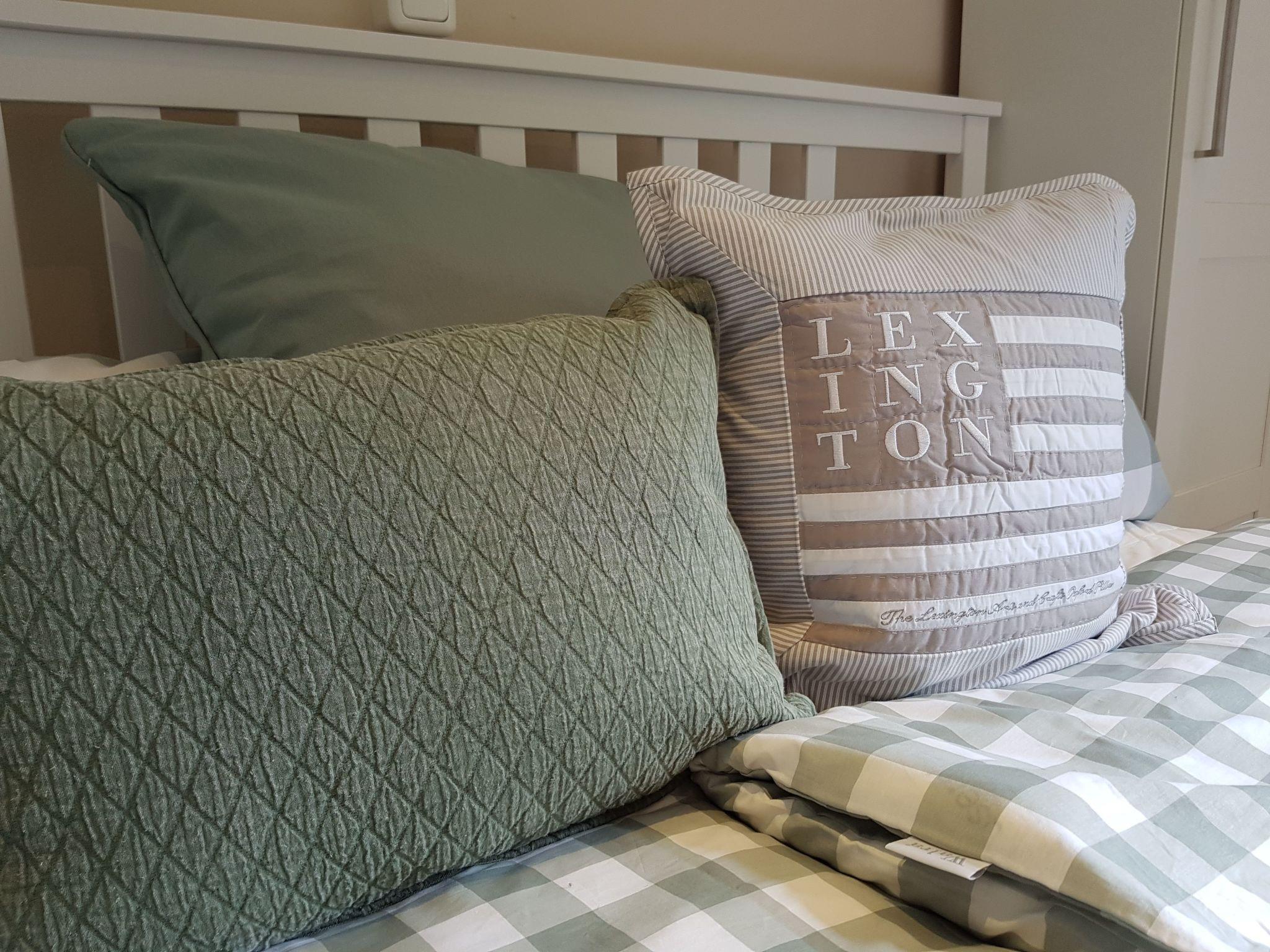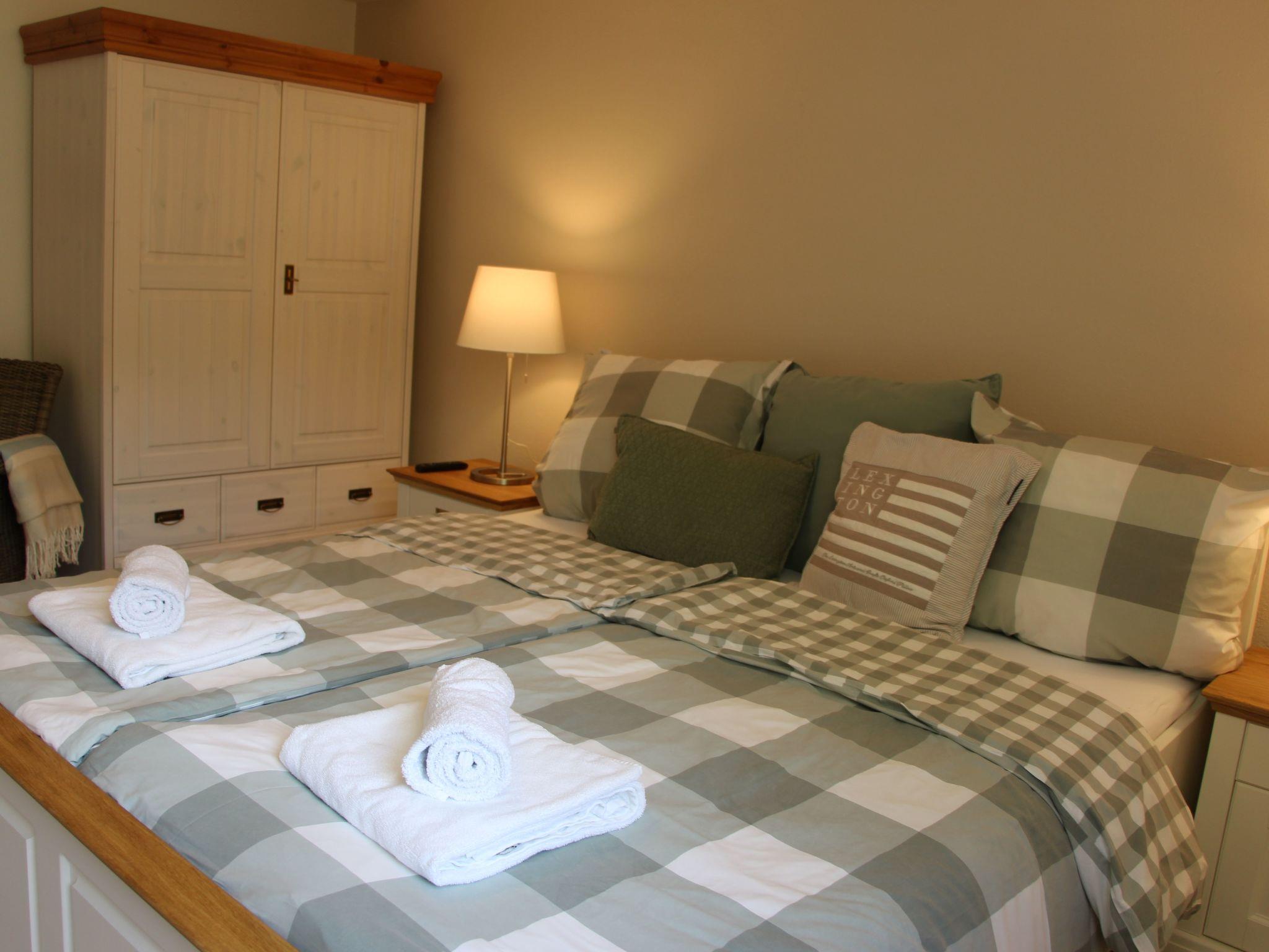 Bedroom with a double bed (180cm x 200 cm), satellite TV with Smart TV function, wardrobe, changing unit and reading chair. The bookshelf contains a collection of books and games for young and old. The window is equipped with an insect screen. Underfloor heating is also available.