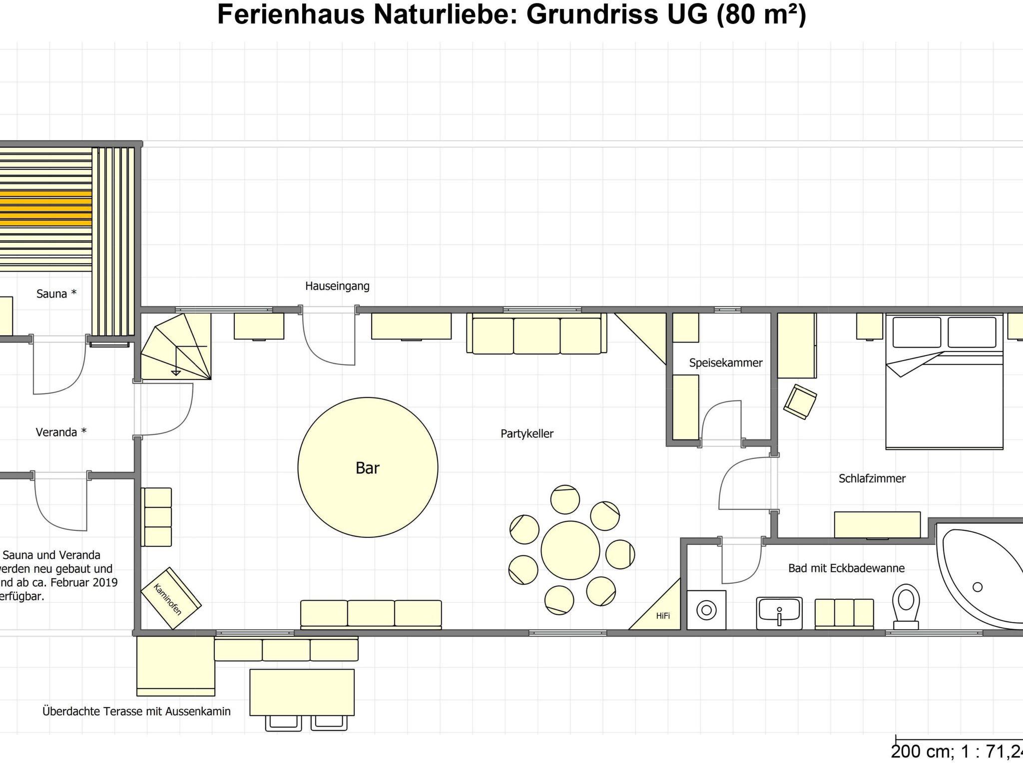 The party room in the basement with an illuminated bar counter, fridge, pull-out sofa bed, stereo system, disco ball, pull-out table for 8 people, board games, shoe cupboard, wood-burning stove and benches offers a pleasant atmosphere for cosy get-togethers.