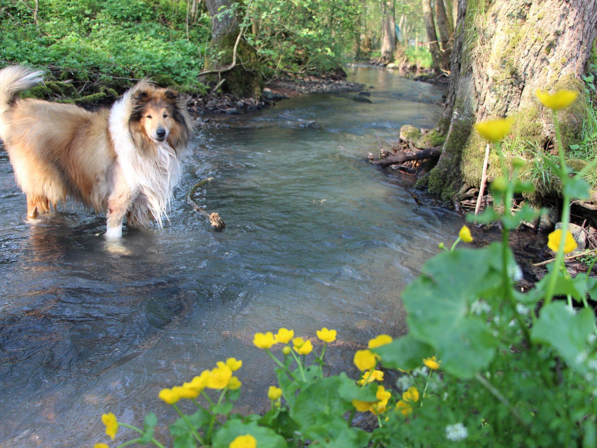Dogs are especially welcome here! Would you like to rent a holiday home with a dog? Then you've come to the right place! We make sure that your pets feel at home with us and have a food bowl, dog bed and dog towels available. We have completely fenced and secured the garden. The fence consists partly of a hunter's fence to the forest path, a solid wire fence to the neighbour from the right and a plank fence, which is secured with a solid wire fence on the other two sides.