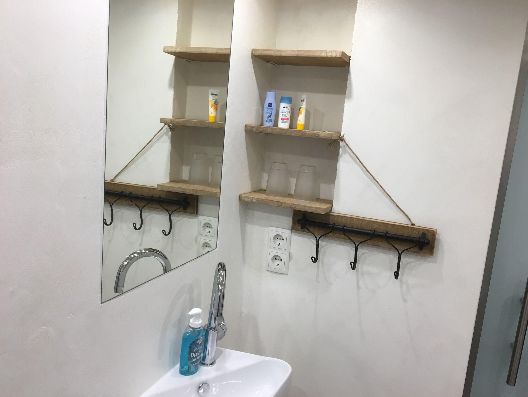 Das Bad ist modern eingerichtet mit einer ebenerdigen Dusche, WC, Handtuchtrockner, Fön und genügend Abstellfläche.