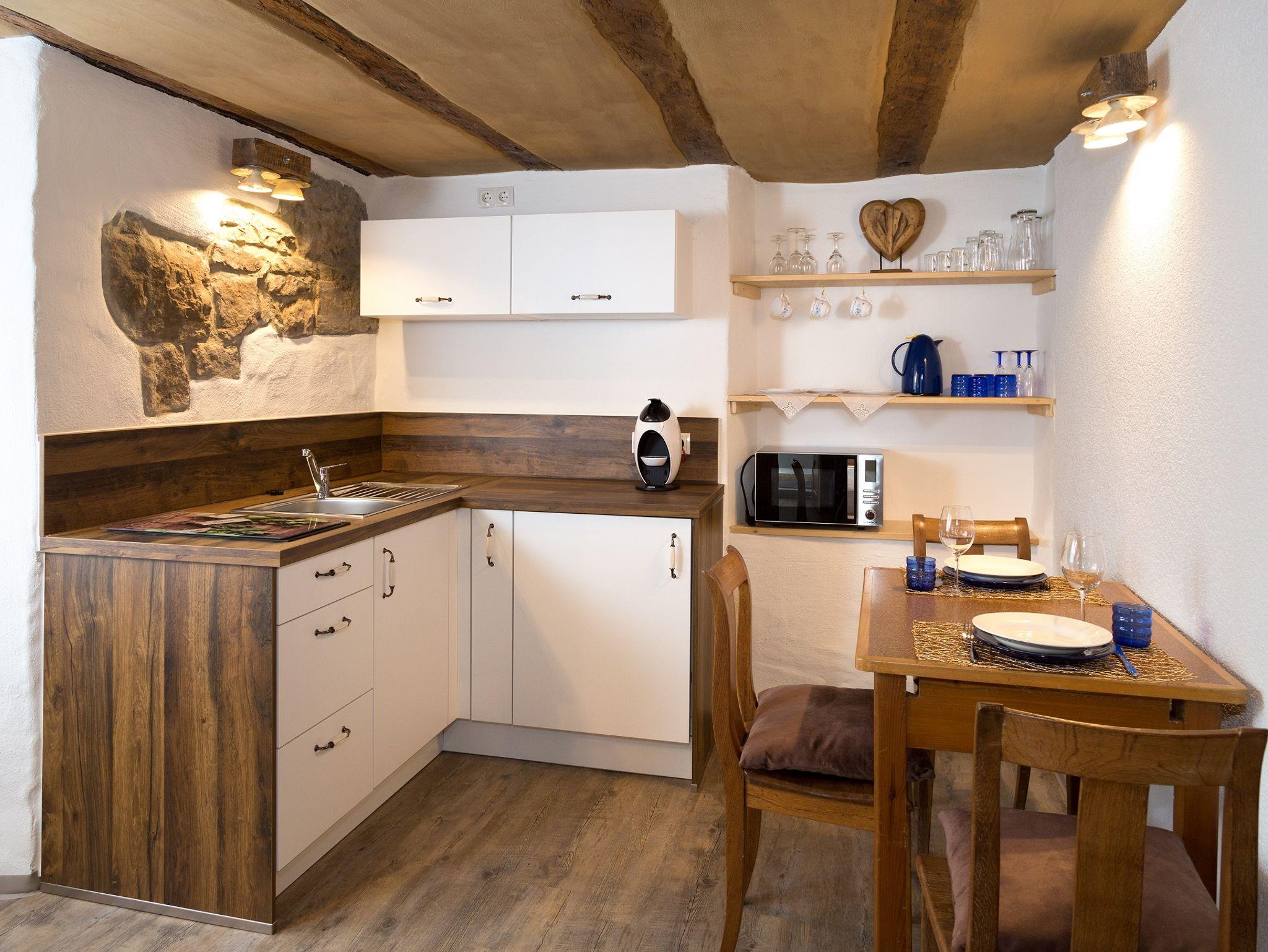 Im ca. 30 qm großen Nichtraucher Apartment beim Schloß Michel trennt das alte Fachwerk den Schlafbereich von Küche und Bad.