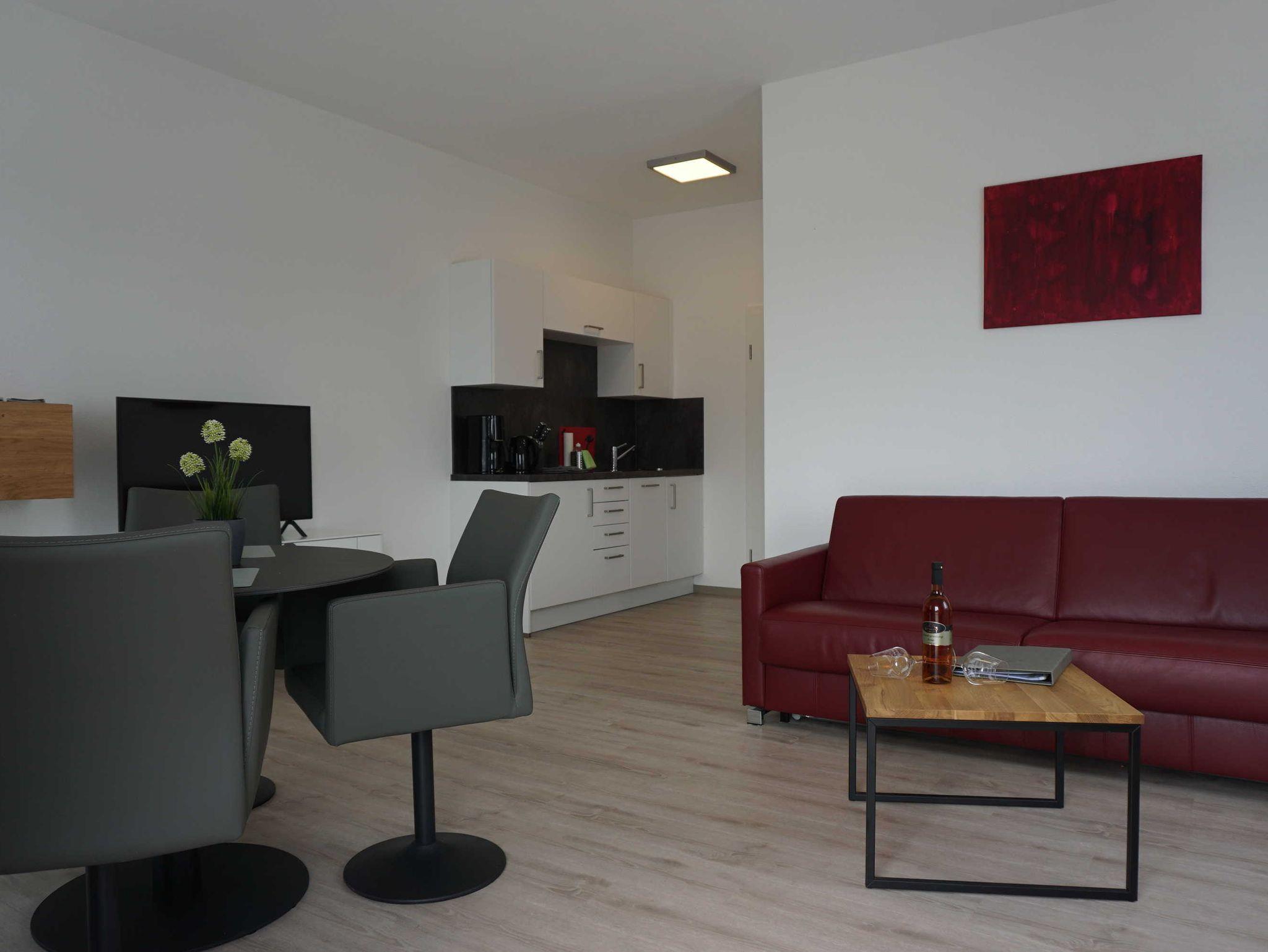 Die Ferienwohnung verfügt über zwei Schlafplätze sowie eine zusätzliche Schlafcouch. Auf 45m² finden Sie ein Doppelzimmer, eine Küchenzeile sowie ein Wohn- und Esszimmer.