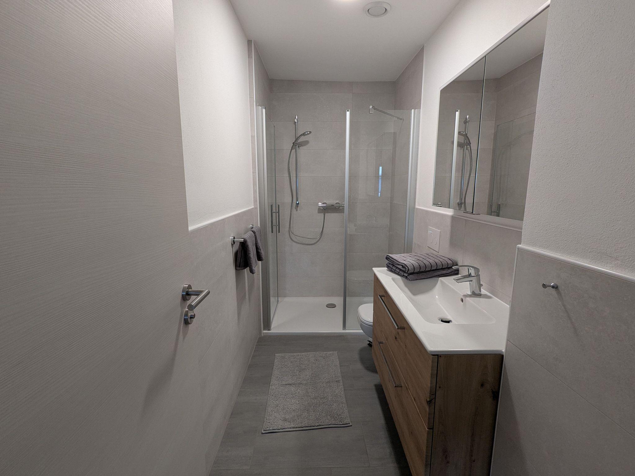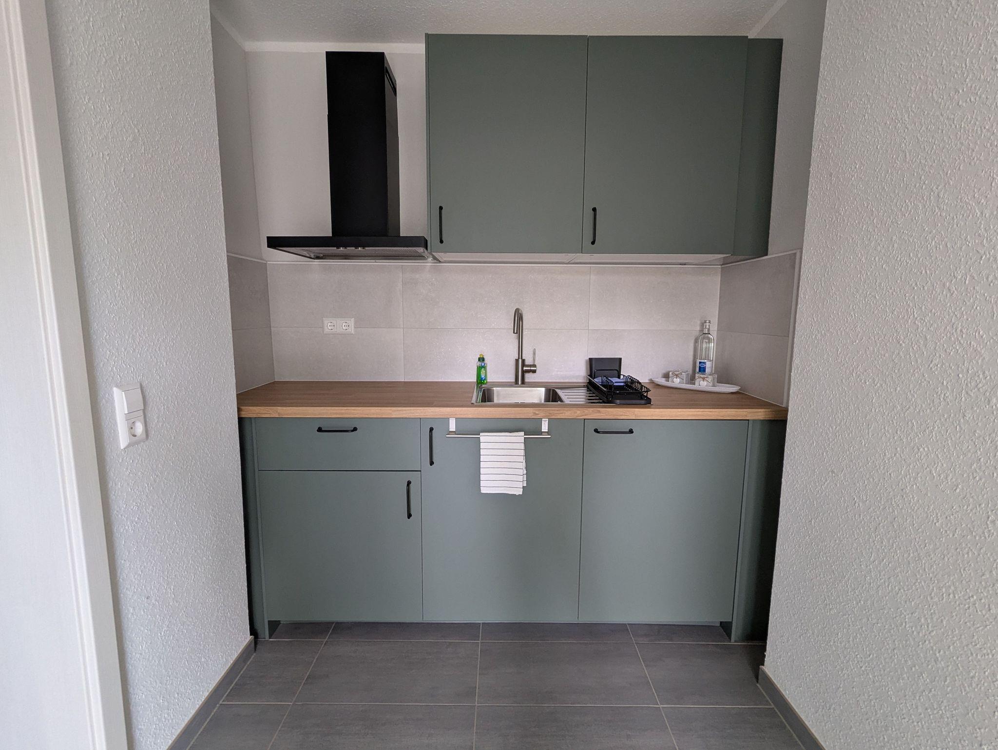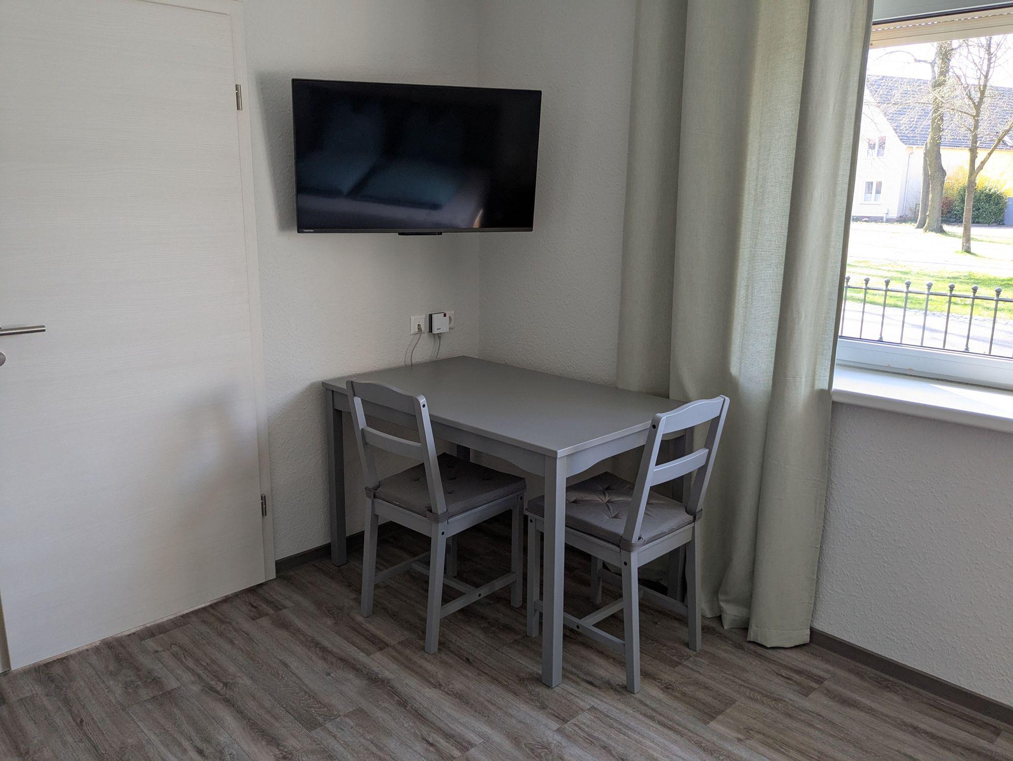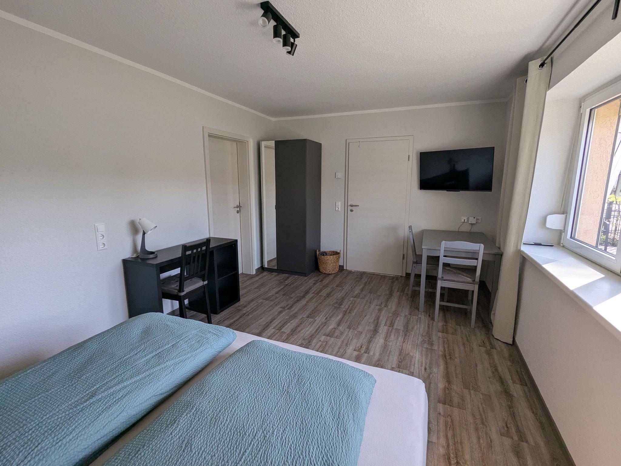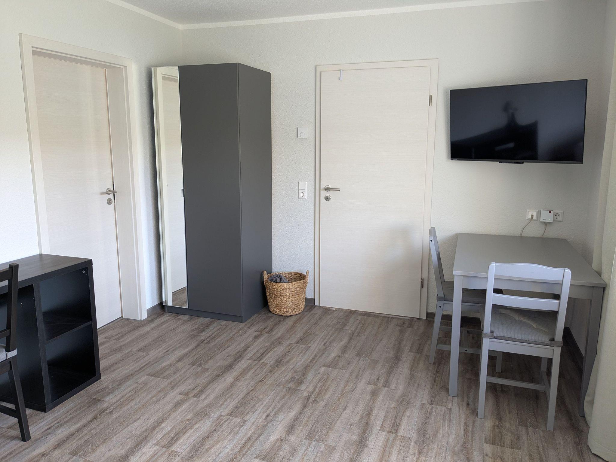 Dier Ferienwohnung verfügt über ein Schlafzimmer mit Arbeitsplatz und TV, eine separate voll ausgestattete Küche und ein Badezimmer mit ebenerdiger Dusche.