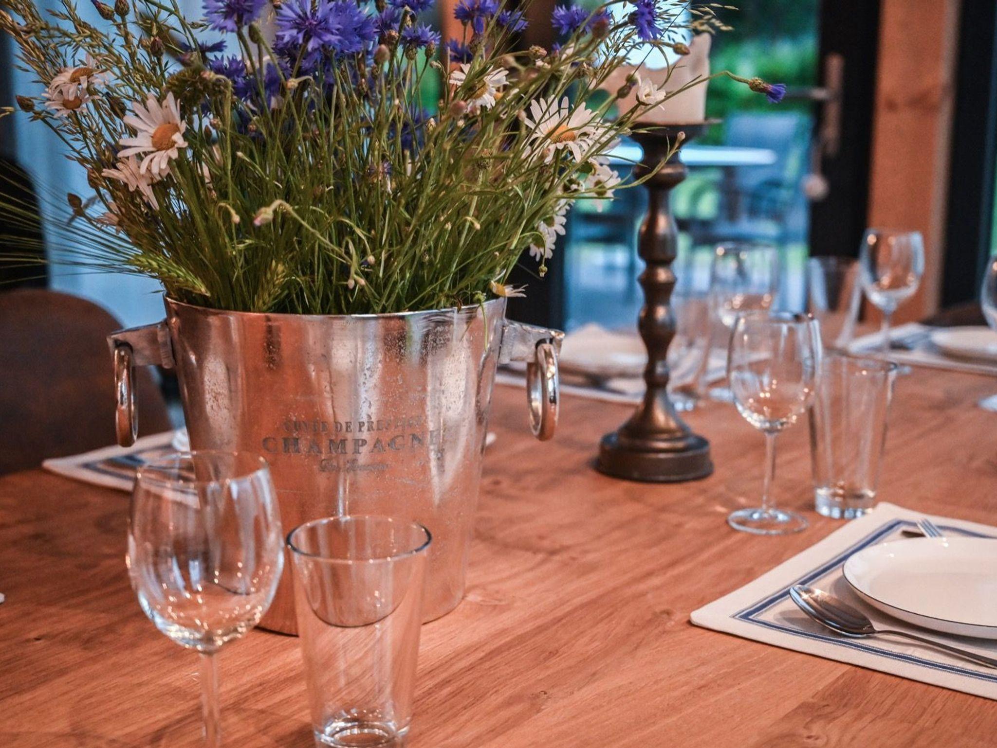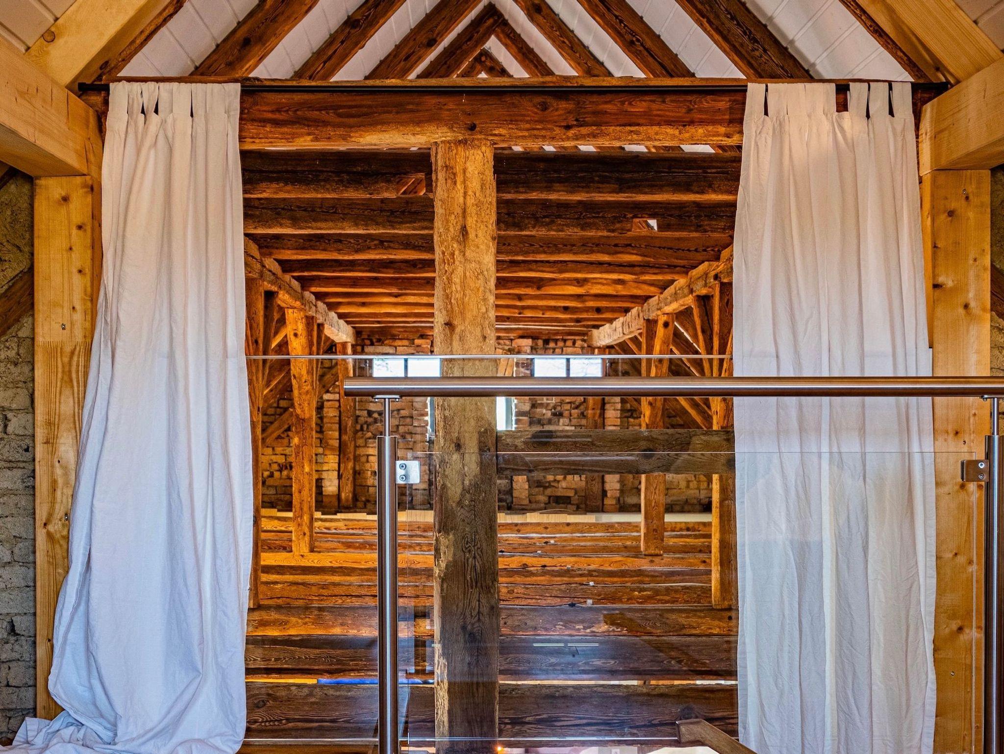 In einem Flügel des Dreiseitenhofes befinden sich ein großer Raum mit offenem Dachstuhl, eine voll ausgestattete Küche, ein lichtdurchfluteter Wintergarten und offene Galerie. Hier kann man wunderbar gemeinsame Zeit verbringen.