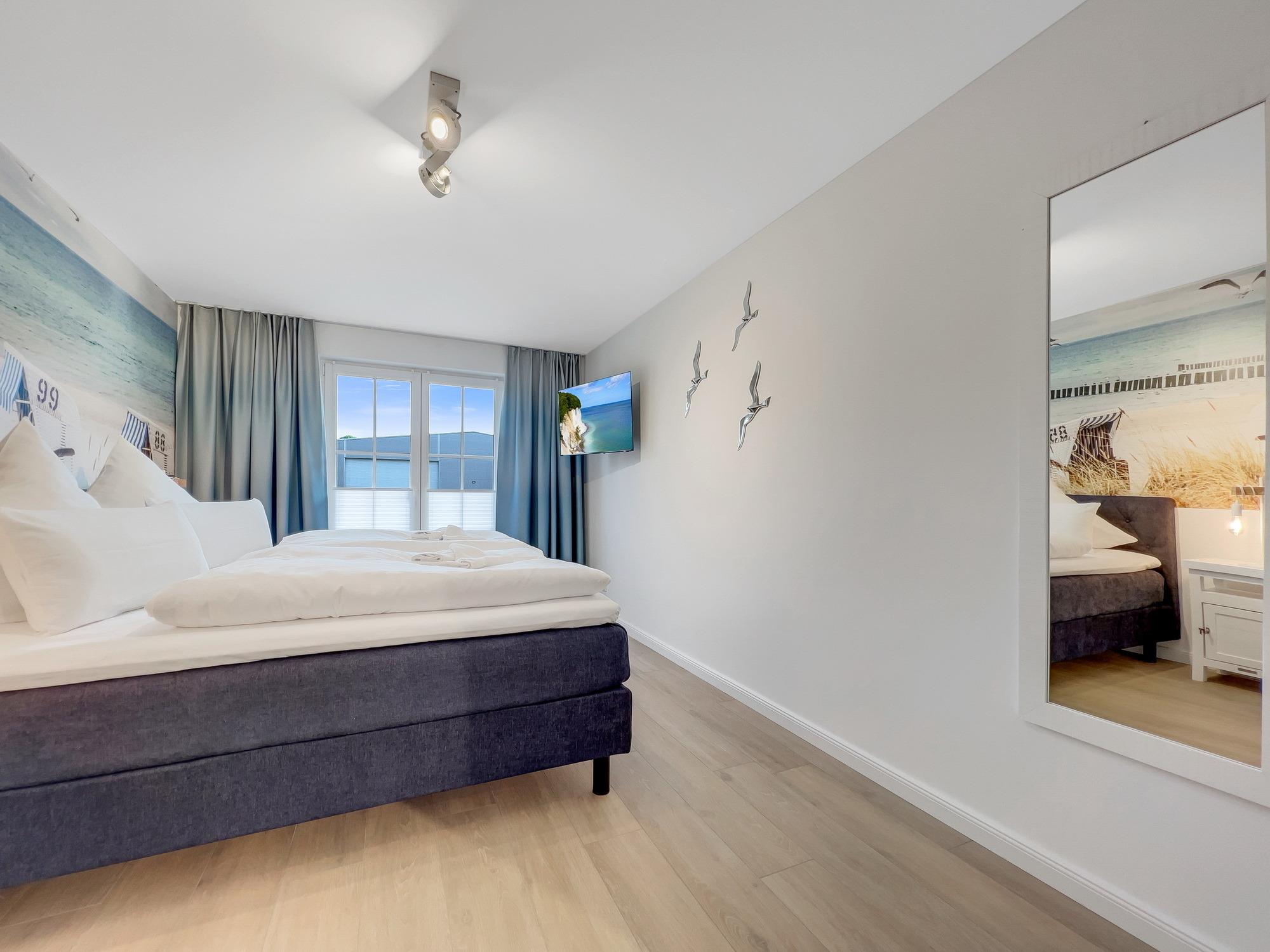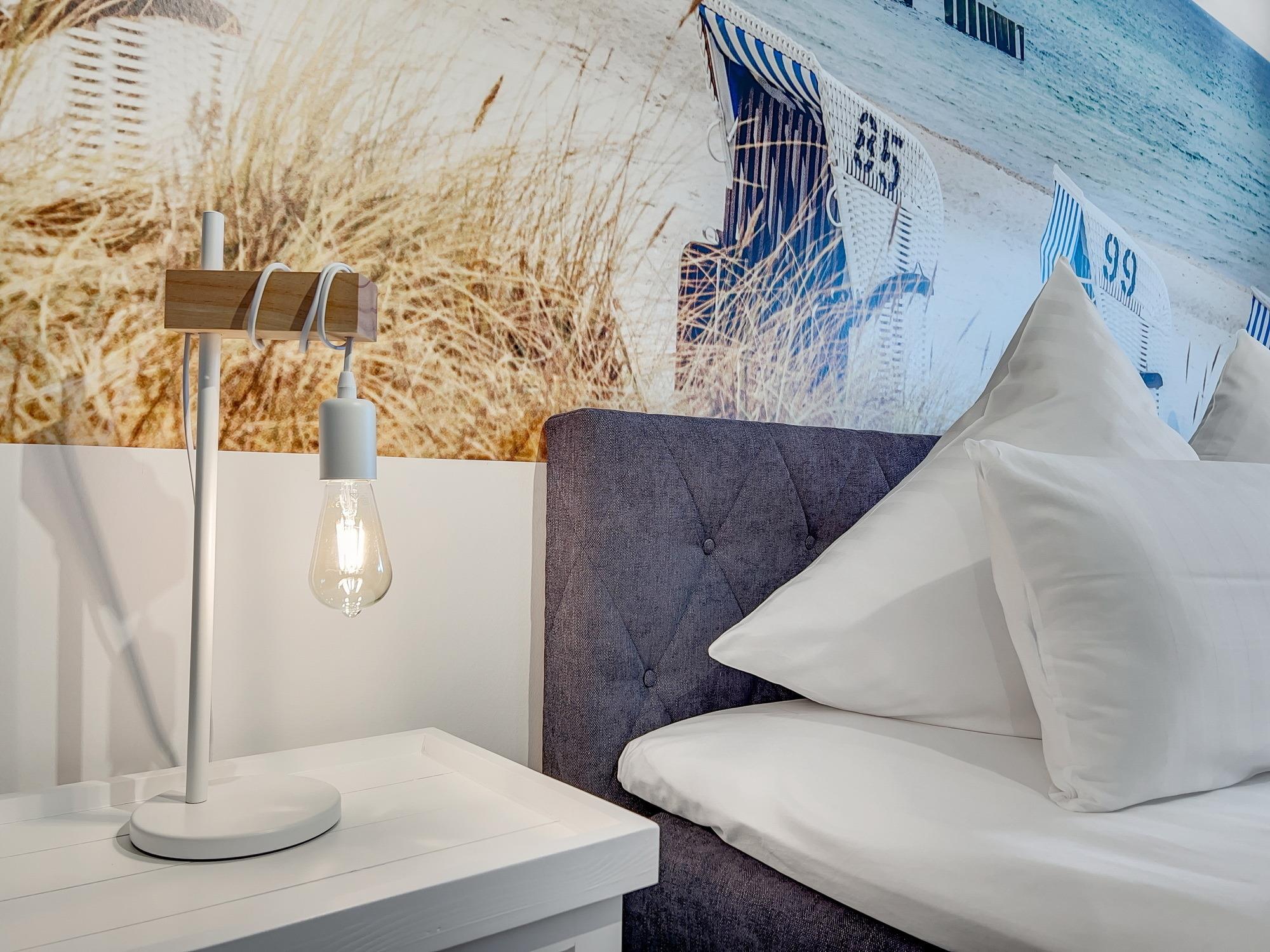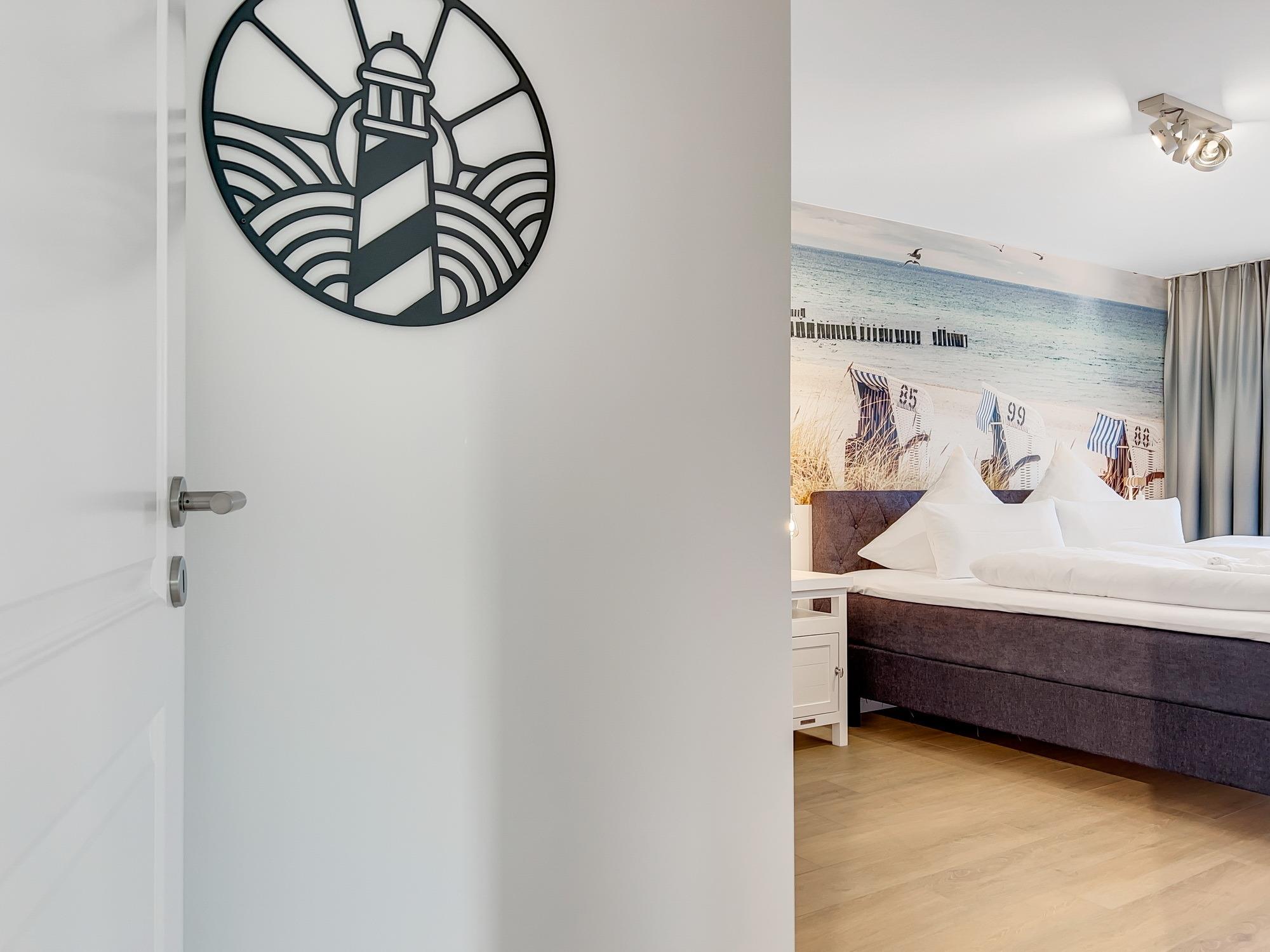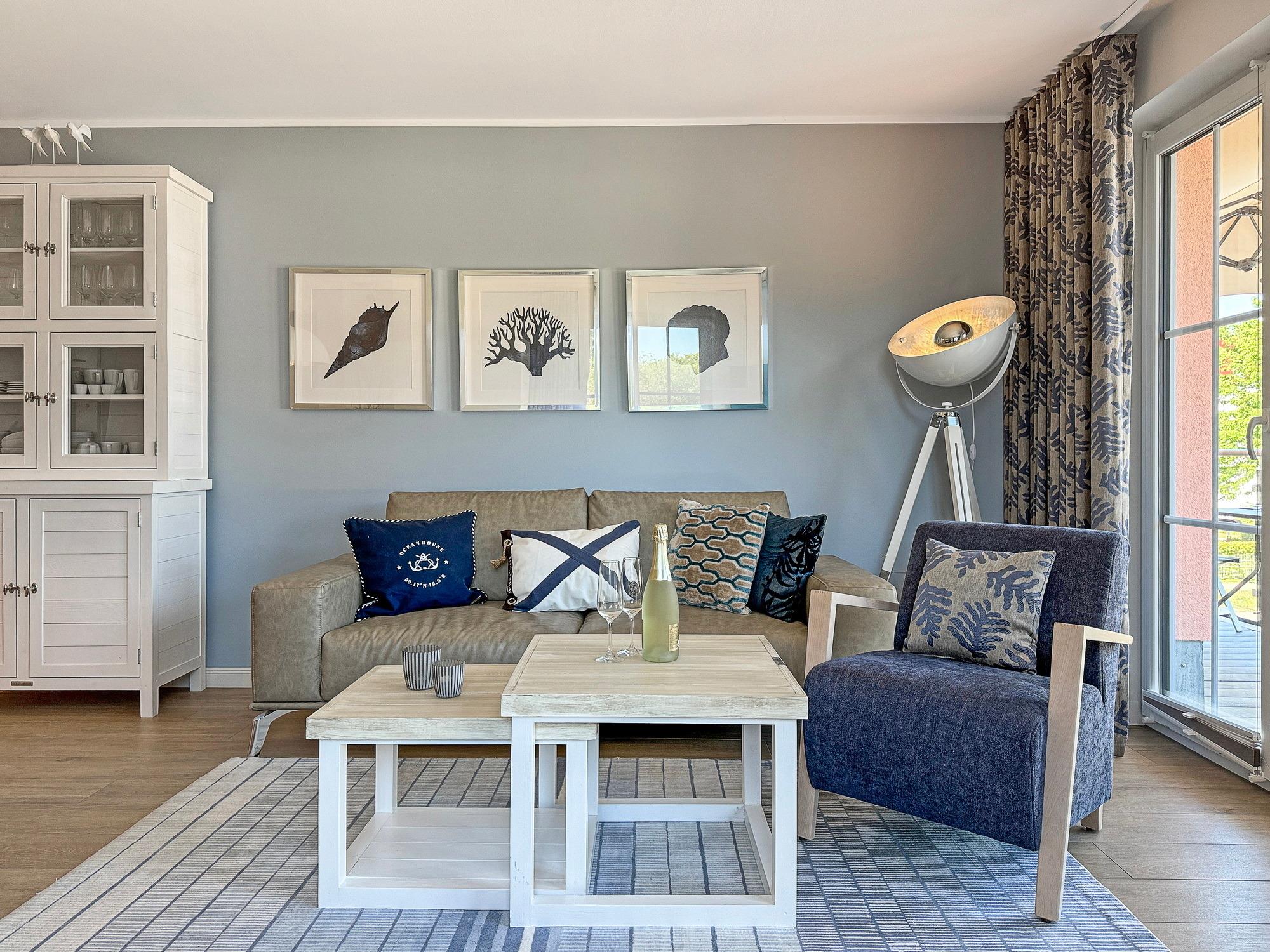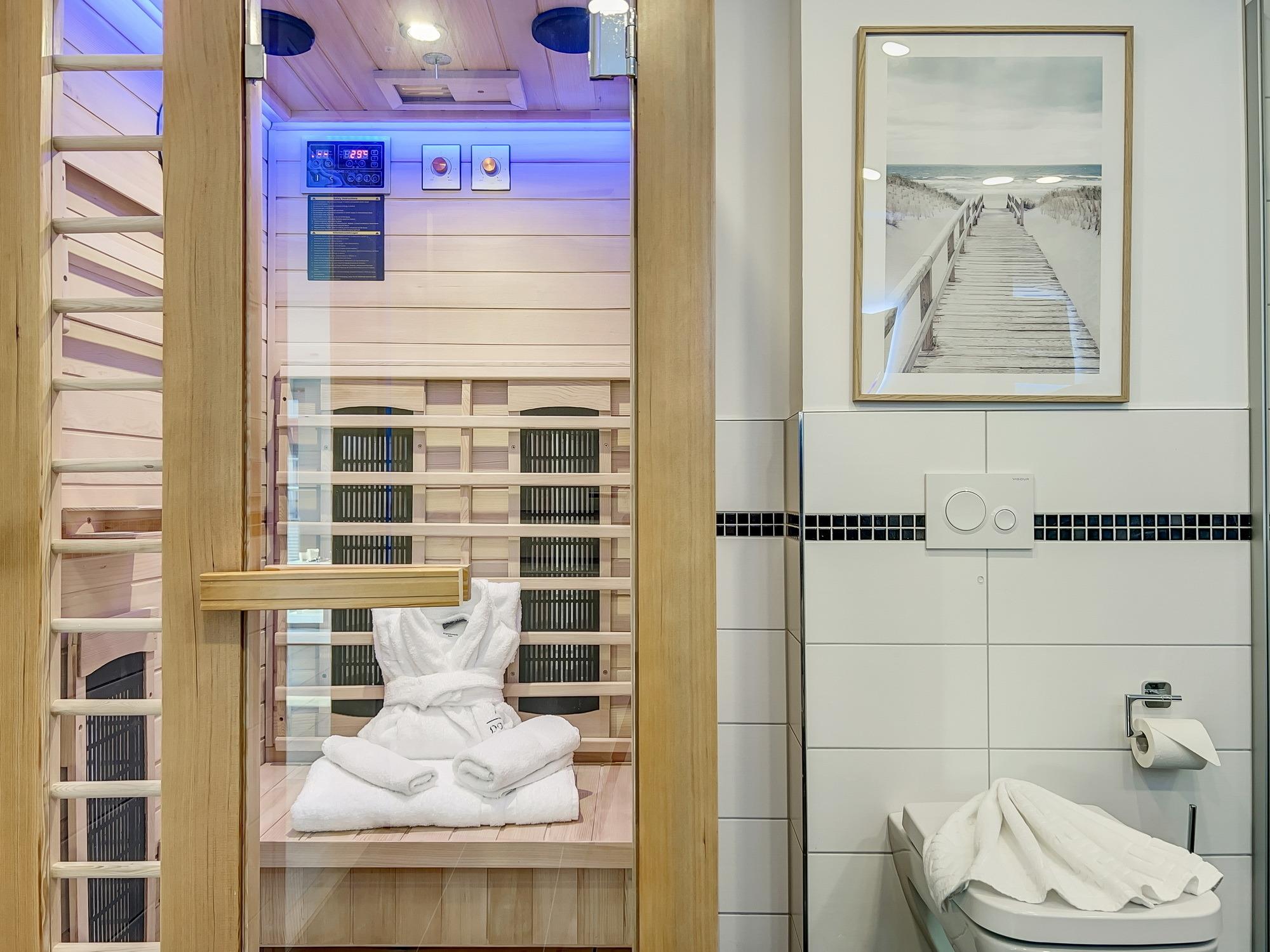Bequem per Aufzug erreichen Sie den Eingang Ihres 77 m2 großen Feriendomizils. In der Ferienwohnung angekommen, fühlen Sie sich direkt Willkommen. Helle, lichtdurchflutete Räume und eine moderne, luxuriöse Ausstattung im maritimen Design wirken edel und angenehm zugleich. Das 2022 fertiggestellte, barrierefreie Wohnensemble befindet sich nur 100 Meter vom frisch sanierten Hafen von Lauterbach, einem Ortsteil der "Rosenstadt Putbus". Lauterbach wurde 1816 von Fürst Wilhelm Malte zu Putbus als erstes Seebad Rügens gegründet und liegt direkt am Greifswalder Bodden im Südosten der Insel Rügen. Ihr Domizil hat einen schönen Balkon, der vom Wohnzimmer und vom Schlafzimmer aus zugänglich ist. Hier können Sie die milde Abendsonne genießen und den Tag ausklingen lassen. Die Wohnung verfügt zudem über eine kleine Infrarot-Sauna für gemütliche Abende, um nicht nur bei Schmuddelwetter zu entspannen. Modernes Smart-TV in Wohnzimmer, Schlafzimmer und Gäste-/Kinderzimmer ermöglichen Ihnen, mit Ihrem Account Serien und Filme bei Netflix, Amazon Prime, Sky und vielen anderen Anbietern zu sehen. Das schnelle WLAN garantiert Ihnen, mit der Welt in Kontakt zu bleiben – wenn Sie das möchten!