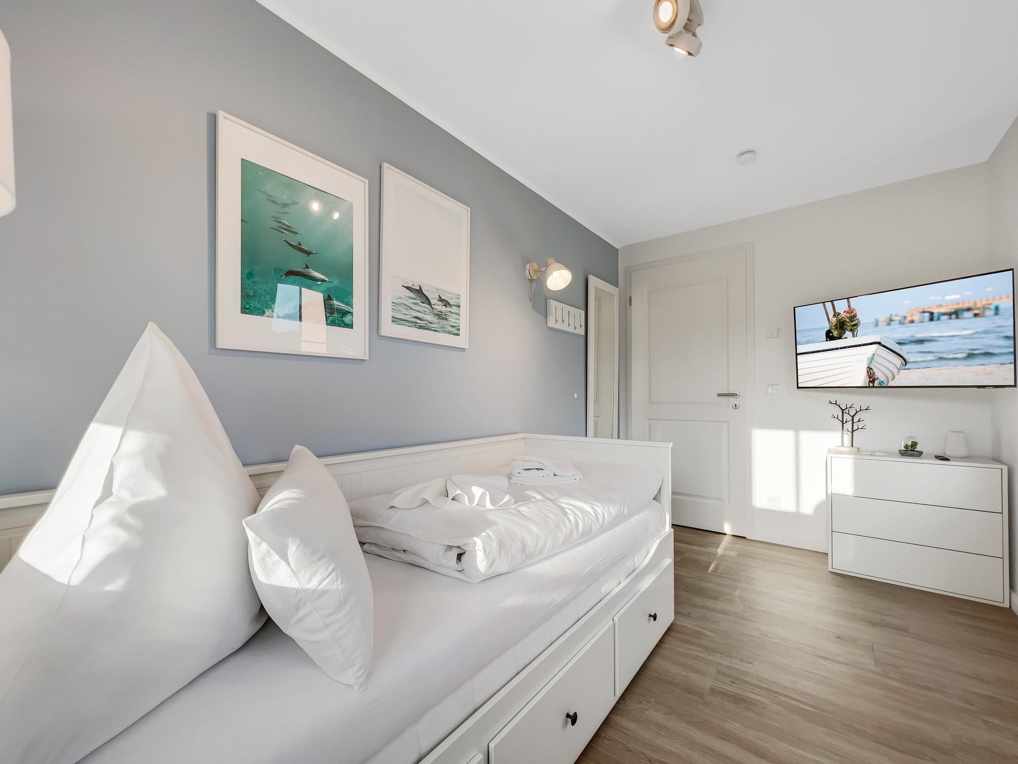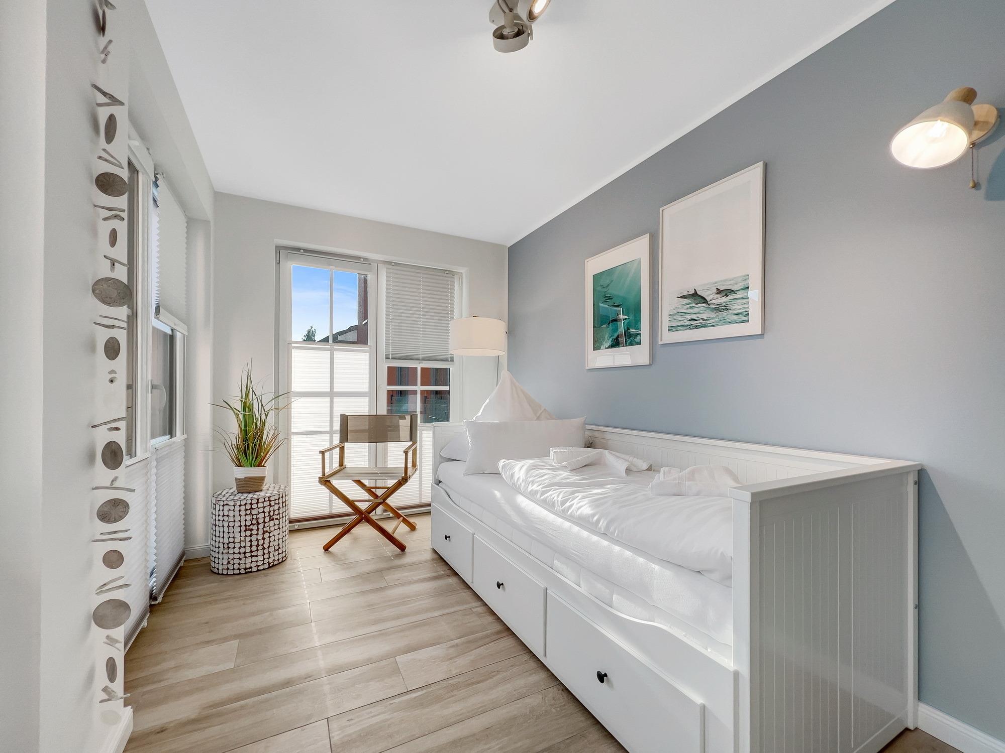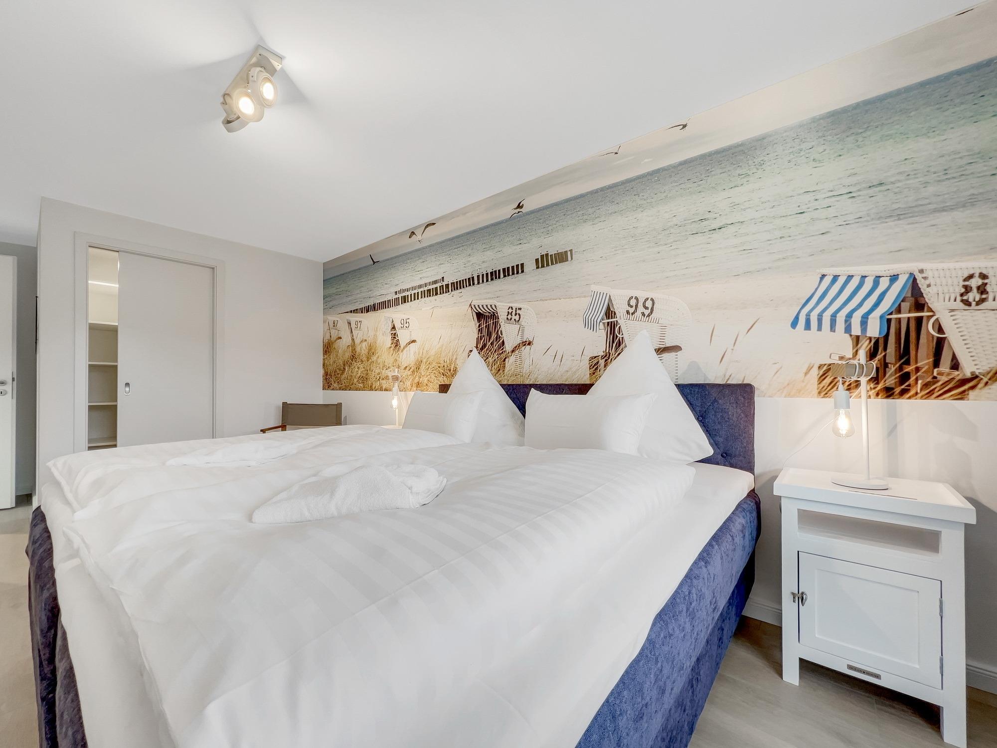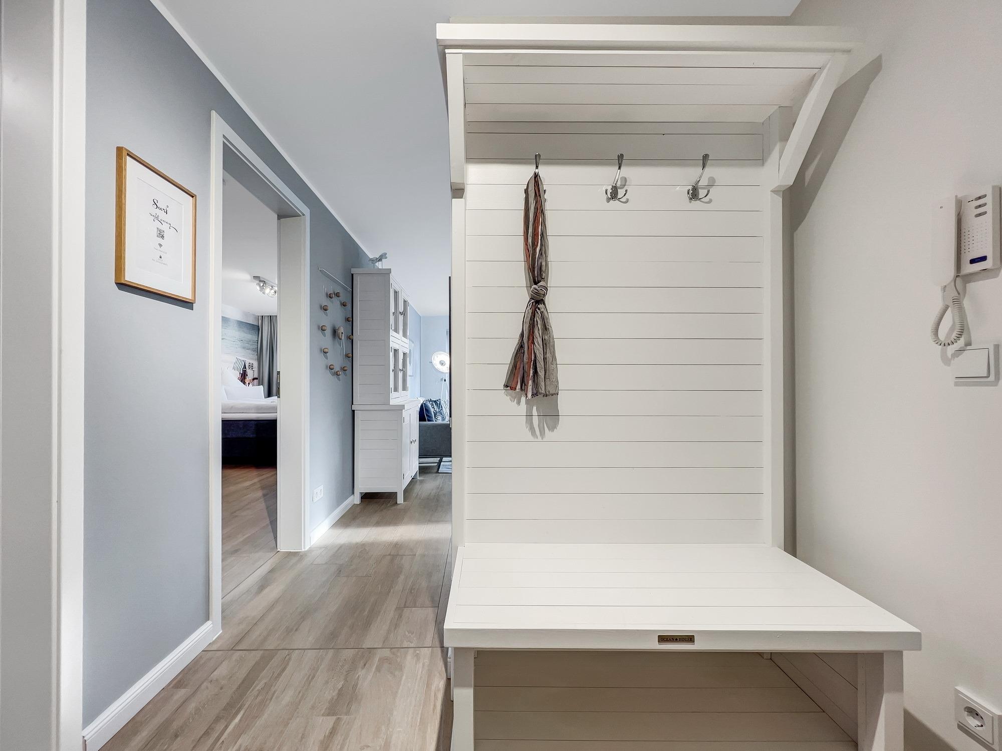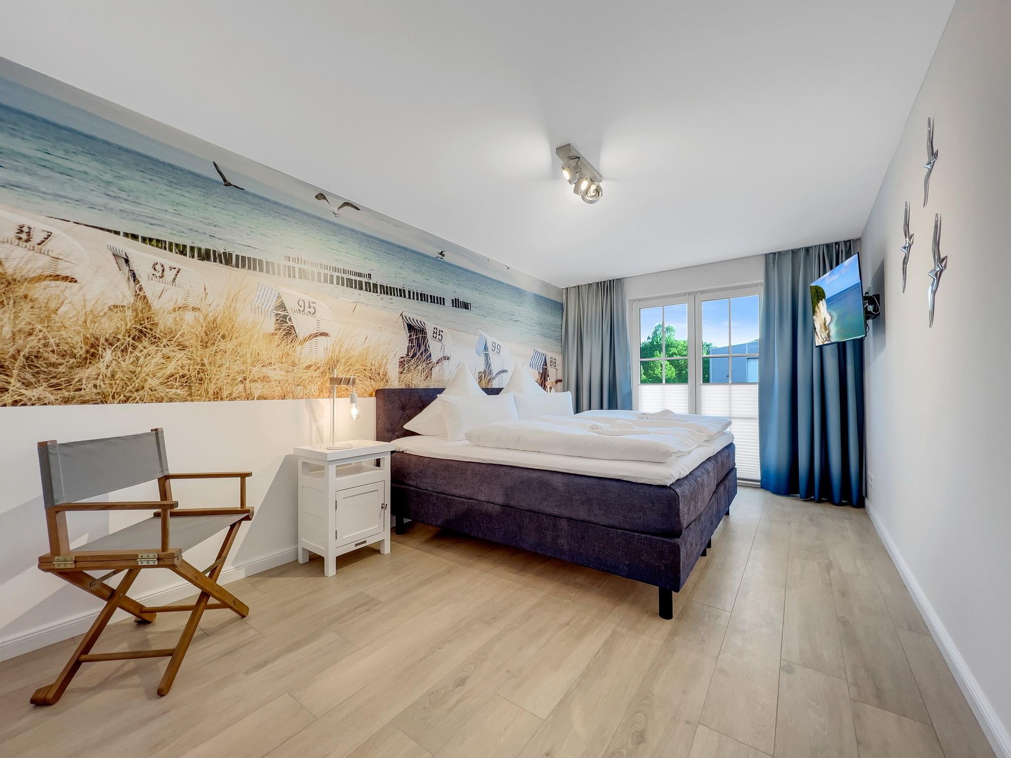 Bequem per Aufzug erreichen Sie den Eingang Ihres 77 m2 großen Feriendomizils. In der Ferienwohnung angekommen, fühlen Sie sich direkt Willkommen. Helle, lichtdurchflutete Räume und eine moderne, luxuriöse Ausstattung im maritimen Design wirken edel und angenehm zugleich. Das 2022 fertiggestellte, barrierefreie Wohnensemble befindet sich nur 100 Meter vom frisch sanierten Hafen von Lauterbach, einem Ortsteil der "Rosenstadt Putbus". Lauterbach wurde 1816 von Fürst Wilhelm Malte zu Putbus als erstes Seebad Rügens gegründet und liegt direkt am Greifswalder Bodden im Südosten der Insel Rügen. Ihr Domizil hat einen schönen Balkon, der vom Wohnzimmer und vom Schlafzimmer aus zugänglich ist. Hier können Sie die milde Abendsonne genießen und den Tag ausklingen lassen. Die Wohnung verfügt zudem über eine kleine Infrarot-Sauna für gemütliche Abende, um nicht nur bei Schmuddelwetter zu entspannen. Modernes Smart-TV in Wohnzimmer, Schlafzimmer und Gäste-/Kinderzimmer ermöglichen Ihnen, mit Ihrem Account Serien und Filme bei Netflix, Amazon Prime, Sky und vielen anderen Anbietern zu sehen. Das schnelle WLAN garantiert Ihnen, mit der Welt in Kontakt zu bleiben – wenn Sie das möchten!
