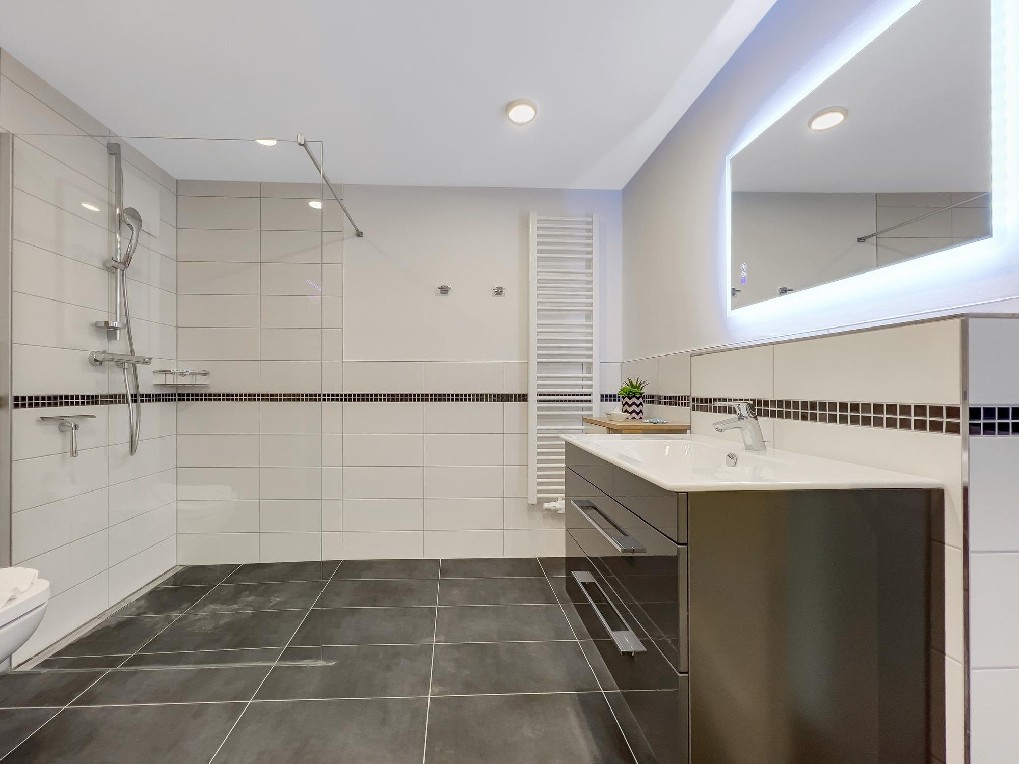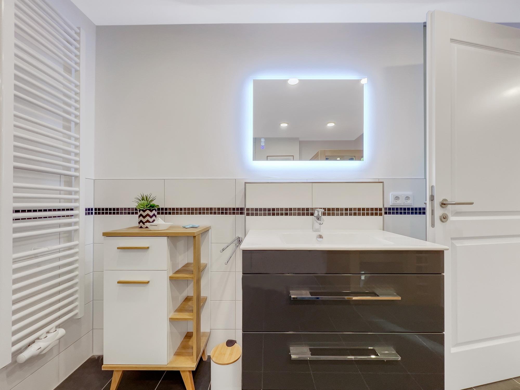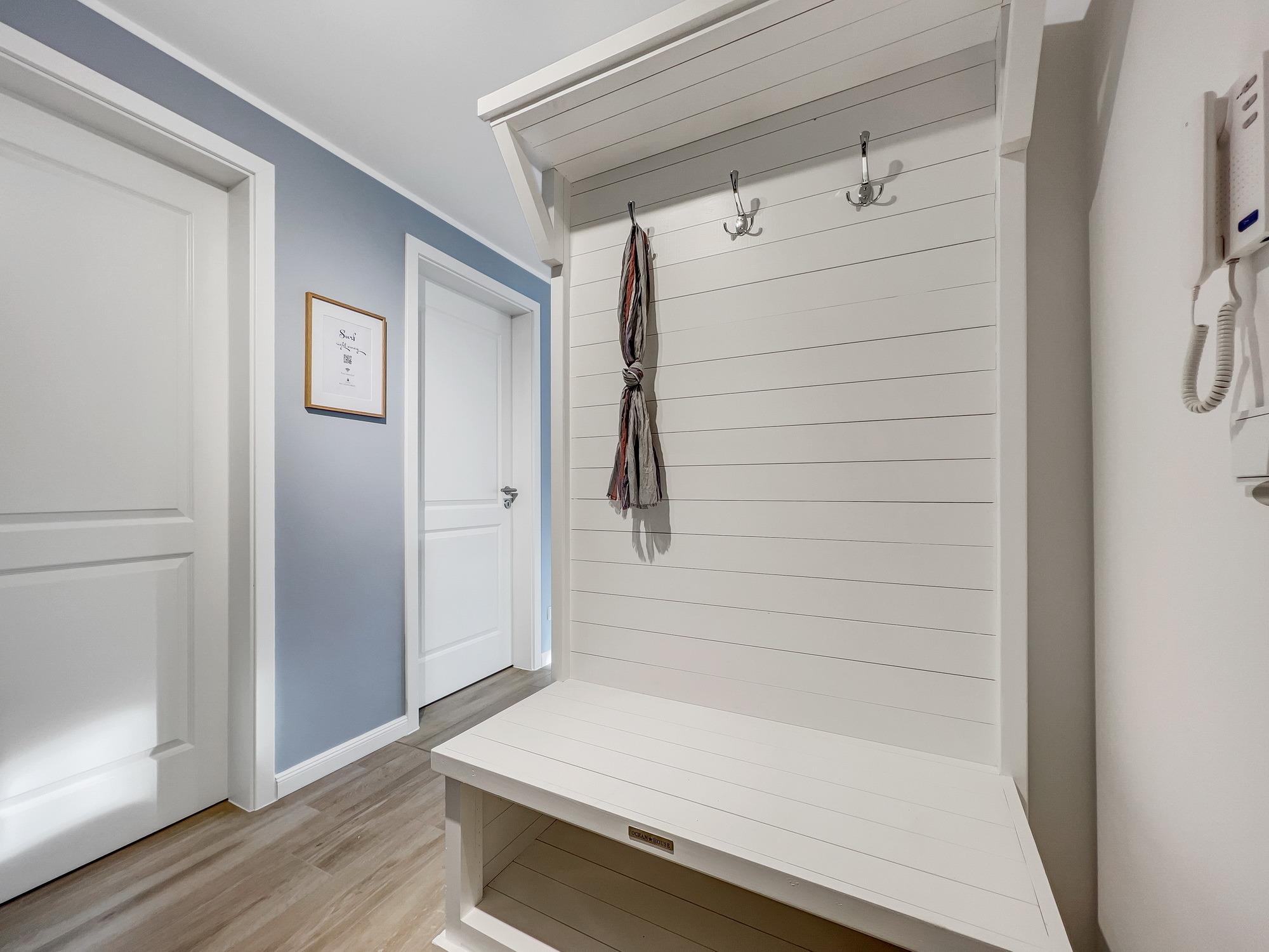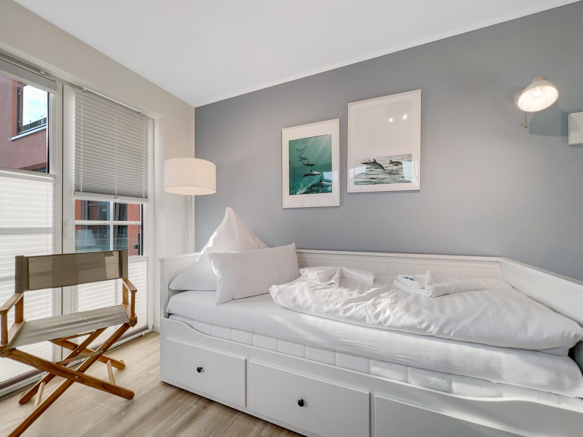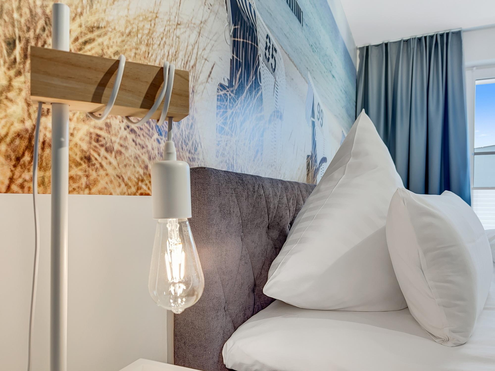 Bequem per Aufzug erreichen Sie den Eingang Ihres 77 m2 großen Feriendomizils. In der Ferienwohnung angekommen, fühlen Sie sich direkt Willkommen. Helle, lichtdurchflutete Räume und eine moderne, luxuriöse Ausstattung im maritimen Design wirken edel und angenehm zugleich. Das 2022 fertiggestellte, barrierefreie Wohnensemble befindet sich nur 100 Meter vom frisch sanierten Hafen von Lauterbach, einem Ortsteil der "Rosenstadt Putbus". Lauterbach wurde 1816 von Fürst Wilhelm Malte zu Putbus als erstes Seebad Rügens gegründet und liegt direkt am Greifswalder Bodden im Südosten der Insel Rügen. Ihr Domizil hat einen schönen Balkon, der vom Wohnzimmer und vom Schlafzimmer aus zugänglich ist. Hier können Sie die milde Abendsonne genießen und den Tag ausklingen lassen. Die Wohnung verfügt zudem über eine kleine Infrarot-Sauna für gemütliche Abende, um nicht nur bei Schmuddelwetter zu entspannen. Modernes Smart-TV in Wohnzimmer, Schlafzimmer und Gäste-/Kinderzimmer ermöglichen Ihnen, mit Ihrem Account Serien und Filme bei Netflix, Amazon Prime, Sky und vielen anderen Anbietern zu sehen. Das schnelle WLAN garantiert Ihnen, mit der Welt in Kontakt zu bleiben – wenn Sie das möchten!