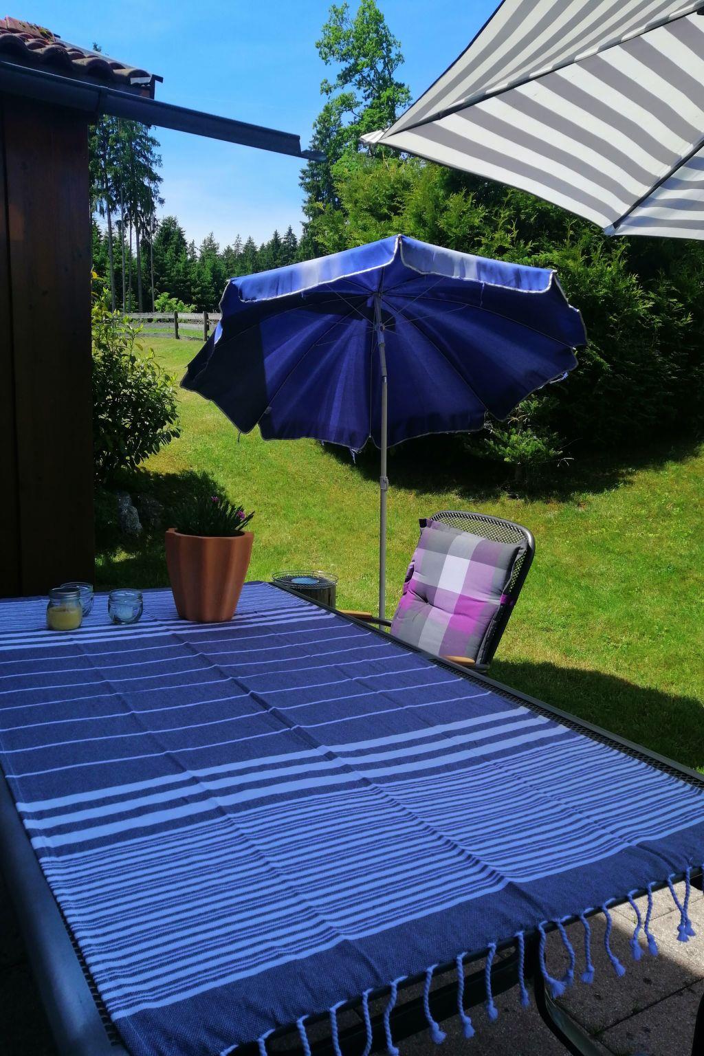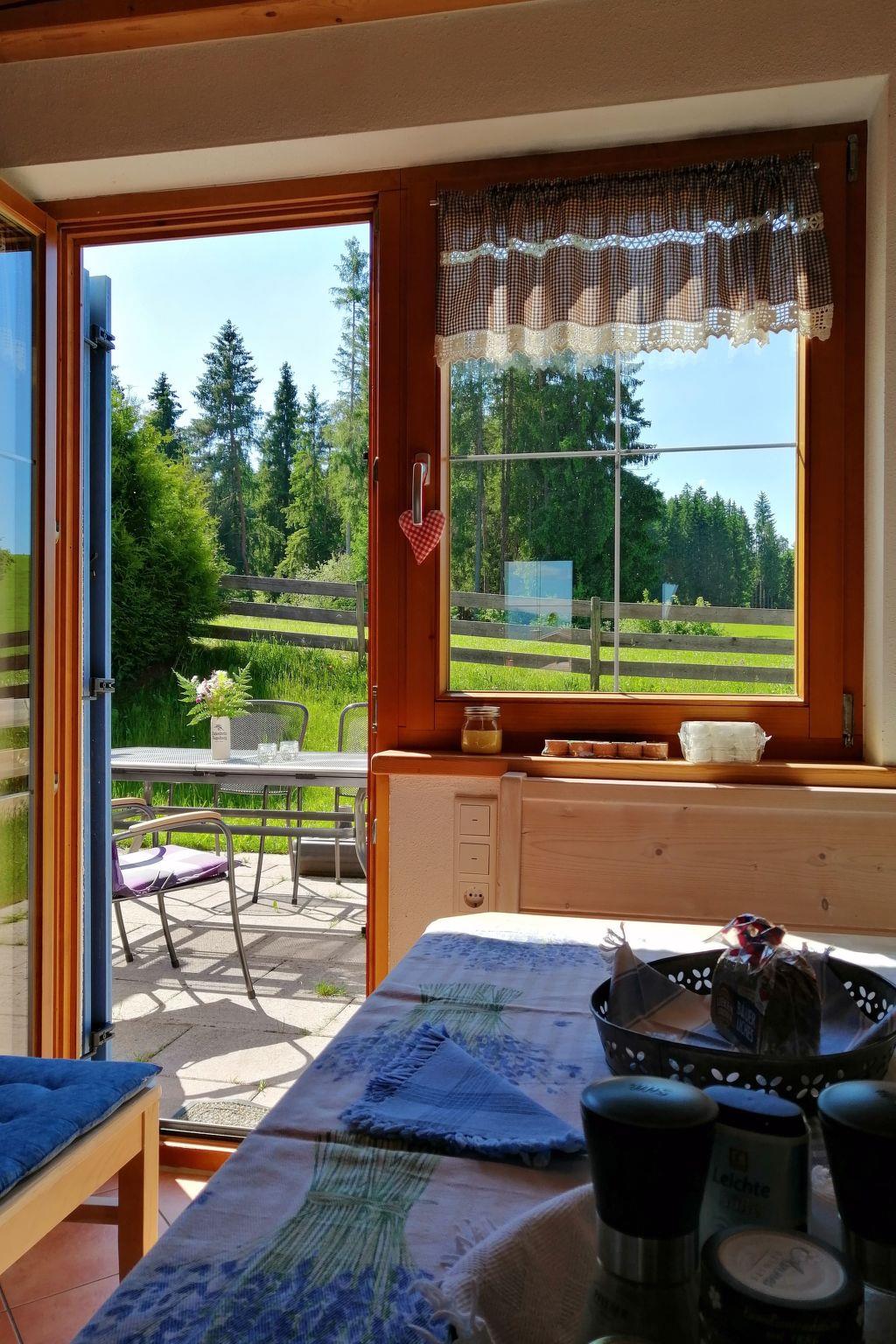 The alpine-style holiday home is a semi-detached house in a quiet location on the edge of the forest with a view of the Allgäu Alps and Lake Lechbruck.