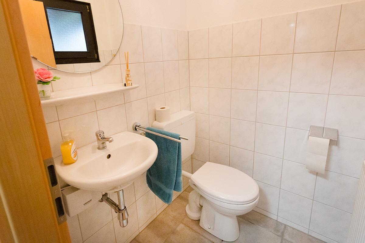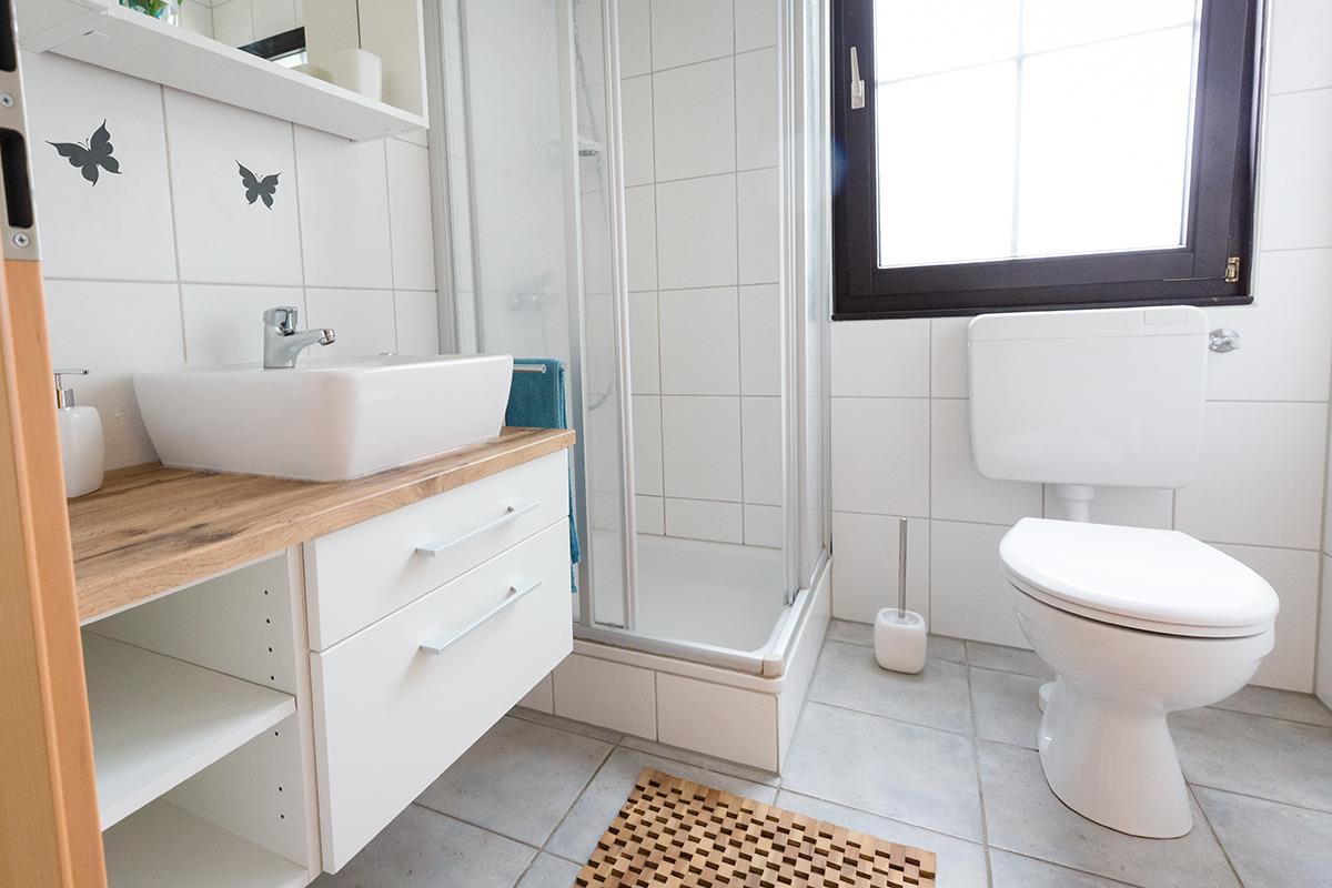 Dusche, WC, Waschtisch mit Spiegelschrank, Tageslichtbad