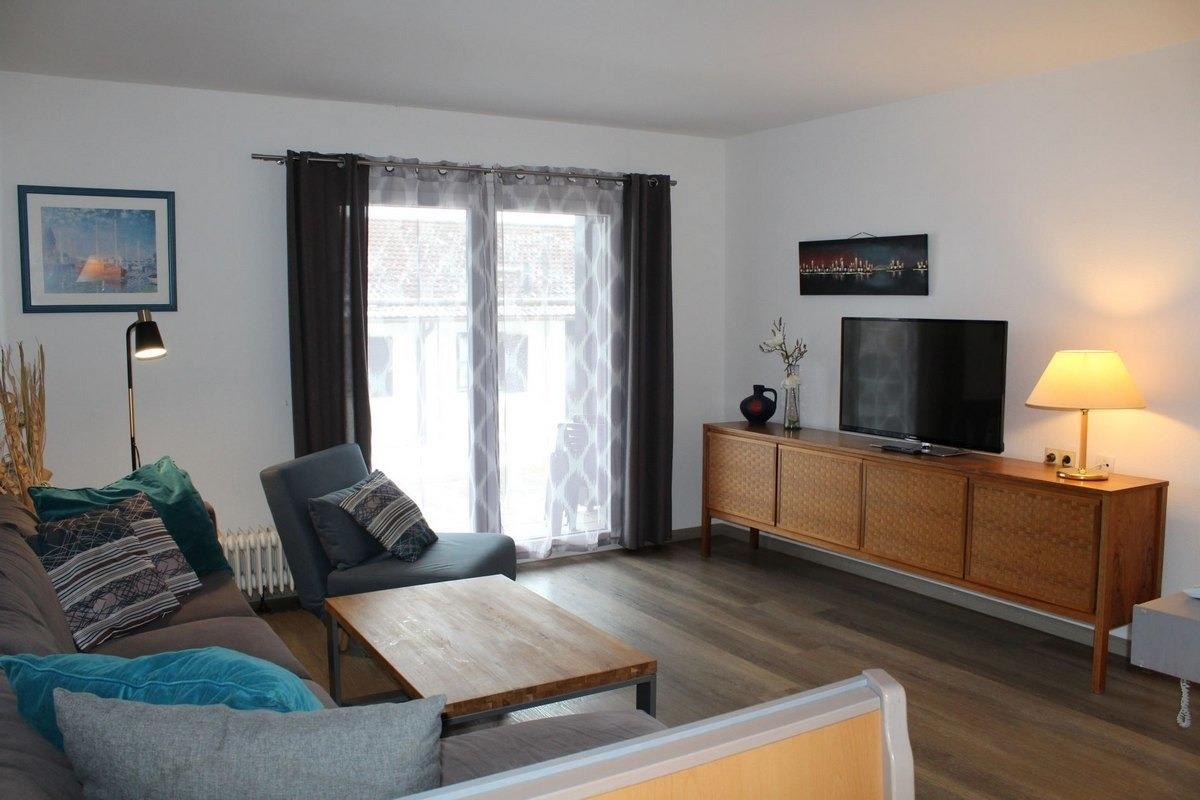 Das freundliche, helle Wohnzimmer lädt ein, sich wohl zu fühlen. Die gemütliche Eckcouch bietet Platz für alle Gäste. Ein Flachbild-Fernseher und Radio (Musikanlage) gehören ebenfalls zur Ausstattung dieses Hauses. Vom Wohnzimmer aus gelangen Sie direkt auf Ihre Terrasse. Auf der Terrasse ist Grillen erlaubt (bitte eigenen Grill mitbringen). Der direkt angrenzende Essbereich bietet Platz für Ihre gemeinsamen Mahlzeiten und gemütliche Abende.