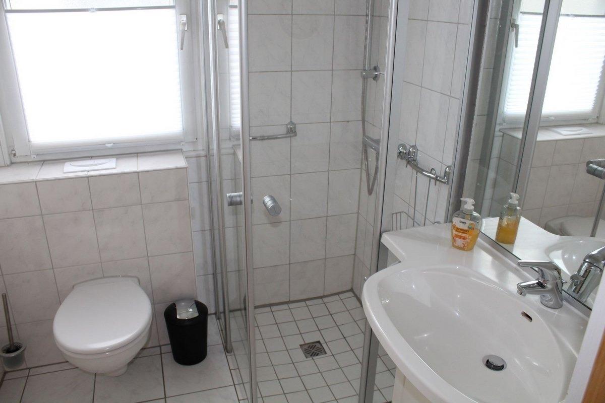 Dusche/WC mit Fenster. Die Duschkabine ist eben begehbar.