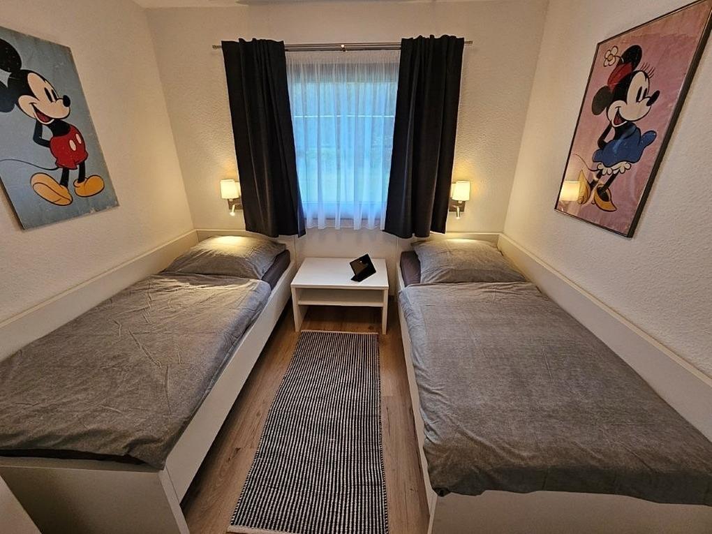 Es gibt gibt zwei getrennte Schlafzimmer: Das Elternschlafzimmer mit einem Doppelbett und ein Kinderzimmer mit zwei Einzelbetten. Das Badezimmer mit Dusche und WC ist ebenfalls komplett neu saniert.