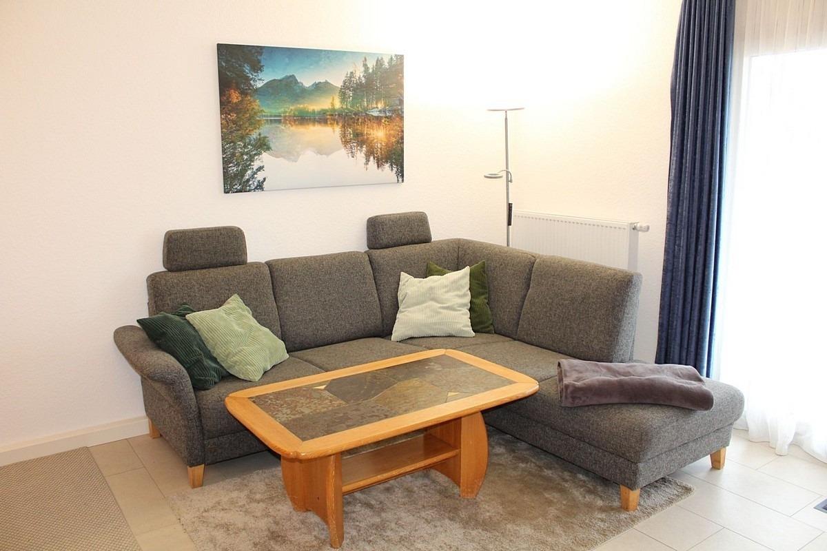 Wohn- Esszimmer: Polstersitzgruppe mit Schlafcouch, Essgruppe, TV, Radio, Telefon, WLAN-Internetanschluss