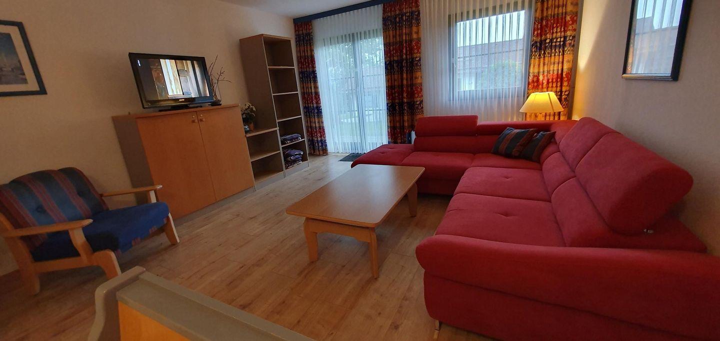 Die Ferienwohnung verfügt über drei komfortable Schlafzimmer, eines mit Doppelbett, zwei mit je zwei Einzelbetten, in denen bis zu sechs Personen einen erholsamen Schlaf finden. Der Laminatboden sorgt für ein modernes Ambiente und die vollständige Ausstattung macht Aufenthalt komfortabel. Die offene Wohnküche lädt zu geselligen Kochabenden ein und bietet alle Küchenutensilien, die Sie benötigen, um leckere Mahlzeiten zuzubereiten. Genießen Sie das gemeinsame Essen im Essbereich oder auf der einladenden Terrasse, während Sie den Blick in den Garten genießen.